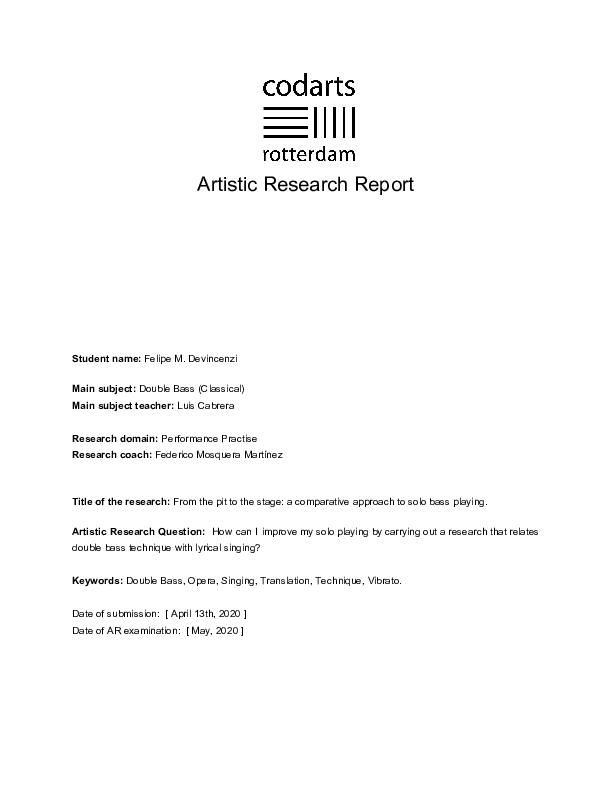 This research attempts to translate technical skills and notions from lyrical singing to double bass playing. Based on the Donizetti-Bottesini partnership, the idea was highly influenced by translation concepts developed by theorists Ricardo Piglia and Walter Benjamin. Research strategies include expert feedback, side by side work with tenors, experimental practice and extensive recording analysis on selected repertoire. Together, they outline a basic strategy that enriches solo performance. Conclusions could be applied to any similar repertoire by any other performer who reads this report.