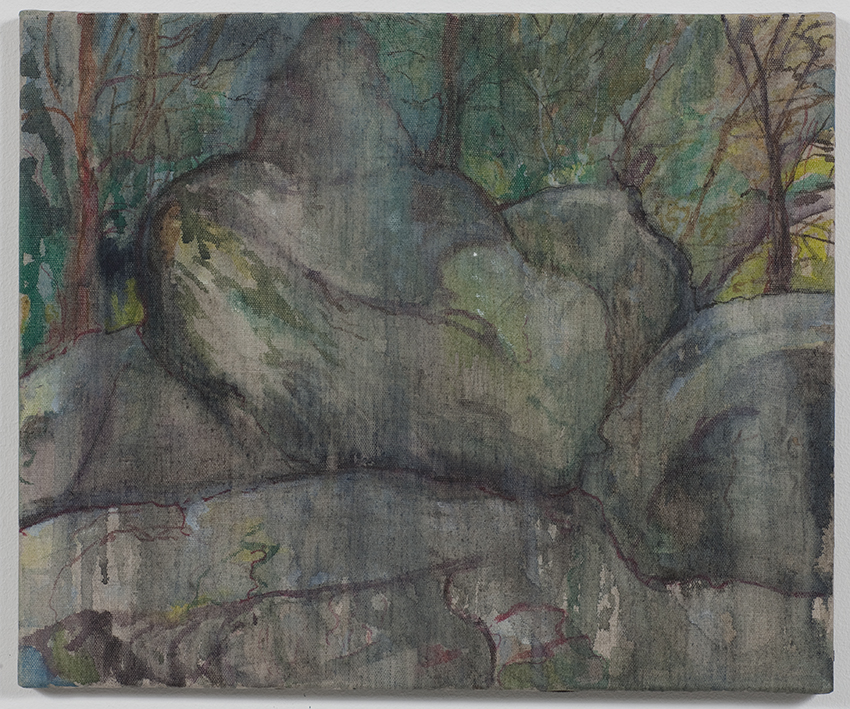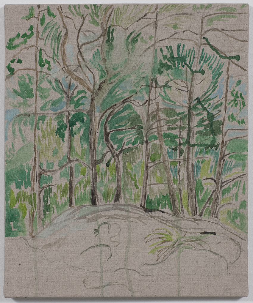 In the fall of 2010, I had the opportunity to go on a day excursion to the Fontainebleau forest to paint. Having done color experiments in Iceland, I did follow-up investigations on the question of light. Like the plein air painters of the nineteenth century, I decided to bring two raw linen canvases with me; one for morning and one for evening light. Repeating this over hundred year old gesture set a fixed focus for the work, but the result was opposite of what I had expected. Part of the reason was that it was a spur of the moment thing, and I had only brought watercolor. To my surprise the painting made in the early morning turned out dark, while the evening one was light. At Ringsveen I painted mostly outside in the fall and the wintertime. Now it was late summer and the trees were full of leaves, which produced more dramatic changes in the light situation. With the bright morning light, the painting had to be darker for me to physically see it. Using watercolor I could not reverse the process, it would only go darker.