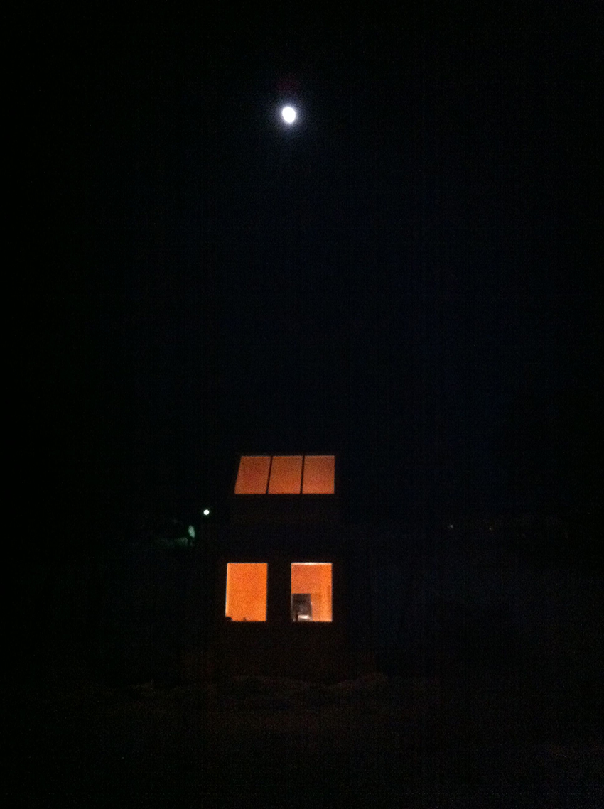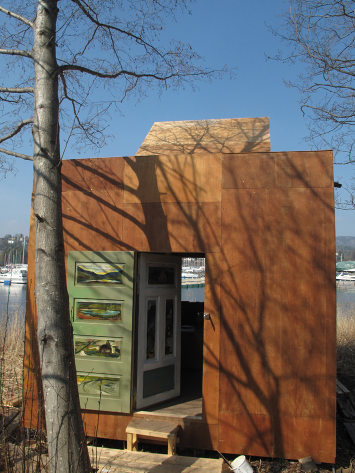 When I returned to Oslo in the fall of 2010, I learned that Handelsbygningen was in the process of being sold. It would later become clear that the Academy would be forced to renounce their studios due to a minority position in the stock company that owned the building. With the pending sale, I approached architect Todd Saunders with the idea of building a mobile outdoor studio based on the interior dimensions of my studio in Oslo. Saunders recommended that I contact Mats Odin Røstøy (Mor & Mar Architects), a Norwegian carpenter and architect who had been working with him on earlier projects. This proved a good match. At the beginning of the New Year we started building Winterstudio in sandwich modules of plywood and polystyrene at the Academy in Oslo. This would make the studio insulated and each piece light enough to carry. The studio was first shown at Henie Onstad Art Centre at Høvikodden outside Oslo. Here it stayed for approximately three months before it was moved to Jeløya as part of my participation in the 6th Momentum Biennial.