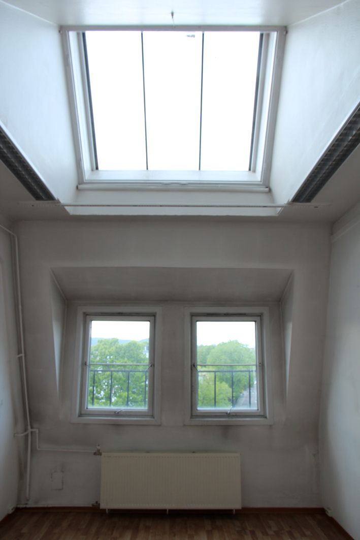 As part of the fellowship, the Academy had given me room 611 in Handelsbygningen as a work space. The building is centrally located in Oslo, facing the Nobel Institute and the American Embassy. It felt in many ways like an archetypical loft studio space; an elongated room with a door, two windows and a skylight facing the north. The studio measured 3,6 m across, approximately 6 m from the door to the windows and 5,5 m from the floor up to the top of the skylight. This was one of ten studios that the Academy acquired in 1919 through private donations. In 1930, the school moved into the new and more spacious studios at Kunstnernes Hus.(4] The studios in Handelsbygningen were then gradually converted into working spaces for graduate students.
