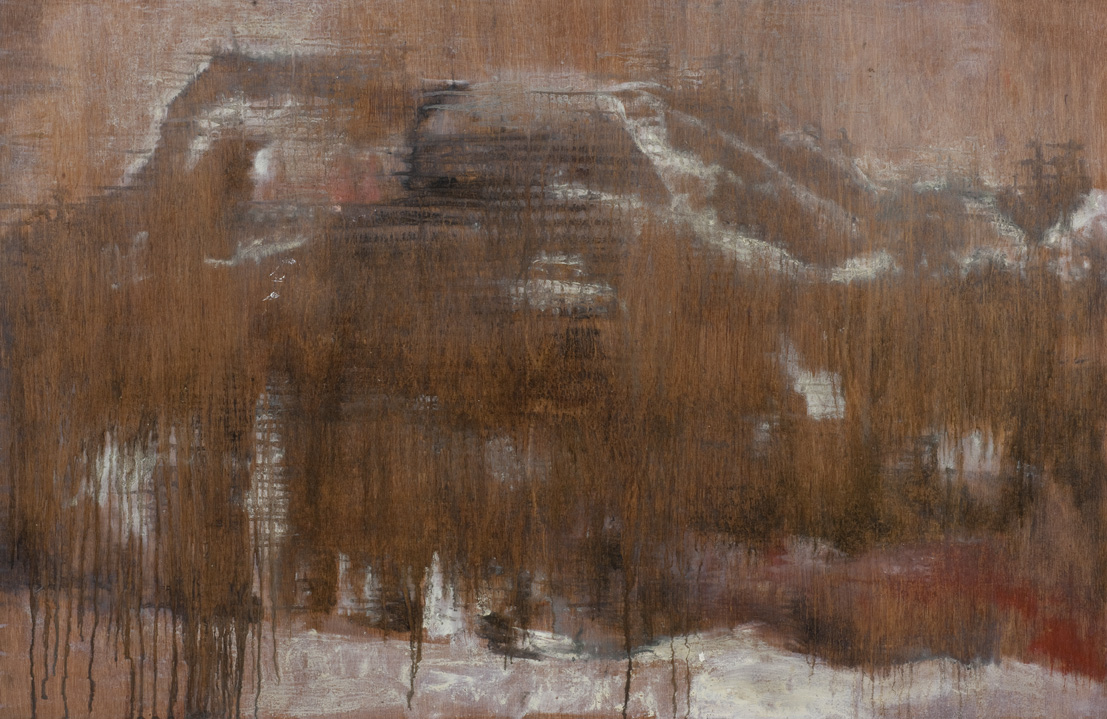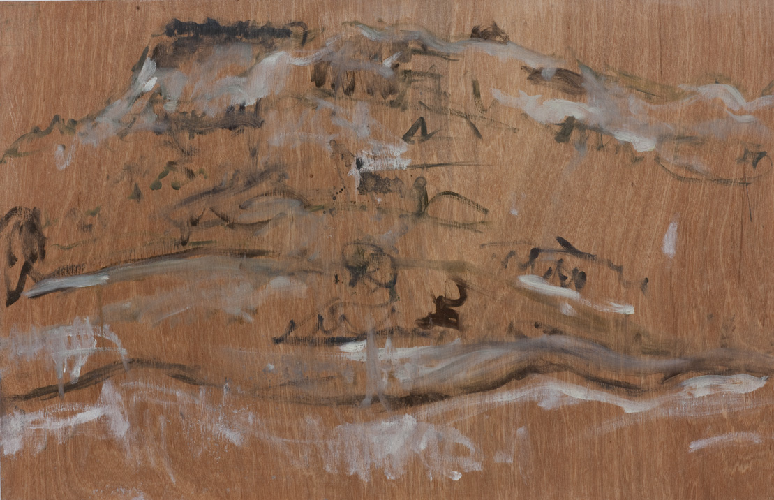 These are three of eight panels of Kolsås painted from the same location on different days under varying weather conditions. In all the paintings I used more or less the same framing, letting the mountain ridge follow the top of the canvas. The colors were limited to a palette of mostly black ochre and Prussian blue. Due to limited time, the paintings were executed quite fast which gave them a rough unfinished look. In many cases much of the panel is left untouched, making the color of the wood a primary ground color in the painting. The paintings were made using different types of opacities and thickness of paint, visible in the different types of brushstrokes used to indicate transitions between trees, snow, fog and ice in cold weather under a blue sky to grey days with snow and rain.
