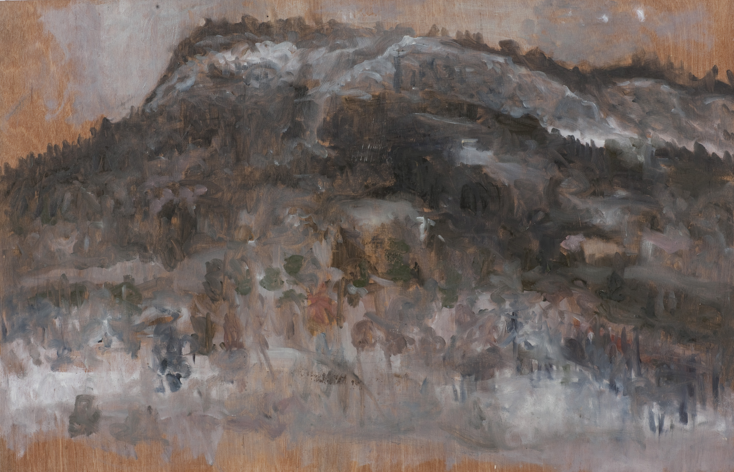 These are three of eight panels of Kolsås painted from the same location on different days under varying weather conditions. In all the paintings I used more or less the same framing, letting the mountain ridge follow the top of the canvas. The colors were limited to a palette of mostly black ochre and Prussian blue. Due to limited time, the paintings were executed quite fast which gave them a rough unfinished look. In many cases much of the panel is left untouched, making the color of the wood a primary ground color in the painting. The paintings were made using different types of opacities and thickness of paint, visible in the different types of brushstrokes used to indicate transitions between trees, snow, fog and ice in cold weather under a blue sky to grey days with snow and rain.