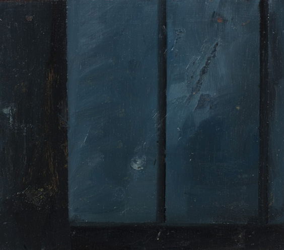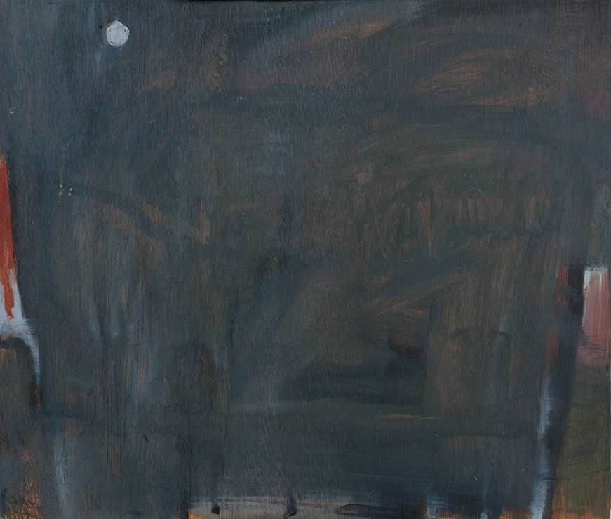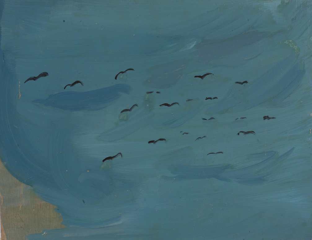 The observation of birds returning for summer was a point of departure for Sign of Spring. The painting was made from memory inside. The sweeping gestures made with large brushstrokes in the sky move in opposite direction of smaller black marks used to indicate birds. Some of the board is left exposed to give a sense of movement to the painting, as if the subject was not properly framed within its borders. In other paintings made from direct observation, such as Skylight, I observed the sky from within the studio and the architecture itself served as a framing device, which made the painting more self-contained.