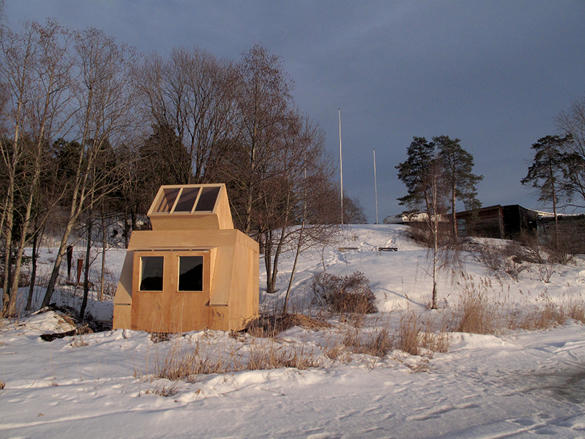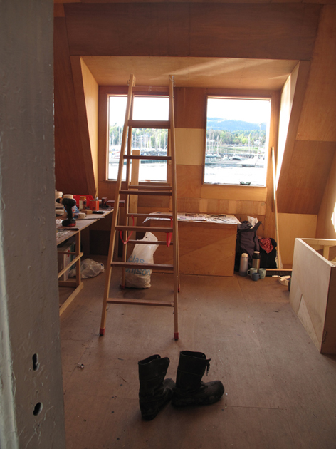 From Høvikodden, although more distant, there is a direct view towards Kolsås in the North. In placing Winterstudio in the same direction, I thought it would also become the main subject of my own work. I soon discovered this was not the case. When I painted with the students at the foot of the mountain, its presence was unavoidable. We captured the undulating form of the mountain from the side rather than head on as Monet had situated himself. At Høvikodden, the fact that the mountain was further away and the use of smaller boards made Kolsås function more as a backdrop. Furthermore, the vertical view of the mountain felt fragmented, cut horizontally by the highway and the boatyard, which highlighted selected details in the landscape. In working out new paintings, my interest gradually turned towards observing the changes taking place on the water in front of me: boats in the boatyard across the bay, the appearance of the full moon and the melting ice.