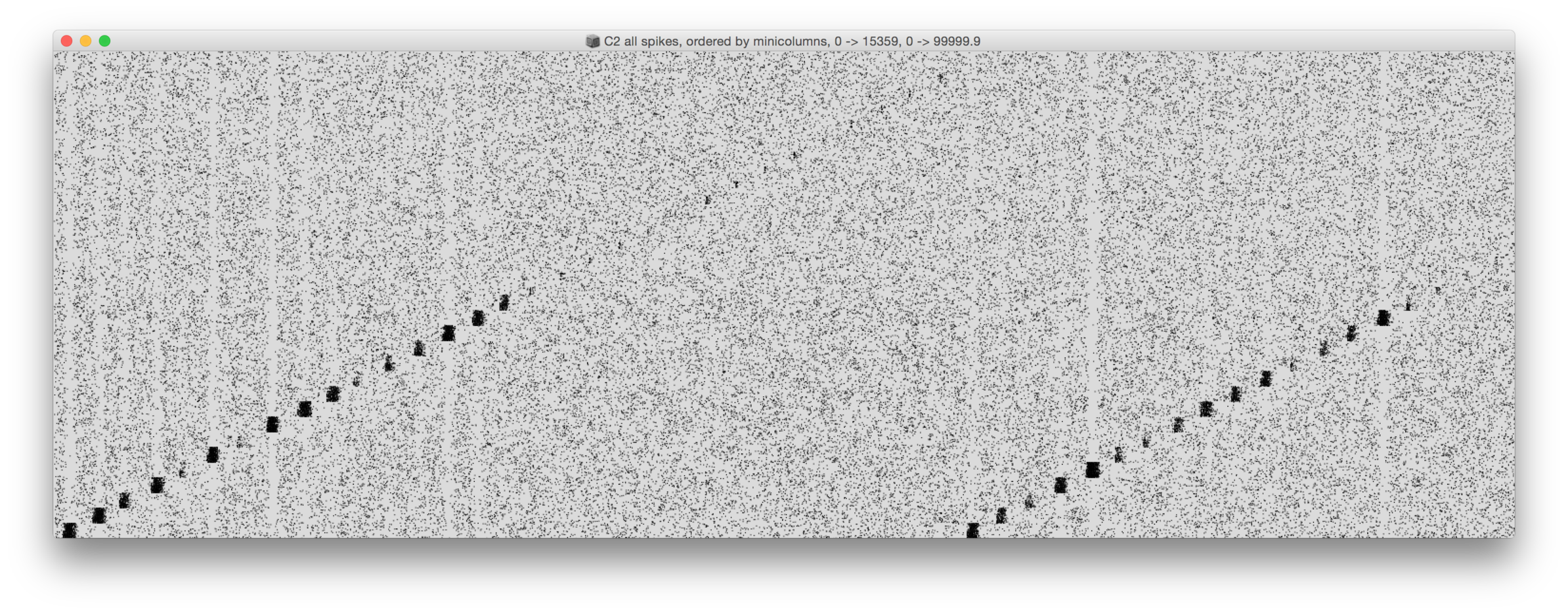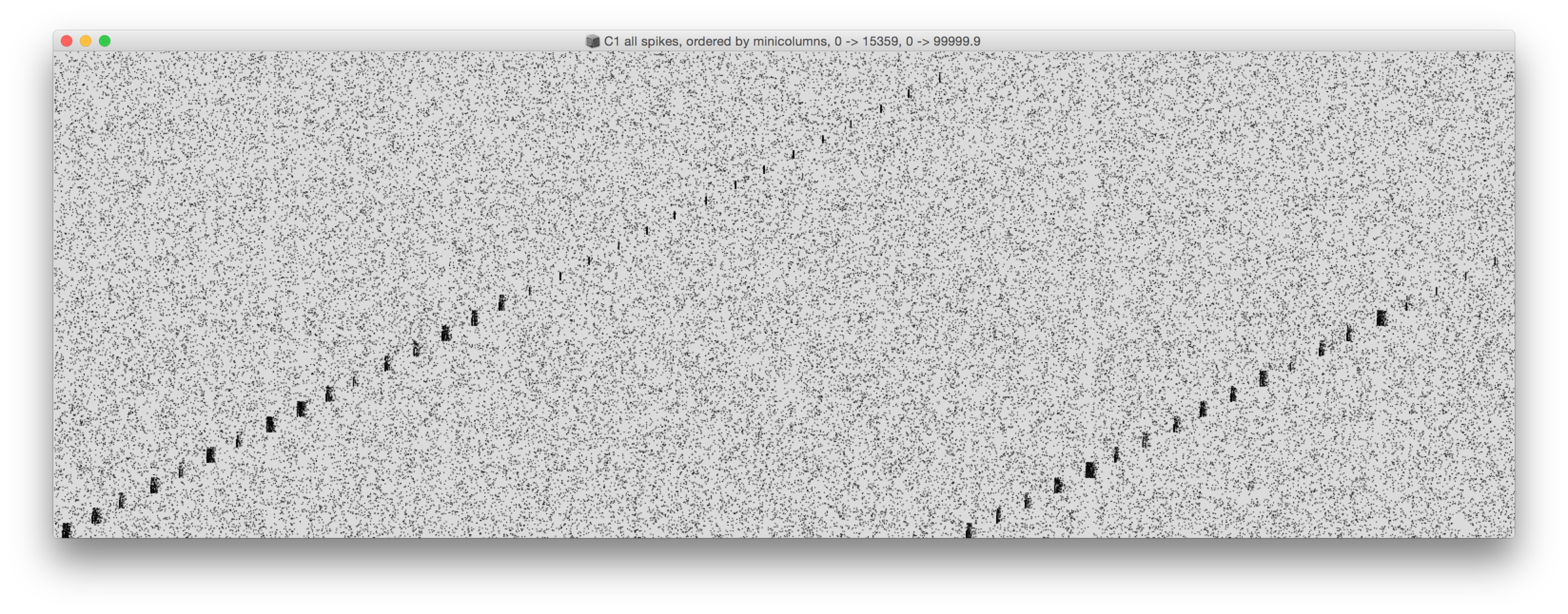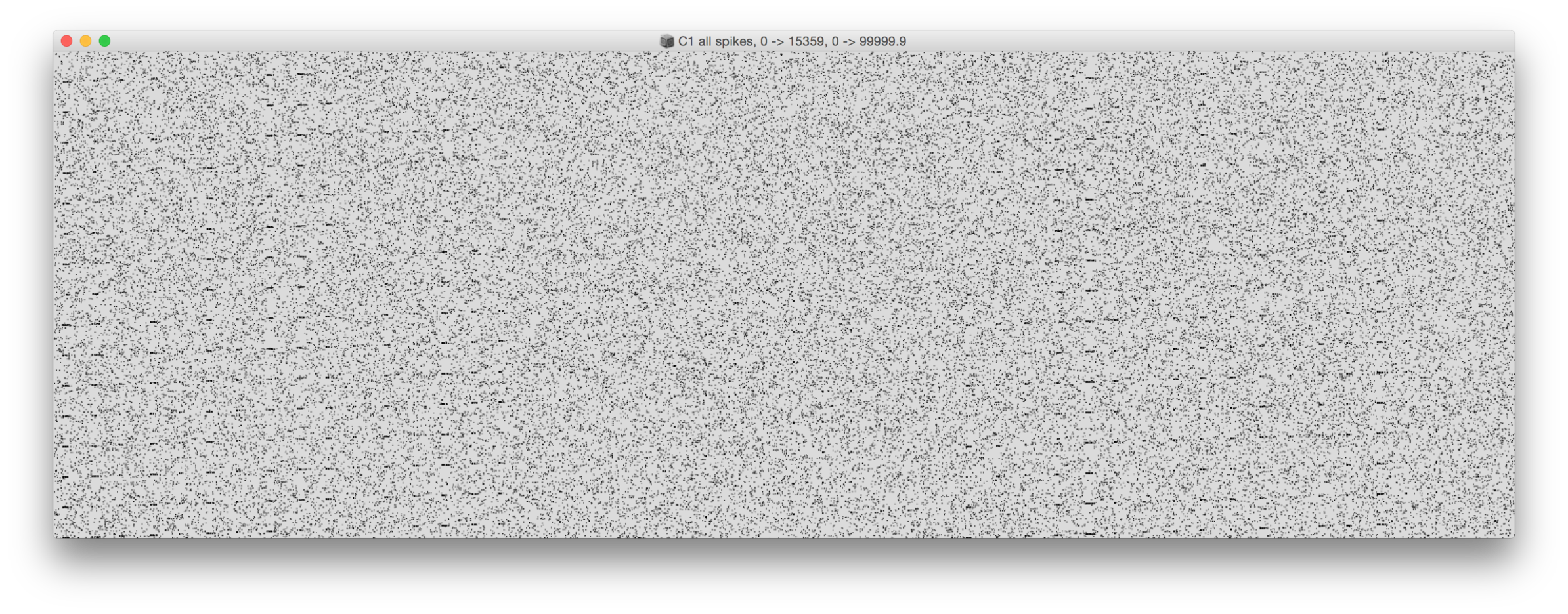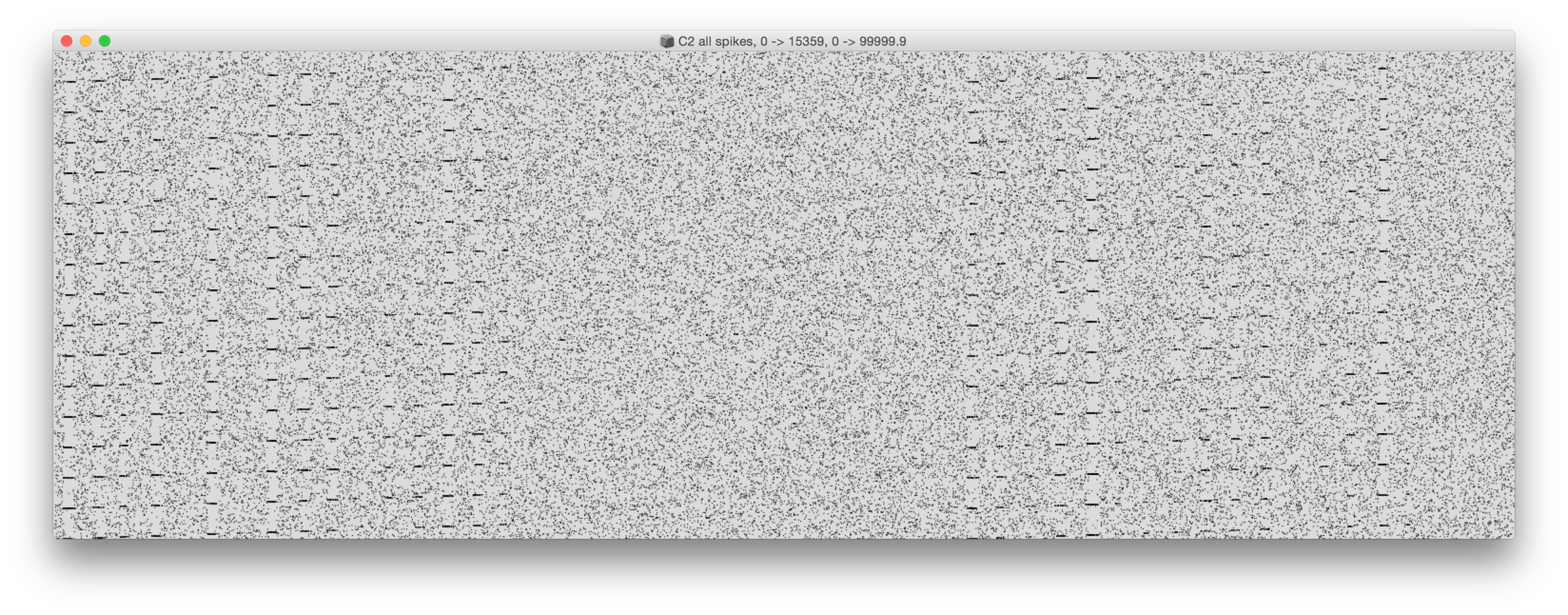 The spikes data set contains the spike times of 32768 cells in a time interval of 100 s. The precision of the time tags is 0.1 ms (10 kHz). The 32768 cells represent two networks of 16384 cells each. The two networks are refered to as C1 and C2, where C2 is connected to C1 by a forward-only connection (C1 => C2).