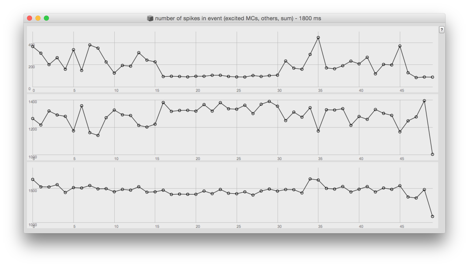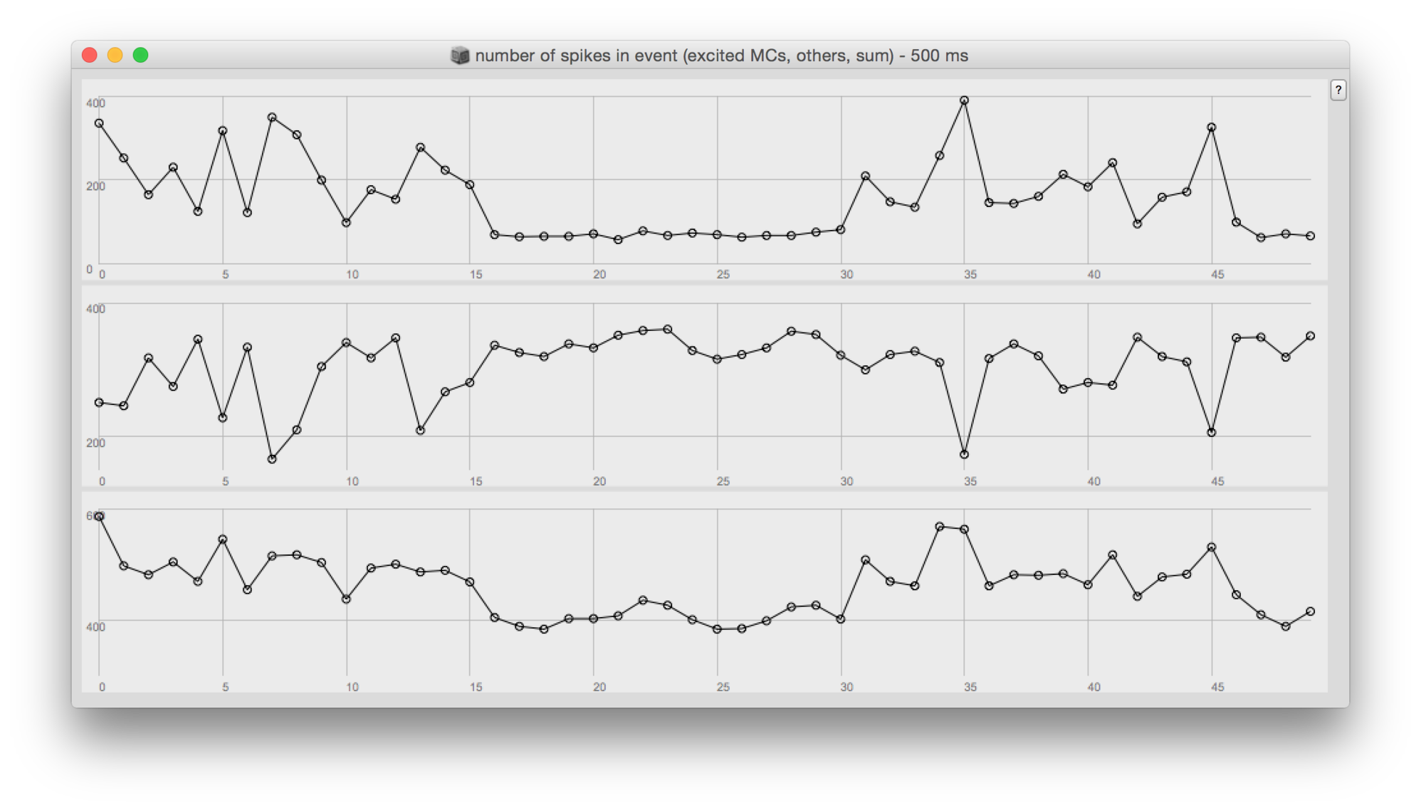 It seems that mainly the cells in the excited minicolumns respond to the excitation. This suggests that corresponding minicolumns are conneted accross hypercolumns. Also, the non-excited minicolums produce less spikes than usual during the response of the excited minicolumns. This can be seen from the plot on the right side which shows spike counts for the 50 events of the excited minicolumns (top curve), of the other minicolumns (middle), and the total count (bottom). The two plots in the slideshow show the count for the first 500ms of the event and the first 1800 ms (which is roughly the durattion of the shortest response). The 1800 ms plot suggests (little difference in the total number of spikes with first 16 and next 15 excitations) that there is a constant spike density in the network and spikes are distributed differently if there is an excitation and response (event). This can also be seen in the excitations, where the counts in the excited and non-excited cells are complementary (if there are more spikes in the excited cells, the others fire less).