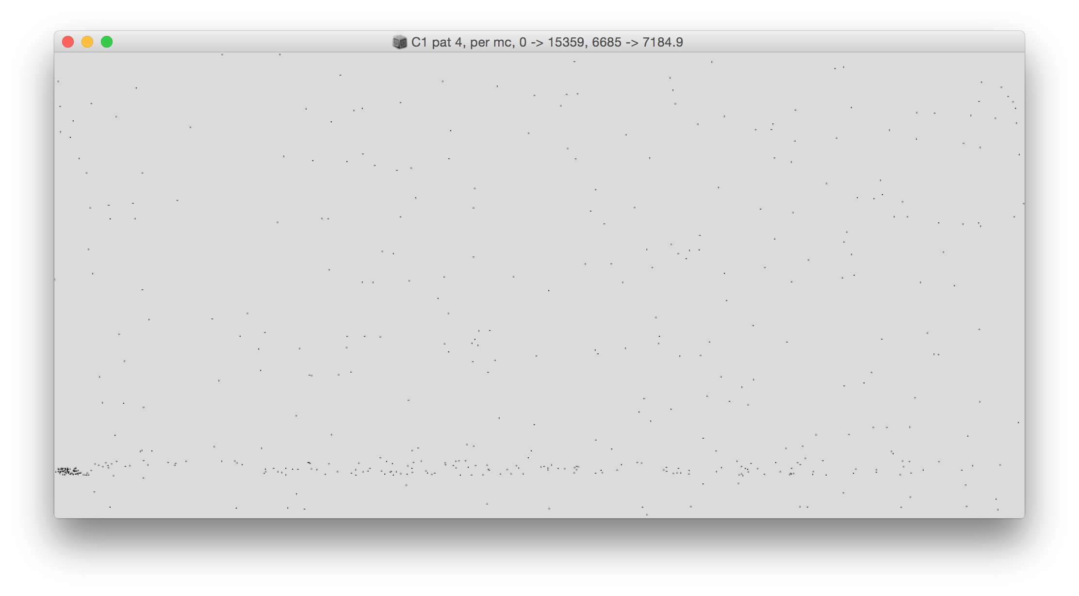 The 5th soundfile contains all not excited minicolums per event, i.e. the excited ones are taken away for each event (which is a different set of minicolumns for each event). Per event the first 1800 ms are taken and strung together without a pause in order to hear better when the density drops, which is when there is an excitation and response in the other cells. To keep in mind when comparing it to he responses in the ecited cells: the overall density in this case of about 31 times larger, because it is all other minicolumns combined.