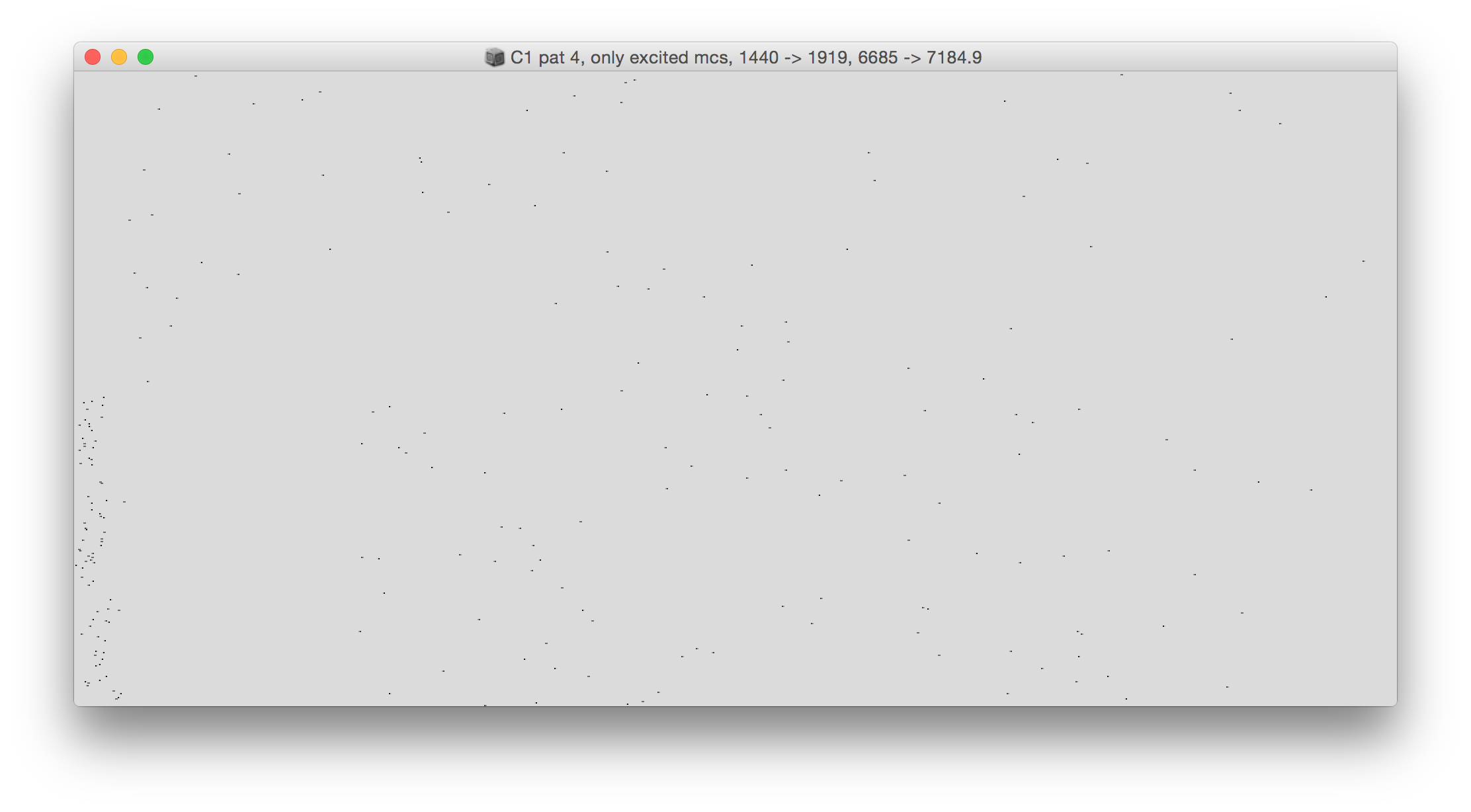 From excitation 32 onwards (which excites again all first minicolumns) a second sequence of 16 pattern responses can be observed (+ 3 excitations with almost no response again at the end). I assume that these should be in some way comparable to the first sequence, so it could be an interesting goal to characterise the differences in the responses auditorily as a basis for comparing the first set of responses with the second set. If the network is assumed to perform equally well in both cases, i.e. detects the pattern ("remembers" it), then some kind of similarity should be audible.