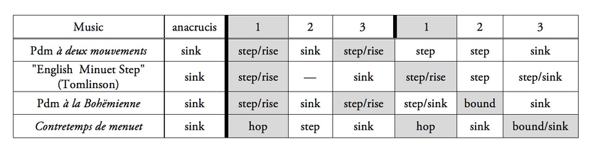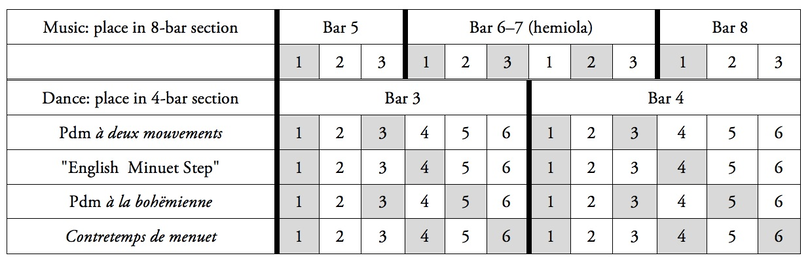 Table 1 on the right presents in a visual form the rhythmical distribution of emphasis in the different minuet step variants. Bar lines in both music and dance are marked in bold, and the emphasised time units are grey. I have abbreviated pas de menuet to ‘Pdm’.