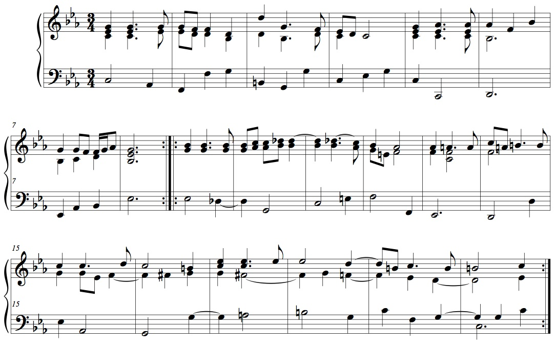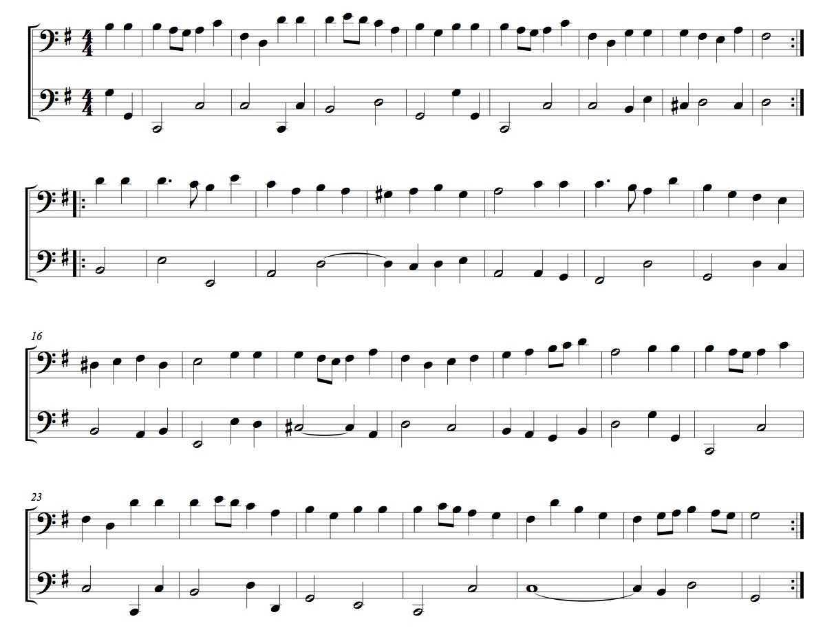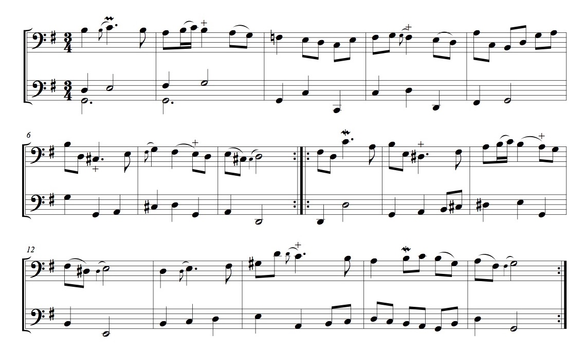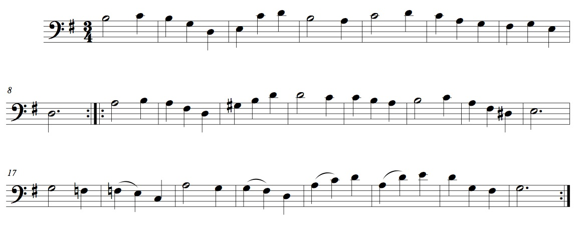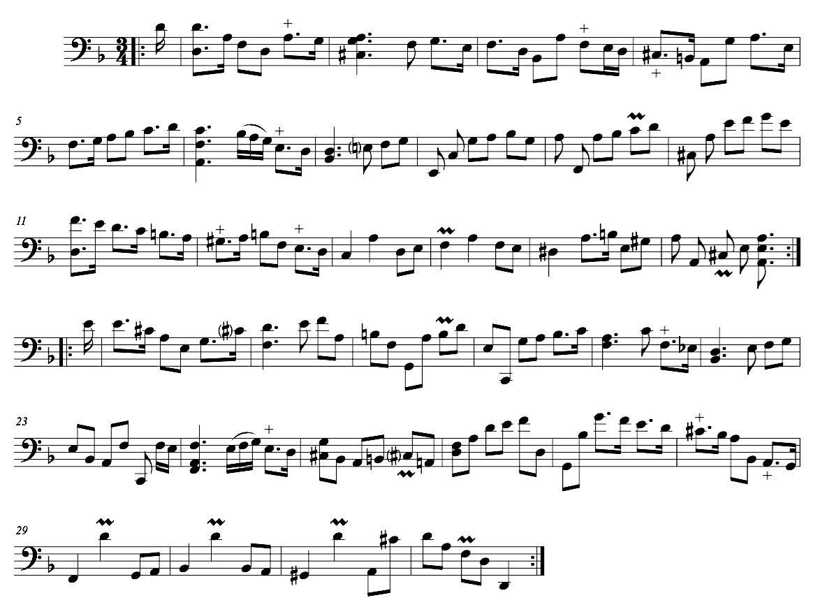The first gavotte from the Sixth Suite also has a clear dance structure, but the omnipresent chords pretty much obstruct the use of a proper dance tempo. The tune is still quite dance-like, and when stripped of its chords it comes through as a piece that would not have been out of place in a French seventeenth-century ballroom. In this version, I have added a simple bass part to compensate for the lacking harmonies.19