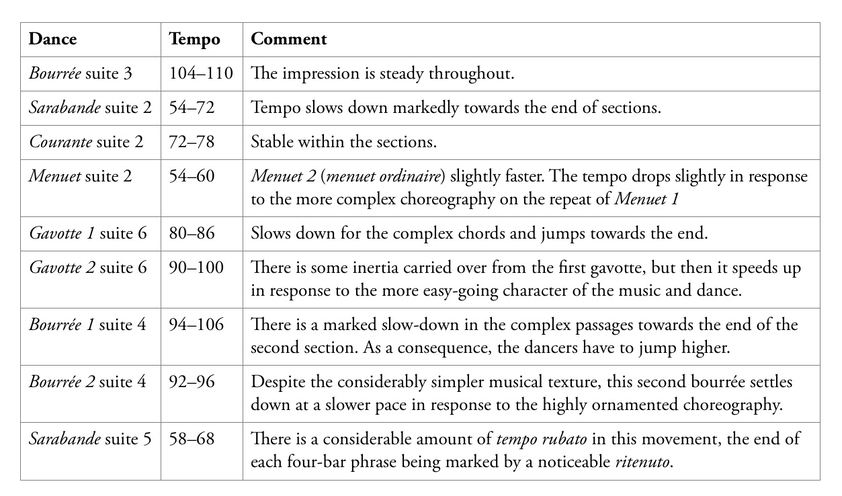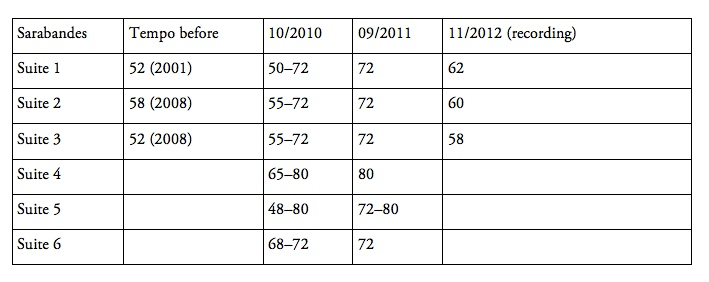 In the course of the project period, I observed that, even in quite complicated movements like the sarabande, my perception of ‘the right tempo’ started converging with the historical dance tempos. For the sarabande (excluding the sarabande vive, or fast sarabande), the historical sources indicate a tempo of MM 68–86, whereas both ‘normal’ and historically informed performances of the Bach sarabandes tend to be slower: roughly MM 32–50. My own interpretations, before starting dance practice, were situated close to this range: I used to play the Sarabande of the First Suite at MM 52. After a year of dancing, I made a list of tempo ranges that seemed possible for each of the sarabandes, marking down 50–72 for this particular one (see table 4). One year later, finally able actually to dance a few sarabande choreographies (Sarabande pour une femme, La Bourgogne), I made a new test, this time noting only the tempo that spontaneously felt natural. For the first sarabande, this now turned out to be 72, with no technical discomfort. It is remarkable that the sarabandes now felt natural to perform at a tempo that seemed the fastest possible the year before. When I recorded the suites a year later I had finished the ‘speeding-up process’; I could back down a little without feeling I lost the dance character.