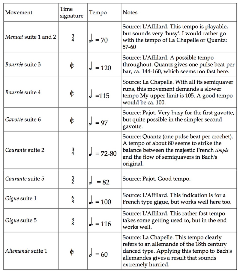 This was a good occasion to challenge the ‘Bach tempo consensus’; thus, I decided to try rigorously applying historical dance tempos to selected movements from the cello suites. Since most of these tempos are radically faster than the cellist’s traditional tempos, this required a fair amount of practice; but it was definitely worth the trouble. Table 3 shows each movement, the tempos I used as goals, and my notes. I deliberately chose to test only dances for which historical dance tempos exist.15