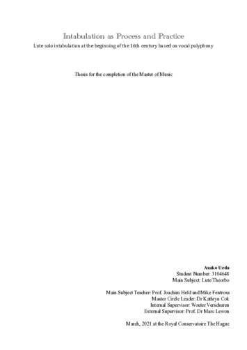Research Title: Intabulation as process and practice Research questions: When it comes to the manifold surviving solo lute intabulations from around 1500, where is the line between "unwritten" and "written" intabulation? Intabulating involves the writing out of several parts into tablature, but does this twofold distinction really apply to all pieces? What was the process of appropriation of vocal polyphony for a lutenist of the early 16th century? How can we apply this to our own processes? Abstract: Intabulation refers to the arrangement of vocal pieces for what Johannes Tinctoris refers to as a “perfect instrument”, amongst which he counts such instruments as keyboards and the lute – and it implies writing out the parts of a polyphonic composition into tablature. However, after playing many surviving intabulations for several years, I had a strong feeling that there must be an “unwritten” solo lute intabulation practice behind the “written” intabulations from the beginning of the 16th century, in contrast to the more “composed” intabulations from the time after the mid-16th century. While surviving sources provide us with much information on what lutenists played, they also hide the “unwritten” practice which they did not record. We can only imagine what was happening. In this thesis, I investigate the process of intabulation by lute players from this time by analysing and comparing different versions of the same song from different sources. Through this research, I trace the transition of the changing style of intabulation, which is in turn related to the transition of lute technique from plectrum to finger-plucked and the change in style of the vocal models. Moreover, the diffusion of printed music changed the manner of the transmission of music. To conclude, I hypothesise that lute players might have listened to and copied each other’s intabulations unconsciously, and when they wanted to preserve their work, they might have made some adjustments to their intabulations. The study also suggests how to apply these ideas to actual intabulation practice, which will be presented in the Research Symposium online as a video format. Biography: The Japanese lutenist Asako Ueda studied the lute at the Royal Conservatory of The Hague with Mike Fentross and Joachim Held and completed her Bachelor's with the highest achievable mark, which gives her the opportunity to continue to the Master’s program with the Excellence Scholarship of the Royal Conservatory of the Hague. She won first prize at the Biagio Marini Competition and third prize at the International Van Wassenaer Competition. She started playing the violin at the age of five. After finishing her Bachelor’s degree with the violin in Tokyo, she continued to study the Baroque violin and composition. https://asakoueda.com