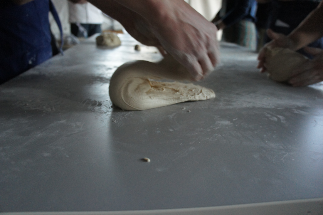 When the dough had rested enough, it was time to knead. Kneading is a rhythmic whole-body movement gesture. It is important in order to make all ingredients blend properly but also to smash the proteins so that the gluten can develop. The gluten structure makes the dough plastic and elastic so that it keeps the dough stuck together throughout the baking process.