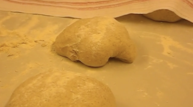 Finally, we formed the dough to give it a desired shape, moving in a 'forming rhythm': wait and form and wait and form and wait, to allow the dough to become tense and strong. The tension in the dough helps it keep its shape during the last long fermentation and the final step of baking in the oven. When we had formed the dough, we could sense the tension by pressing a finger into it and feeling the re-bound; the surface returning to its original shape.