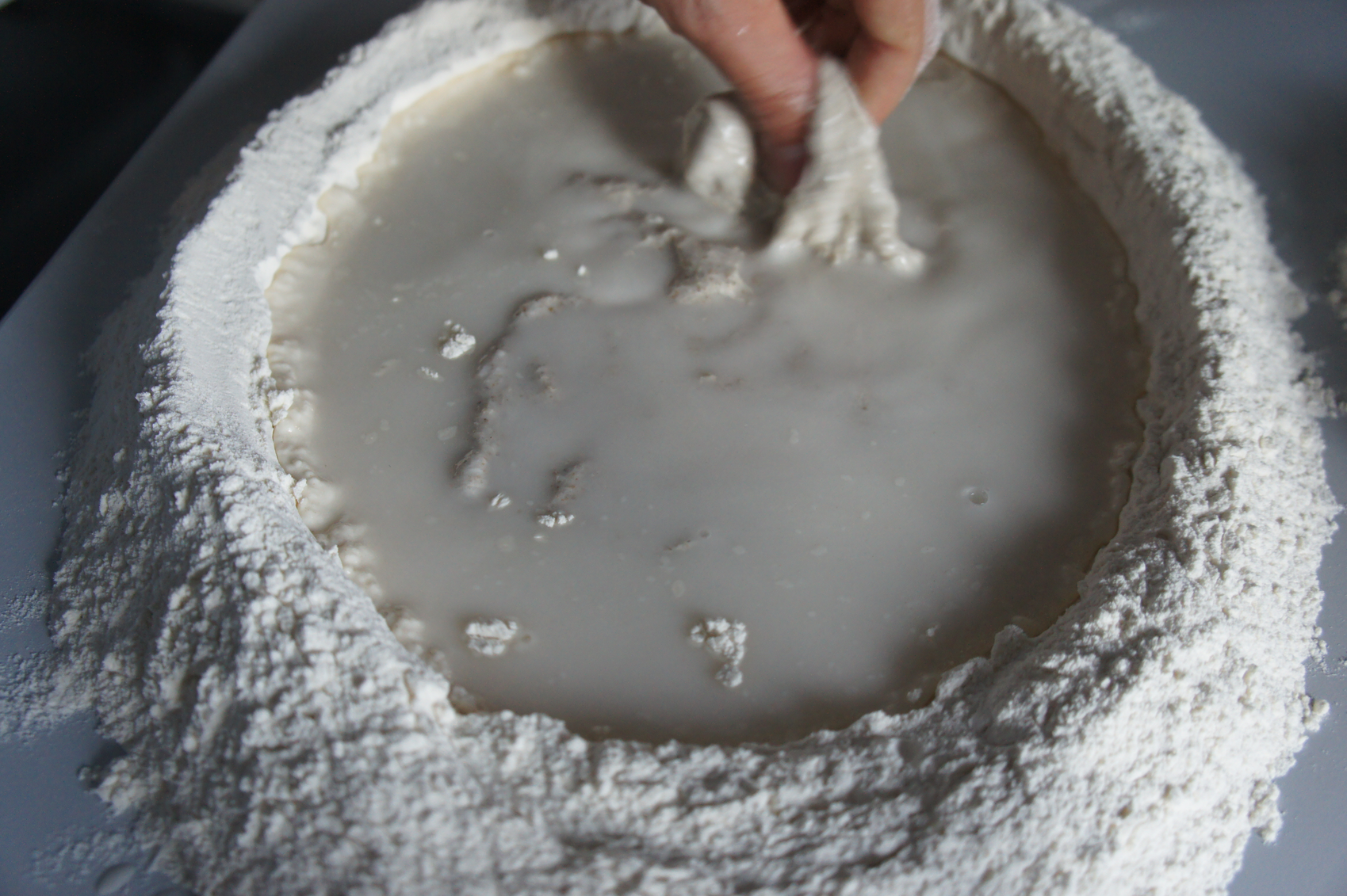 Sebastien: We are not going to knead the bread, not work, we will only connect with the ingredients. It is important to make it [‘La Fontaine’] big enough and the borders even. Otherwise the water will break the flour wall and fall on your feet and on the floor.