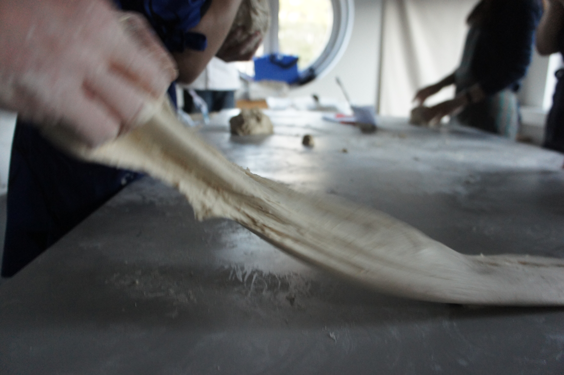 While letting the dough rest, the group of participants rest as well. At first everyone lay down in a quiet room to relax and think/feel alone (see notes to the right). The exterior shape of rest is characterized by silence and stillness but inside the dough, activity and turbulence rule. To feel how the inner texture had developed during the rest, we stretched the dough. Sebastien demonstrated the increasing elasticity by stretching it into a semitransparent film.