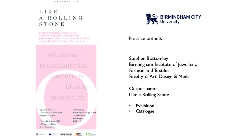 The exhibition “Like a Rolling Stone” (Bottomley & Cross) followed the 2016 workshop that invited ten international contemporary jewellery makers to visit the geological sea/landscape of North Berwick, Scotland and respond to themes of relocation, transplantation, camouflage, identity and materiality in the works that they made.