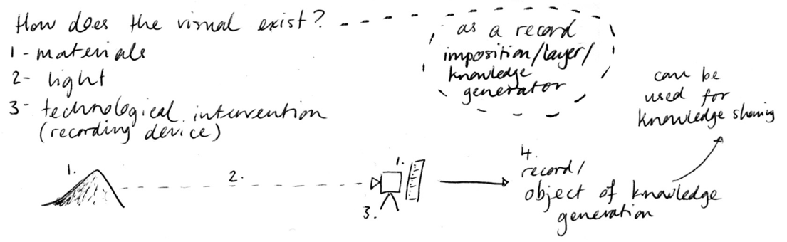 In one of Paul Klee’s posthumously published notebooks, The Thinking Eye, one of his main concerns is visual thinking, where drawing can be described as a line that has been “taken for a walk” (cited in Spiller 1961). Lines join up ideas, form explicit relations and create a diagrammatic structure. As Tim Ingold suggests, “The line is... between the finality of objects and the potentials of things...” (Ingold 2011: 18). The process of forming ideas through practice perhaps then relies on an “in-between” state. As the content and form of my practice shifts between still images and moving ones, the diagram is an appropriate tool to move through the different stages of my praxis as work that is in a constant state of flux and movement through process.