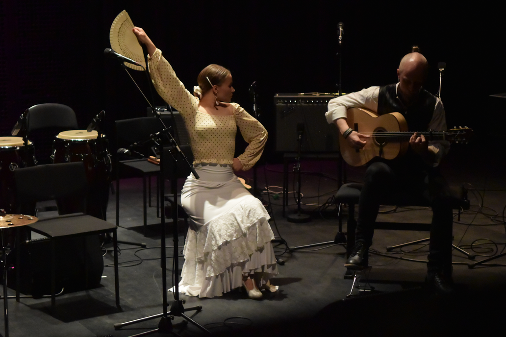 I had heard some flamenco before starting my studies at the Global Music -program. I thought that it’s one of the most beautiful singing that I had heard but at the same time I thought that I was already too old to begin studying a new tradition again. Another big concern was the question of who can sing other people’s traditions. I had not even listened to flamenco growing up so I thought it was too much of a stretch and that I couldn’t justify it to myself or to other people. When I started at the Global Music -program, the only thing I knew was that I wanted to sing in Spanish. I looked for the teachers that teach some kind of singing traditions that were sung in Spanish. I decided to take lessons from a Finnish flamenco singer Anna Murtola who I knew from the Global Music department and who was teaching flamenco singing. My initial thought was that even though I could not dig deep into the flamenco tradition, I could still get inspiration from the vocal technique and expression in the style and learn something from it. I ended up liking the lessons a lot and Anna Murtola was such a lovely and inspiring teacher that I started to get very excited about flamenco, thinking that maybe I could study it more. I got a big push into that direction when, after one semester of flamenco studies, she encouraged me to go and do a little performance on the free stage of Global Fest. I felt so good and inspired to perform some flamenco that I began investing more time into my flamenco studies.