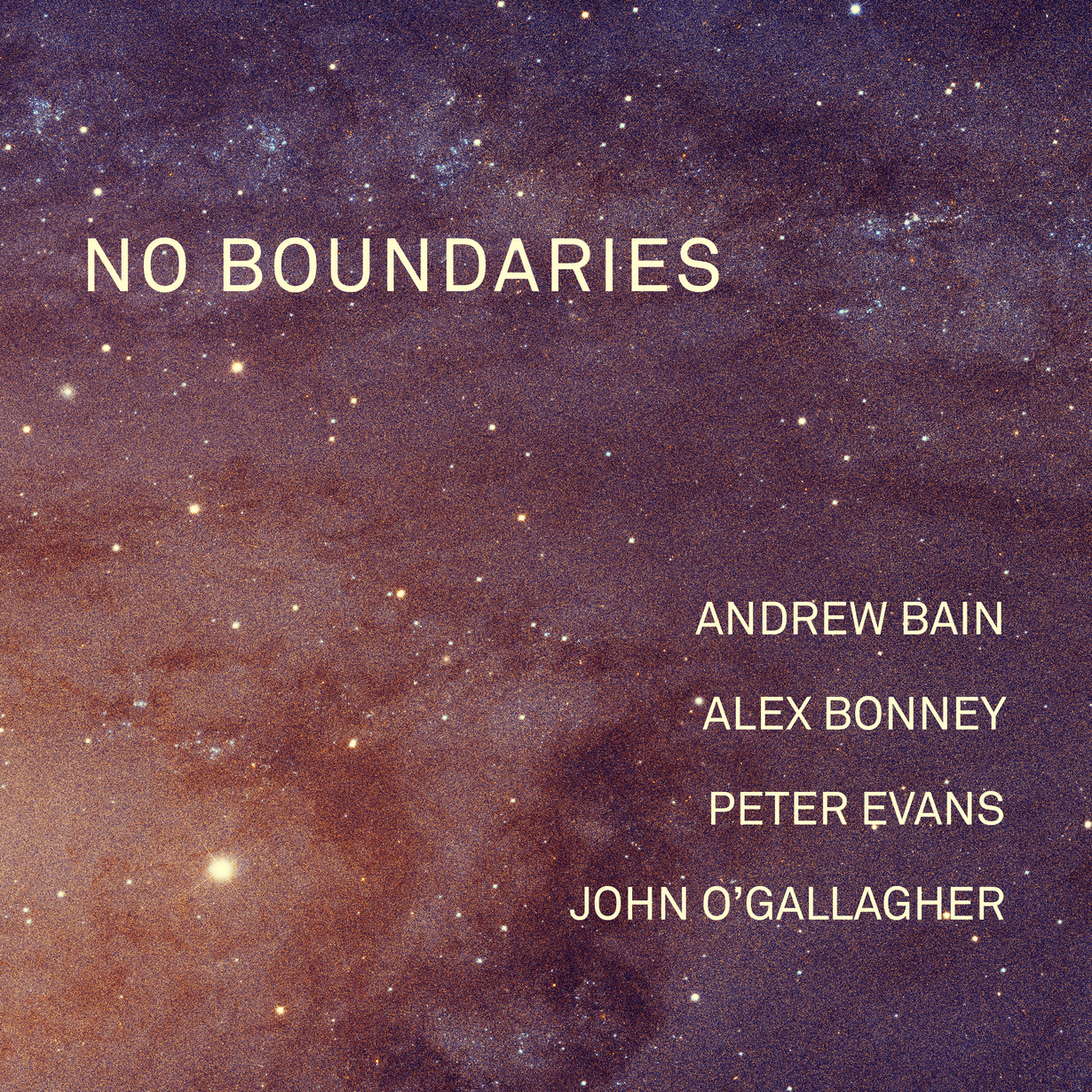 When a quartet of established, improvising musicians arrives on stage, there can be some expectation in our minds as to what might ensue. But in the case of live-recorded No Boundaries – with the combined acquired knowledge, intuition and invention of drummer/percussionist Andrew Bain, trumpeter/flugelhornist Peter Evans, alto saxophonist John O’Gallagher and electronics master Alex Bonney – we are prompted to explore spheres perhaps outside of our experience.