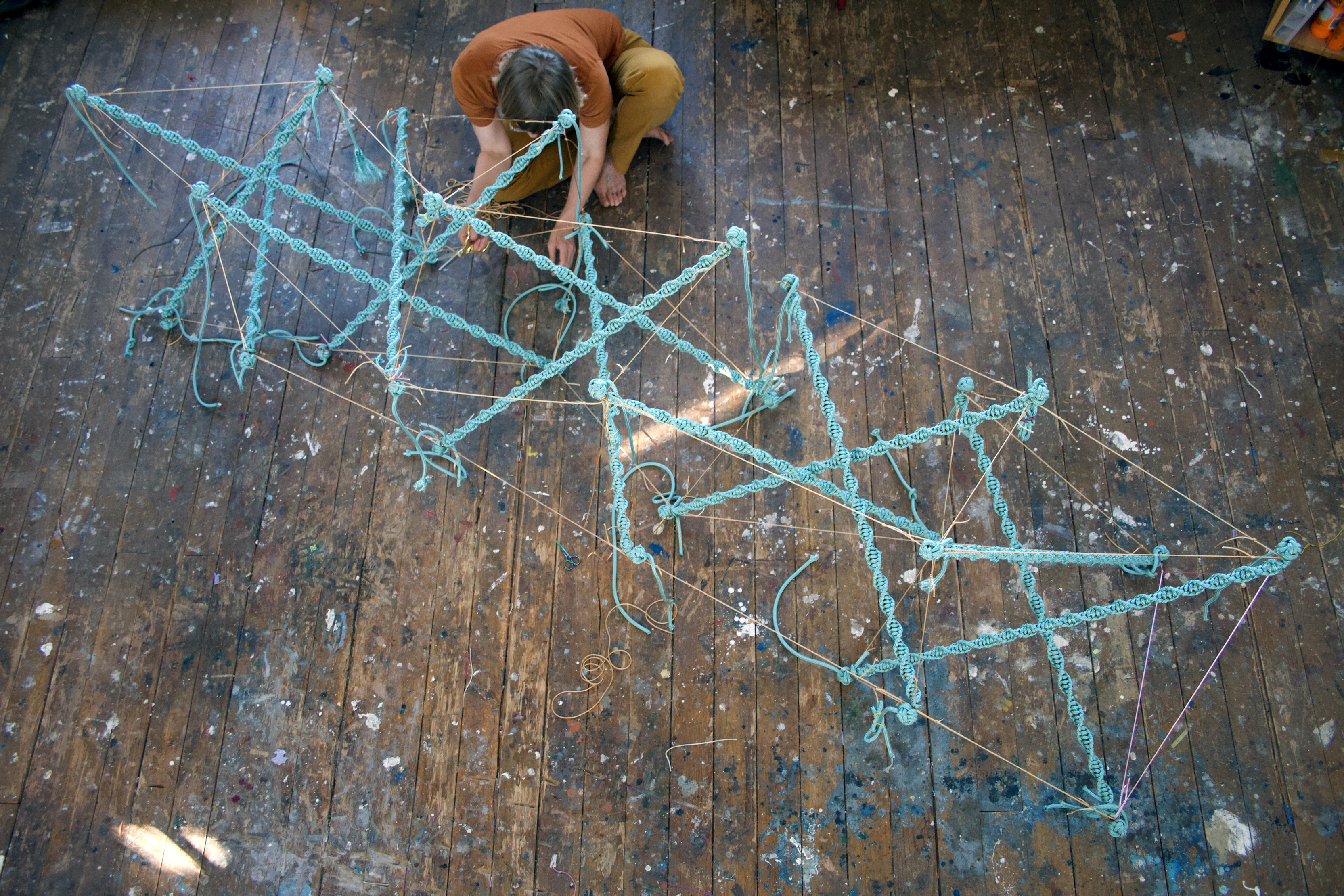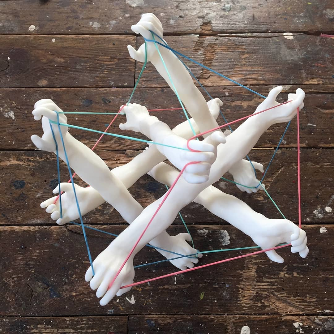 "Petite Titan in Tension-Inferno" 6 av Titanens dubbelarmar hängande i spända gummisnoddar så att inga av de fasta elementen, alltså armarna, nuddar varandra. Konstruktionsprincipen, som ibland kallas Tensegrity, ett ord sammansatt av Tension och Integrity, utvecklades, och populariserades, av Kenneth Snelsson och Buckminster Fuller under deras tid på Blackmountain College där även Ruth Asawa var student.