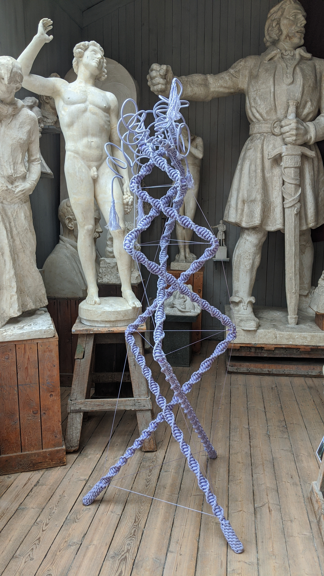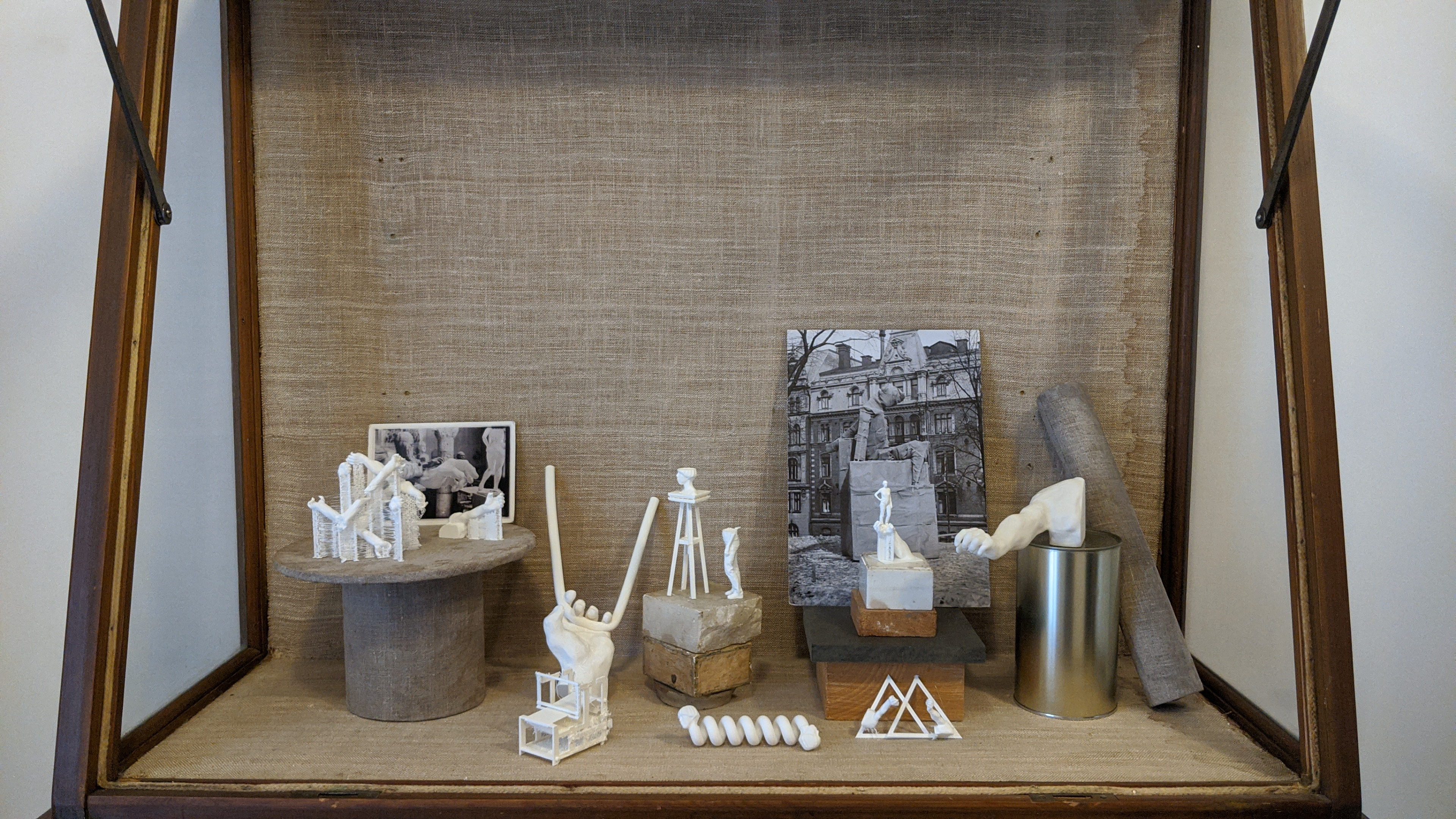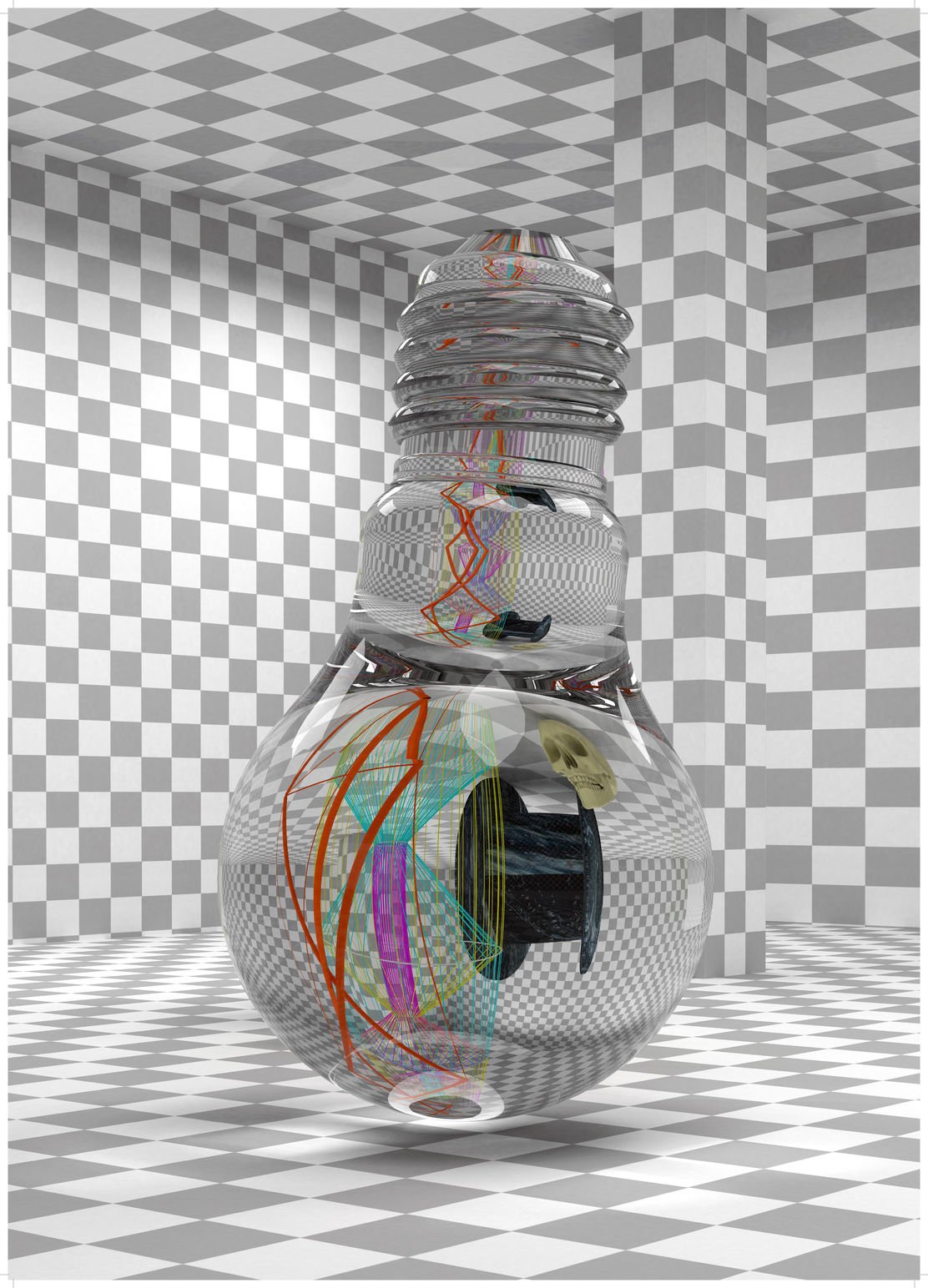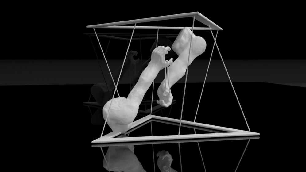Beståndsdelarna i kabinett-arbetet är en 3D-scanning av den utsträckta vänsterarmen från en gipsstudie från Carl Eldhs arbete med "Titanen", en skulptur av en naken, muskulös Strindberg som står som brons i Tegnerlunden, en 3D-scanning av min egen kropp samt bildmaterial från Carl Eldhs ateljémuseums arkiv. Genom tankebubblan talar jag bl.a.om väv som konstruktionsprincip och yta för kognitiva strukturer, abstraktion och minsta möjliga mänsklig gestalt, produktionsvillkor nu och då, förhandlingar i offentligheten, arkitektur och kropp, expressiva uttryck och funktion och skulpturarbete. Tankebubblan, som helhet talar också om det som är grunden till min forskning, ett sökande efter materialitet och dess verkningar i ett samtia landskap och hur våra olika erfarenheter av görande i digitala och corporeella rum tillsammans påverkar vad det innebär att vara människa.