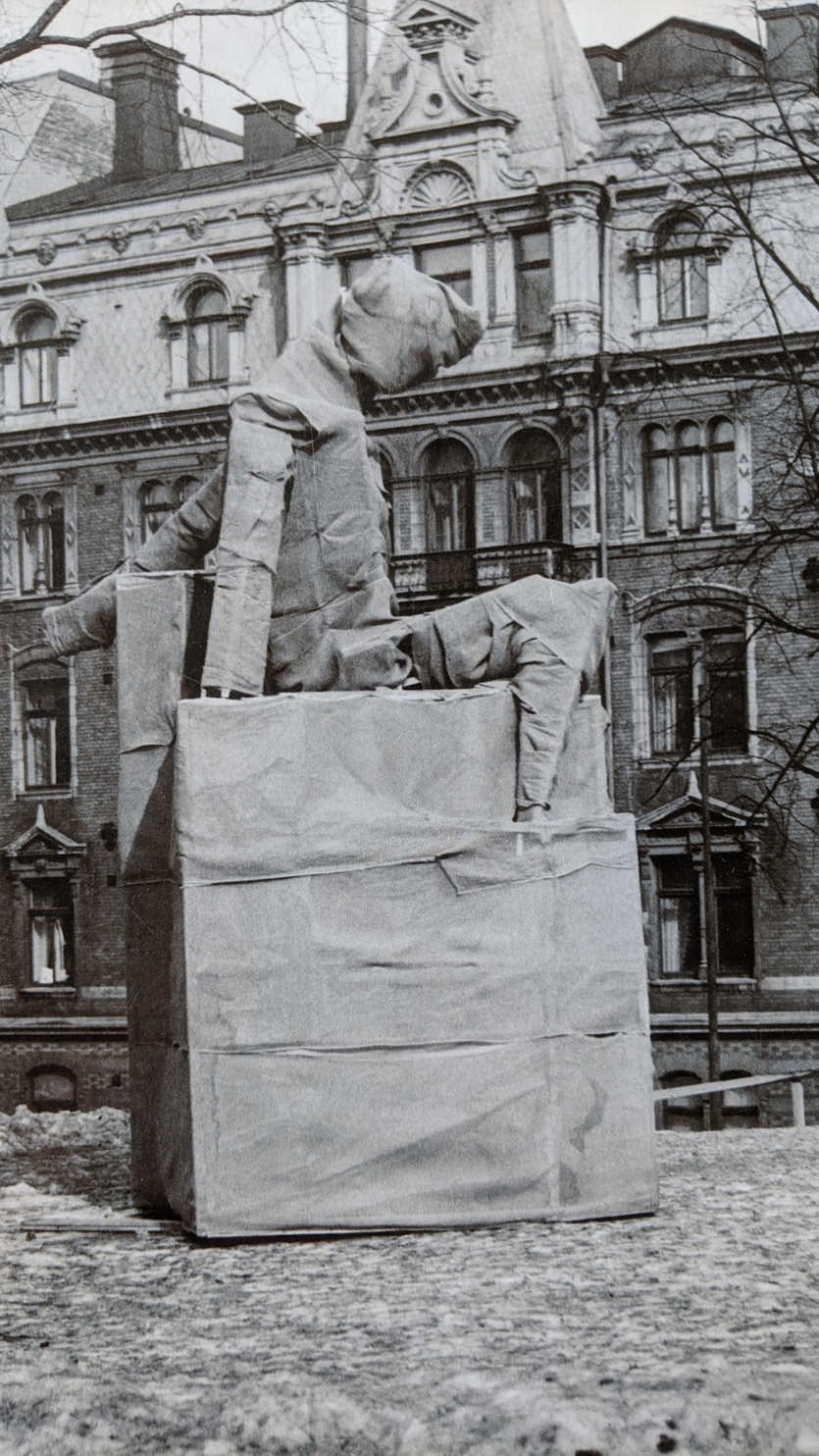 En maquette/Toile av Titanen, som flyttades runt i förhandlingar om skulpturens placering. Eldh ville själv att den skulle placeras i Vanadislunden. Titanen står i Tegnerlunden
