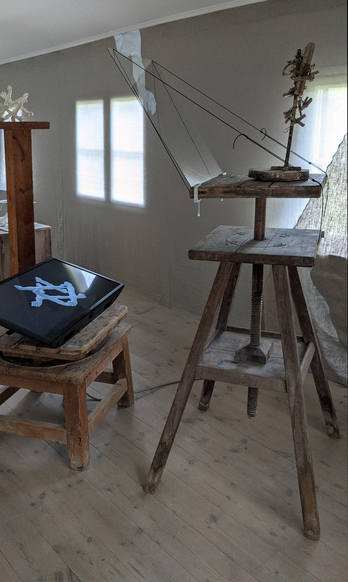 Suspended Animation, Carl Eldhs cavaletter och armering, 3D animering på monitor, glasskiva och rep, 2020. Insptallationen använder sig av ett illusionsteknik från förra sekelskiftet, Peppers spöke. Med hjälp av en vinklad spegel och ett upplyst objekt eller film skapas illusionen av att ett spöke befinner sig på scenen.