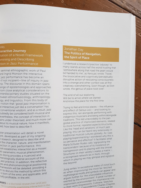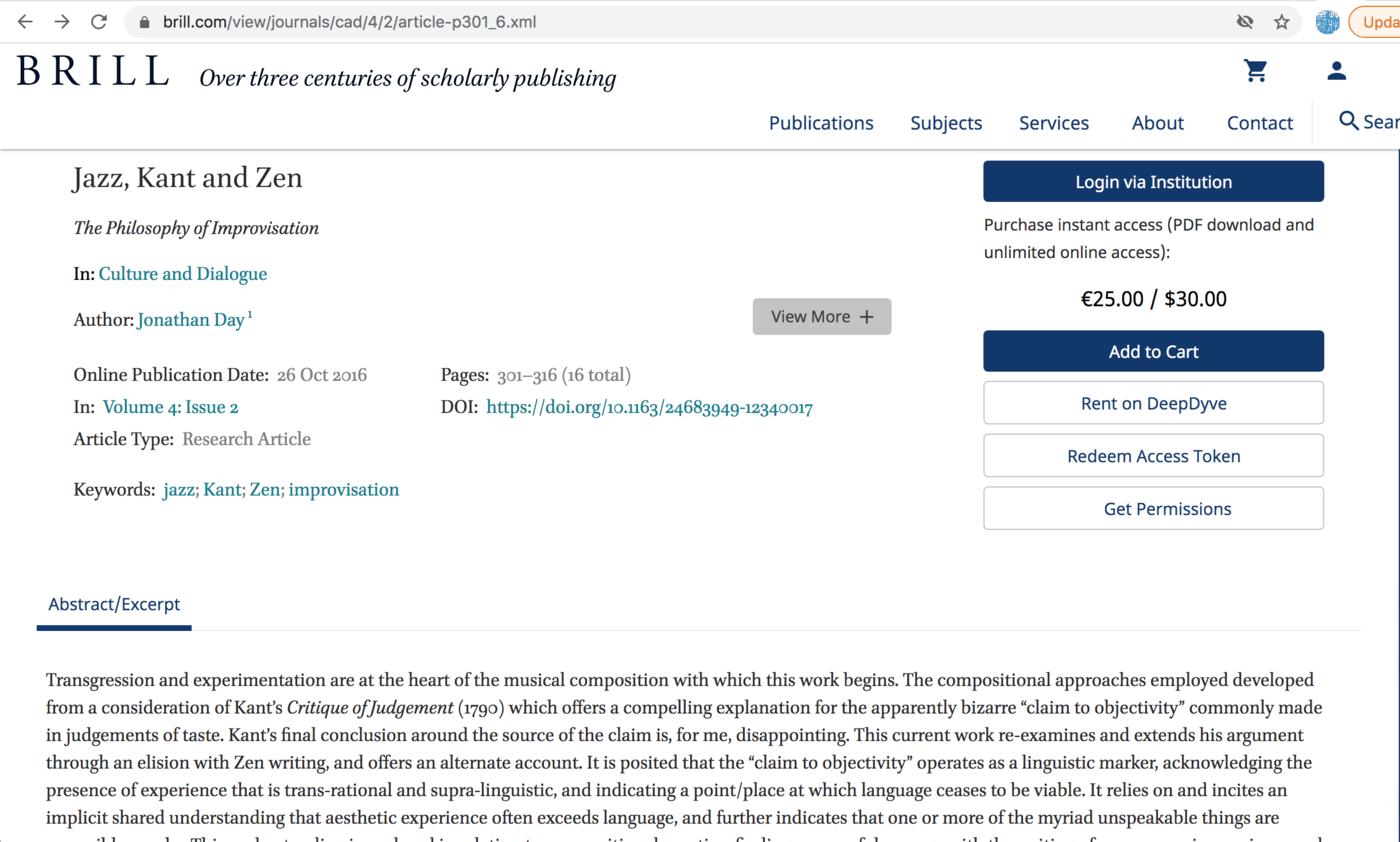 B A detailed exegesis of the theoretical advances facilitated by the creative work is offered in two chapters and a keynote lecture. The first, in the Journal Culture and Dialogue, published by Brill, is a stall-setting piece initiating the research exploration. Day, J., 2017, “Jazz, Kant and Zen: towards a philosophy of improvisation”, Culture and Dialogue, Brill: New York and Amsterdam, Volume 4 issue 2, pp 301-316. https://brill.com/view/journals/cad/4/2/article-p301_6.xml