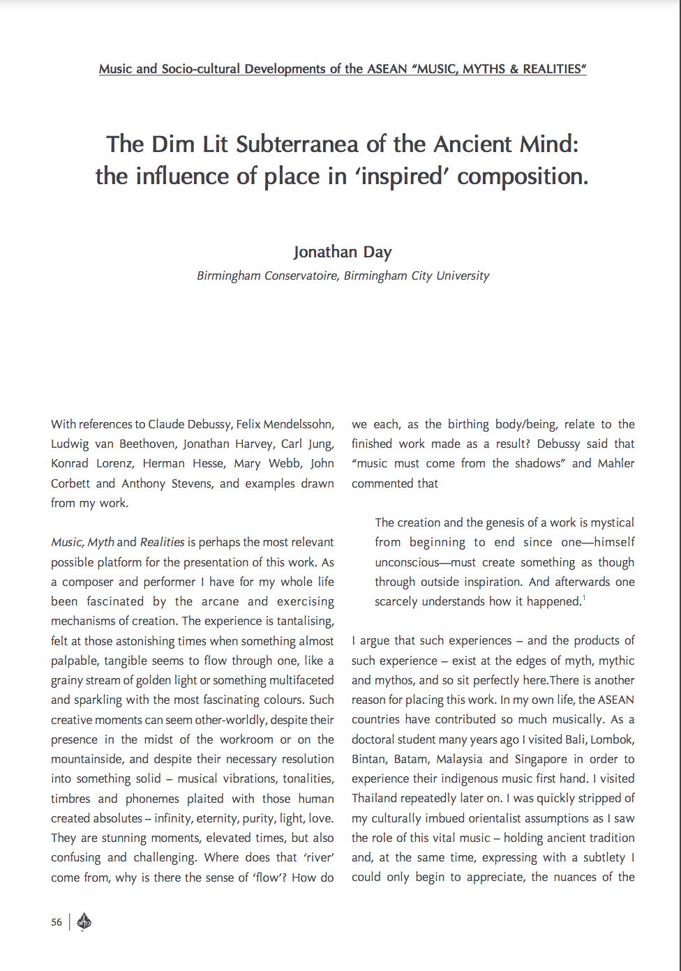 Day, J, 2017, “The Dim Lit Subterranea of the Ancient Mind: the influence of place in ‘inspired’ composition”, Music, Myth and Realities, Princess Galyani Vadhana Institute of Music: Bangkok http://www.pgvim.ac.th/pgvis/wp-content/uploads/2020/06/Proceedings2017.pdf