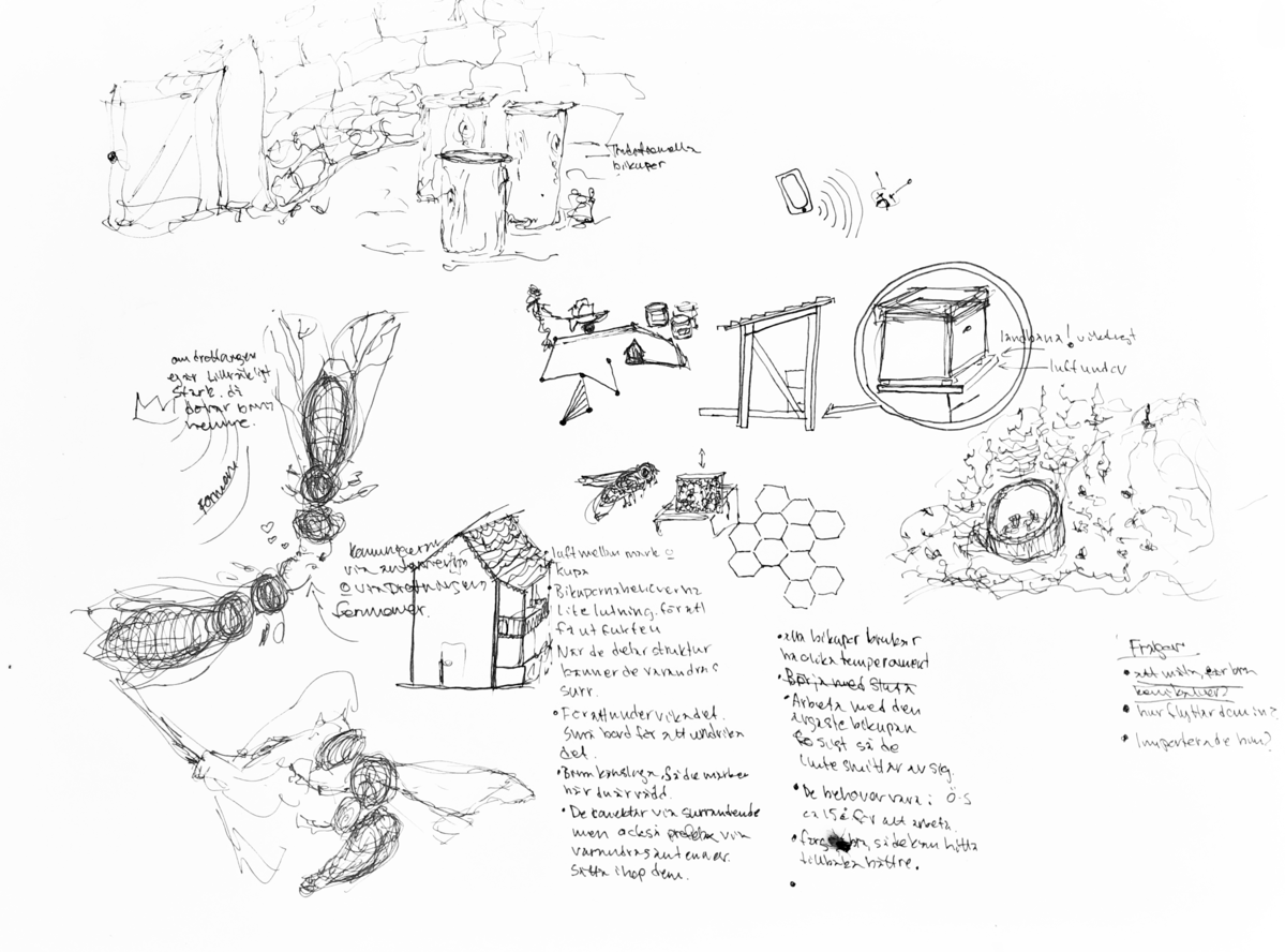 The project was realized with the artist collective Inland – together with artists, biologists, beekeepers, apiculture experts and Konstfack spatial design students. The result is a process that host an apiary, home for beehives, and offers the public a spatial experience of remediation and a place to overcome melissophobia, fear of bees. The project reflects on the ongoing trauma of the climate crisis that leads, not only to rapid decrease of biodiversity, but also force displacement of human beings from rural territories. We investigated how architecture can operate as an interface between apiculture and bees. At the same time making a public place to learn about lost relations between humans and pollinators, relearning how we can build interdependent relationships and reconnect with other species.