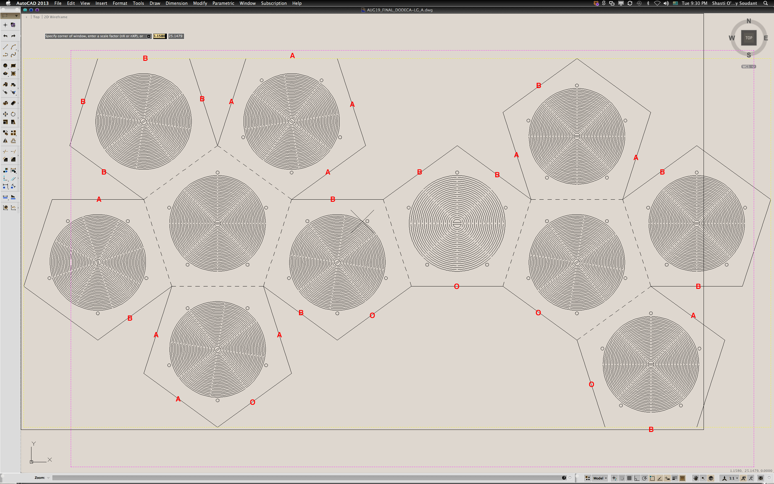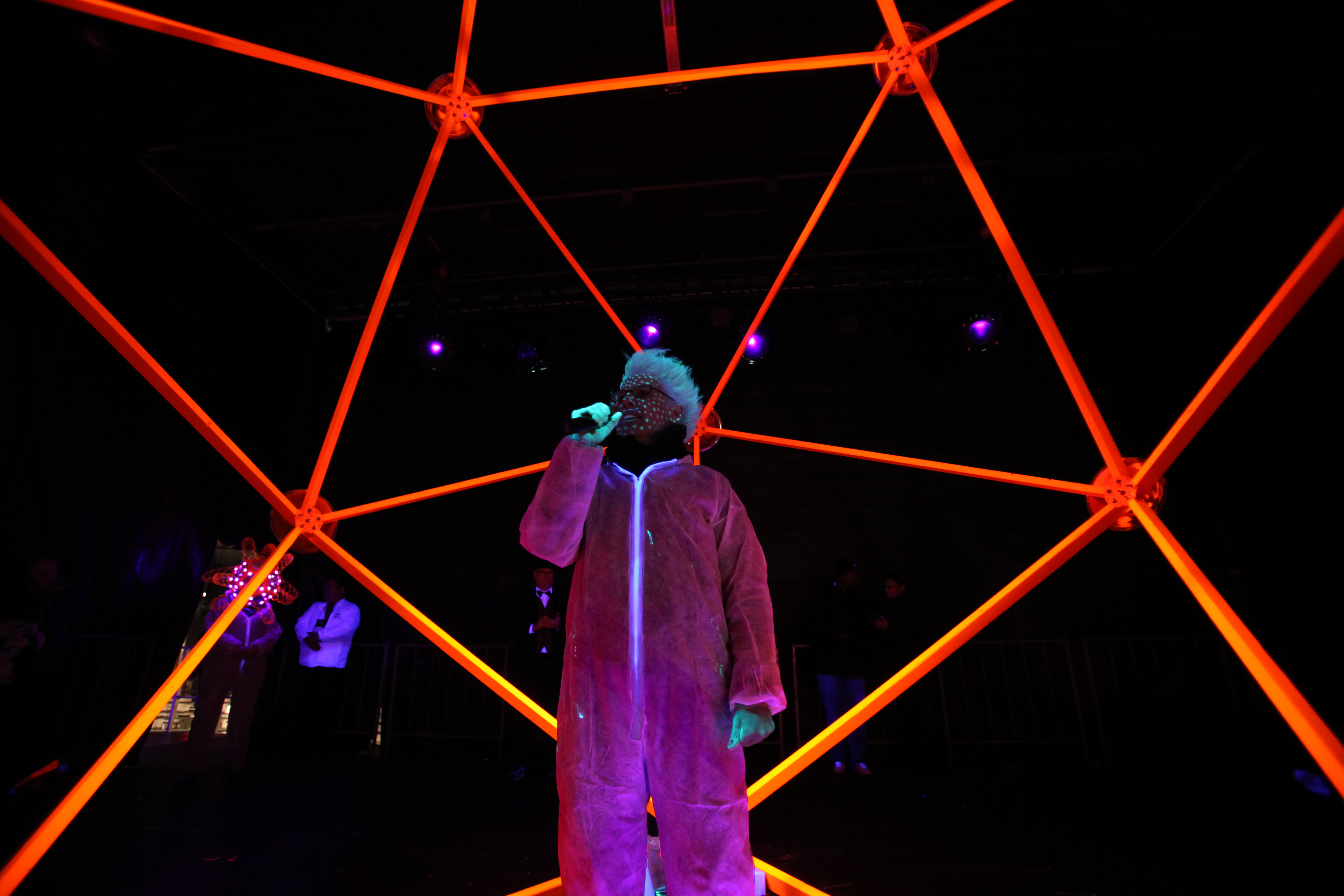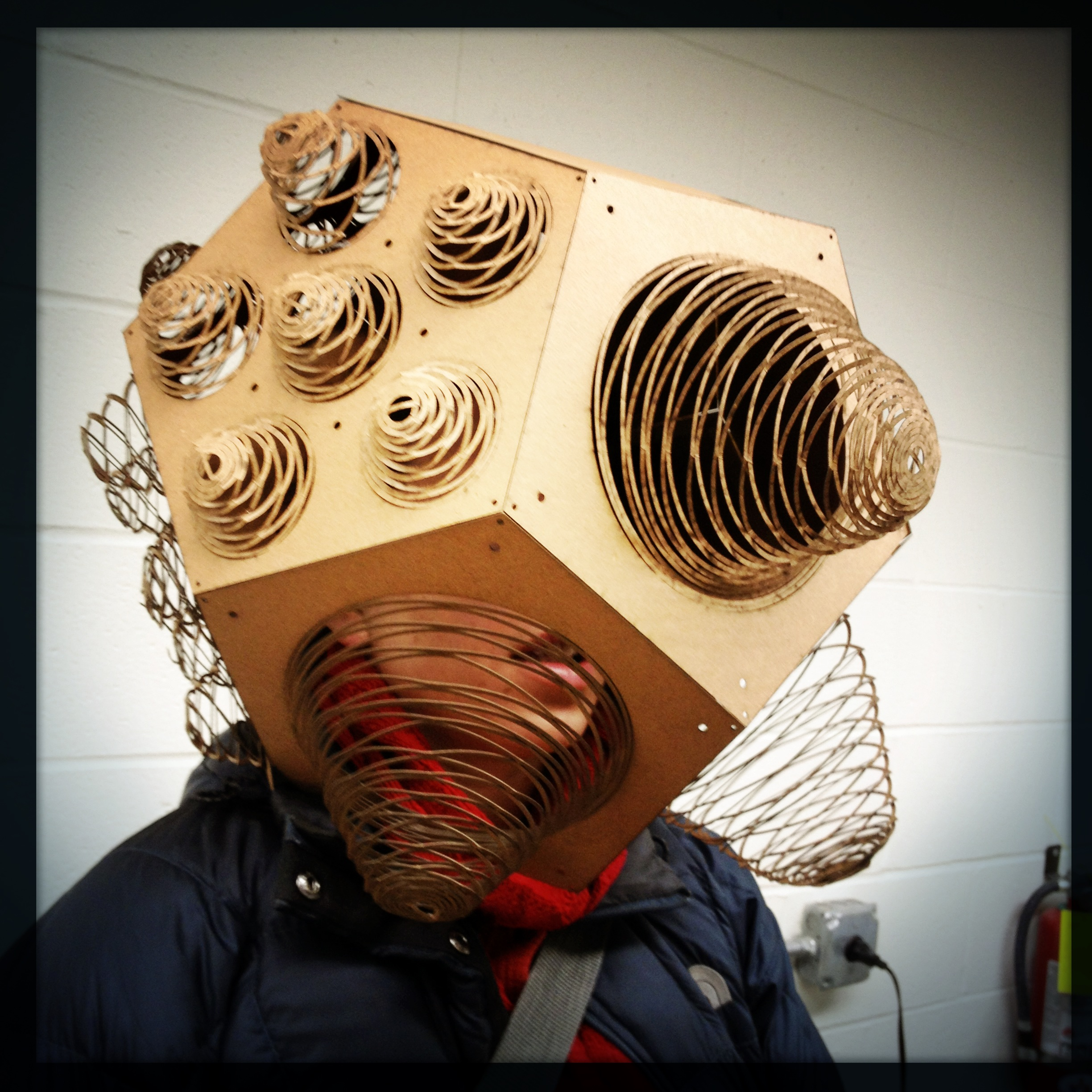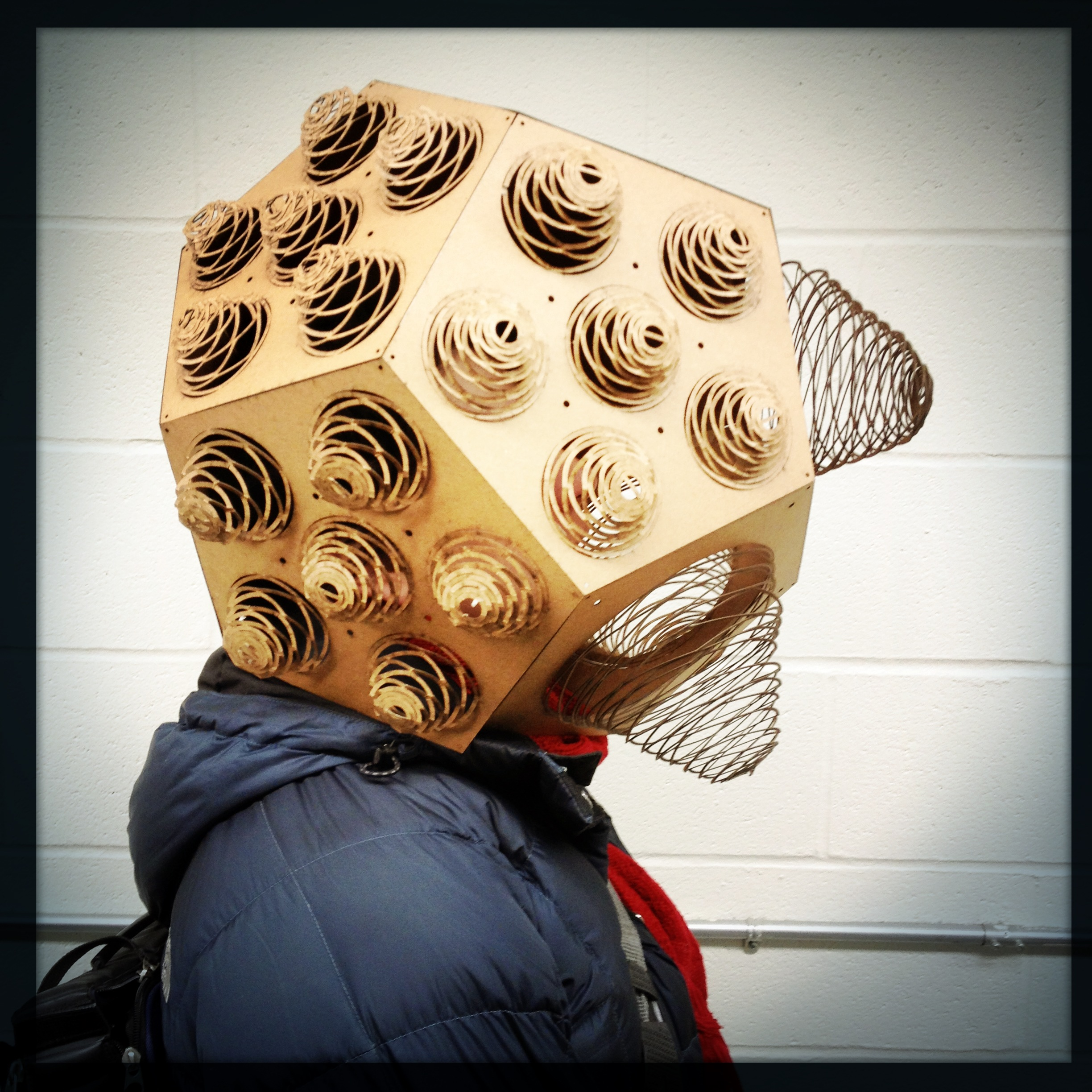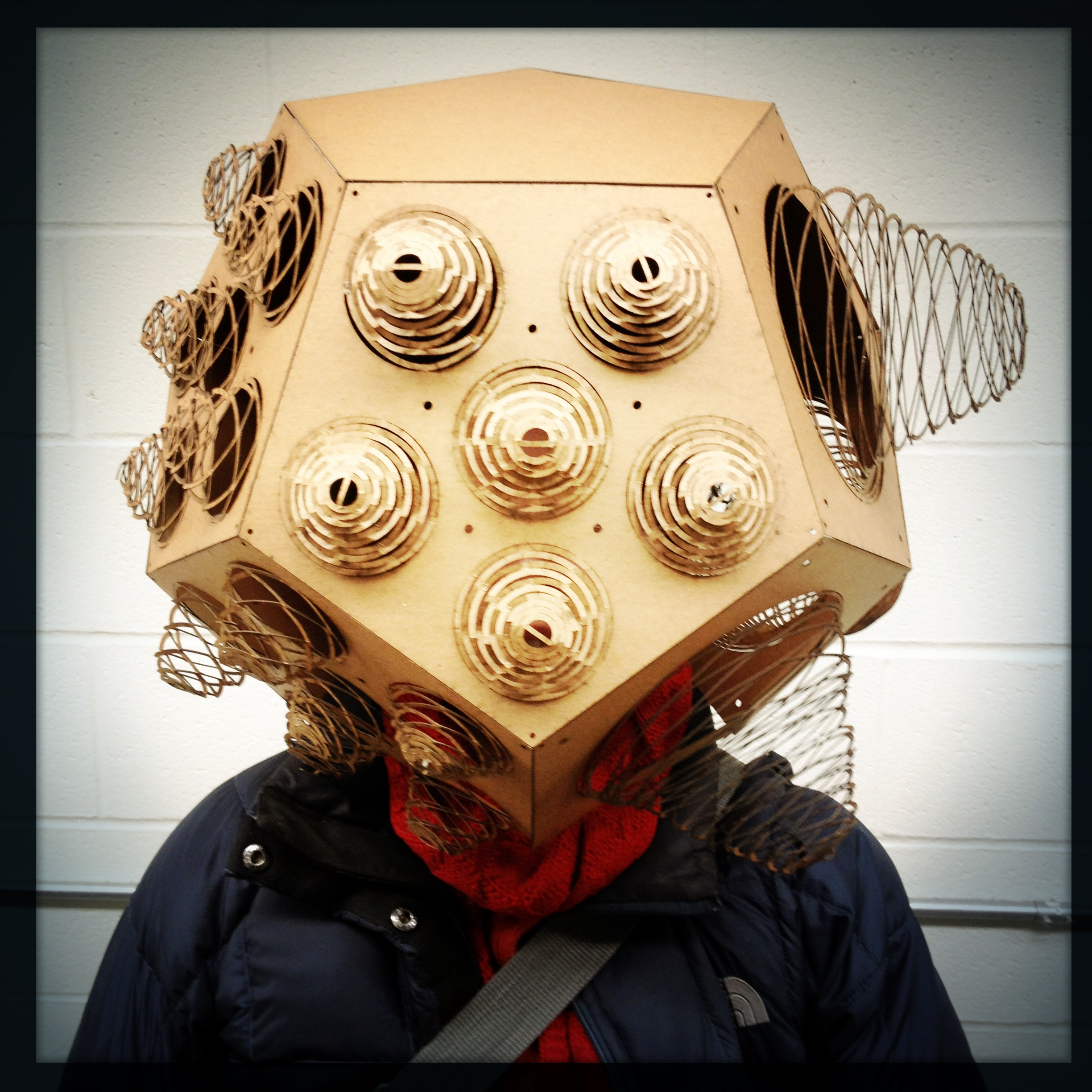 Research into the startling corrollaries between the hybrid dodecahedral and icosahedral lens structure necessary to create the spherical implosion wave of nuclear weapons [2] and the various polyhedral structures of viruses[1:1] informed the design for the helmet worn by the performers. That these formal and visual corrollaries not only existed, but have in fact echoed repeatedly through time, reaching thousands of years into human history, created a formidable theoretical infrastructure onto which to hang the performance.
