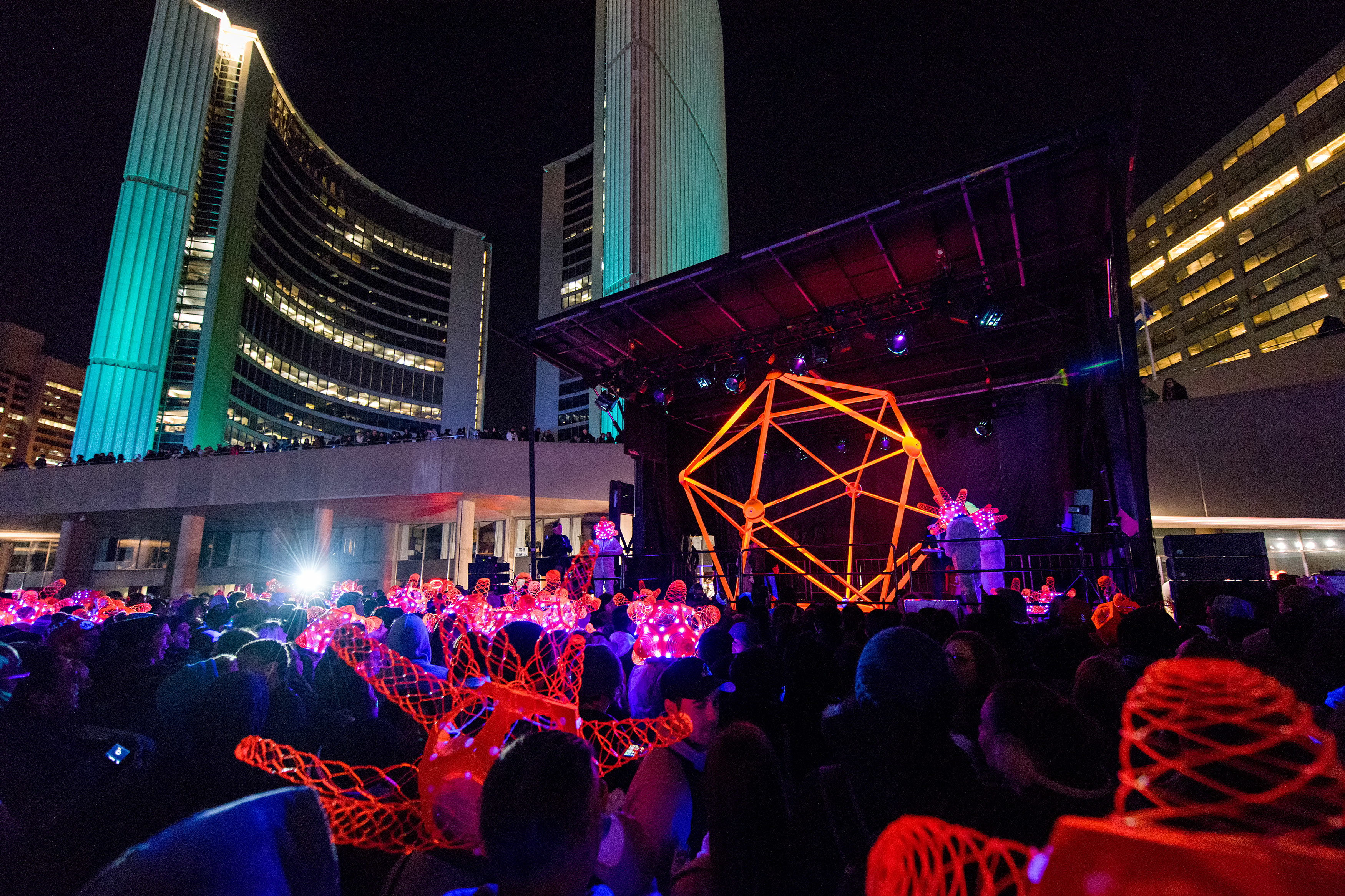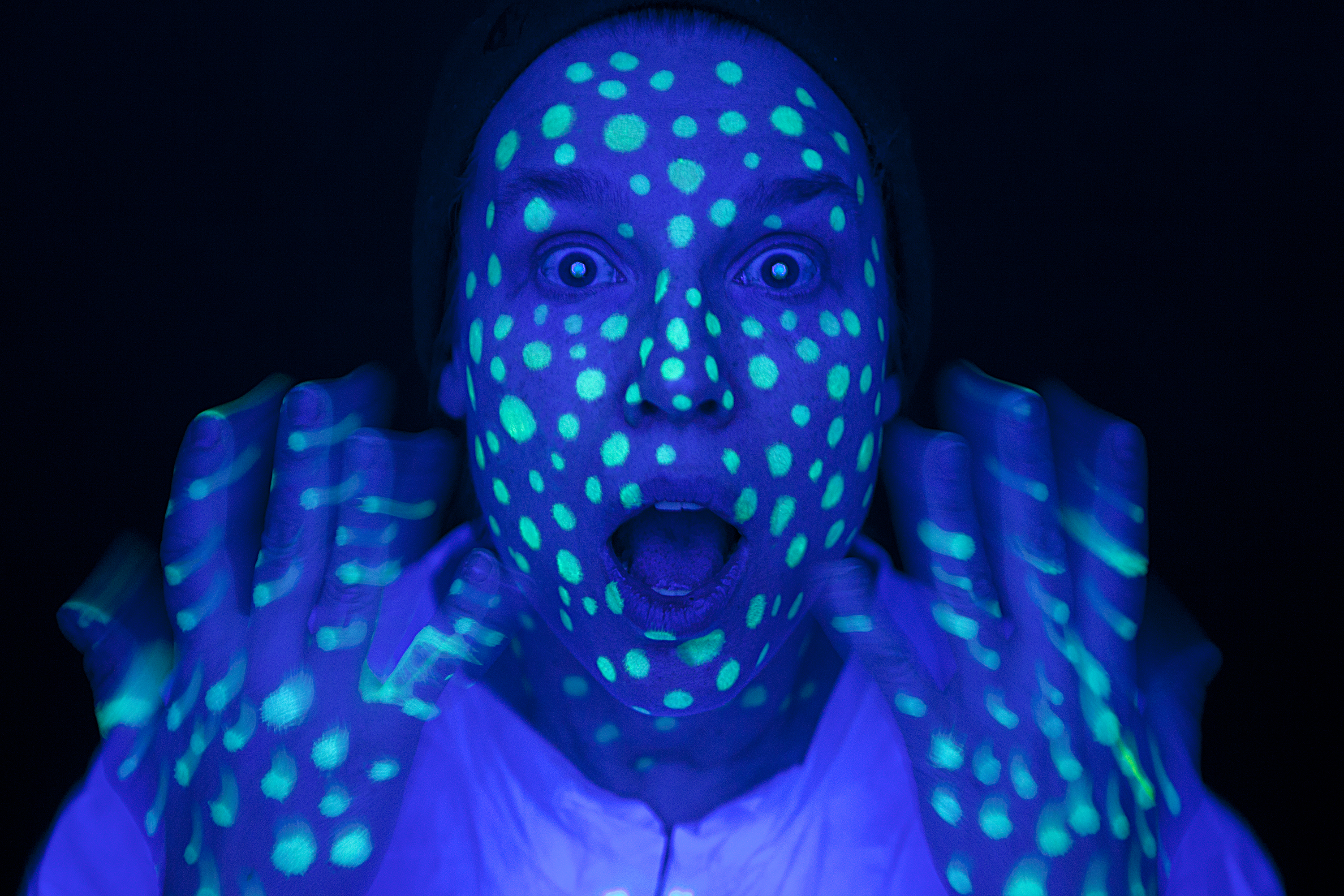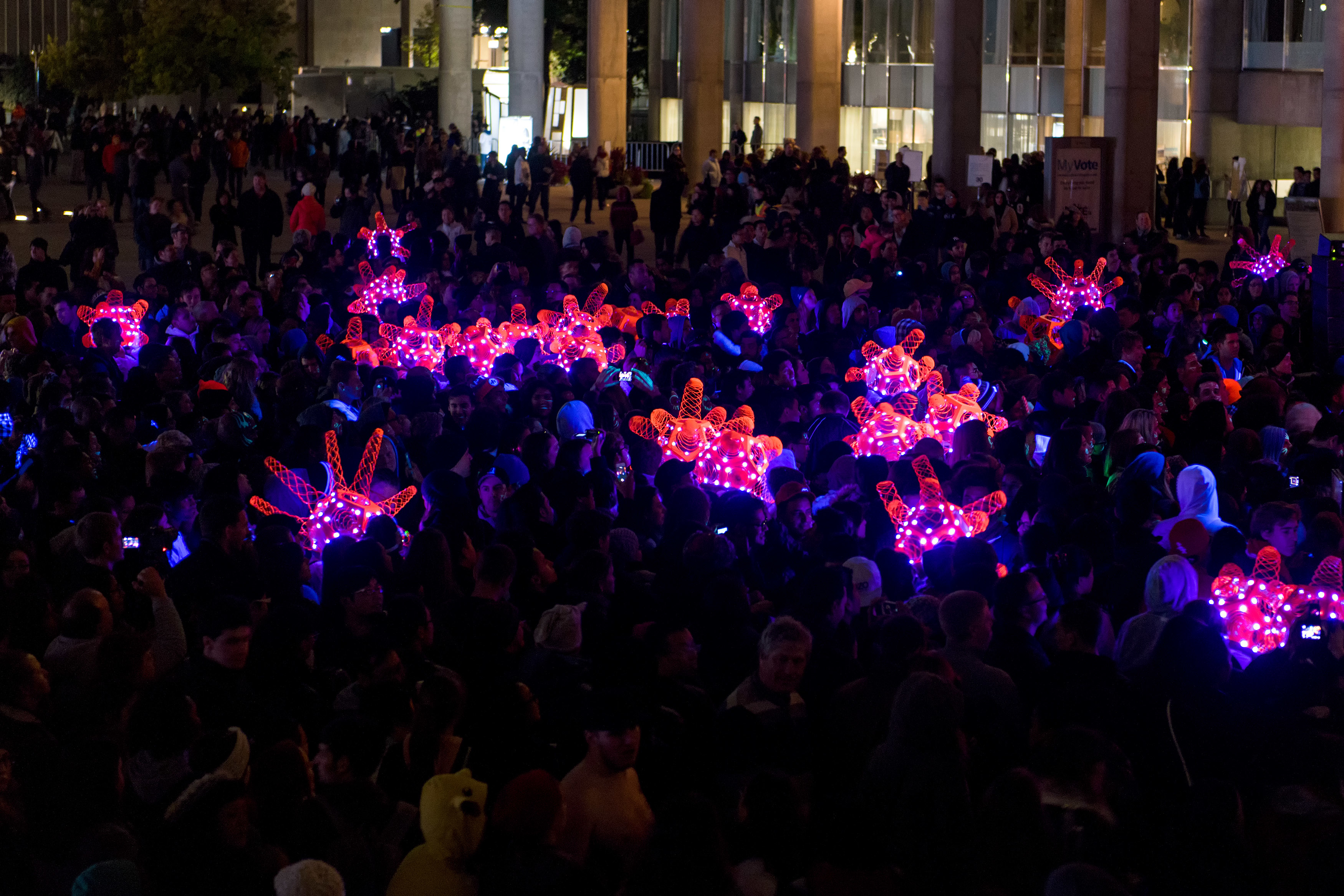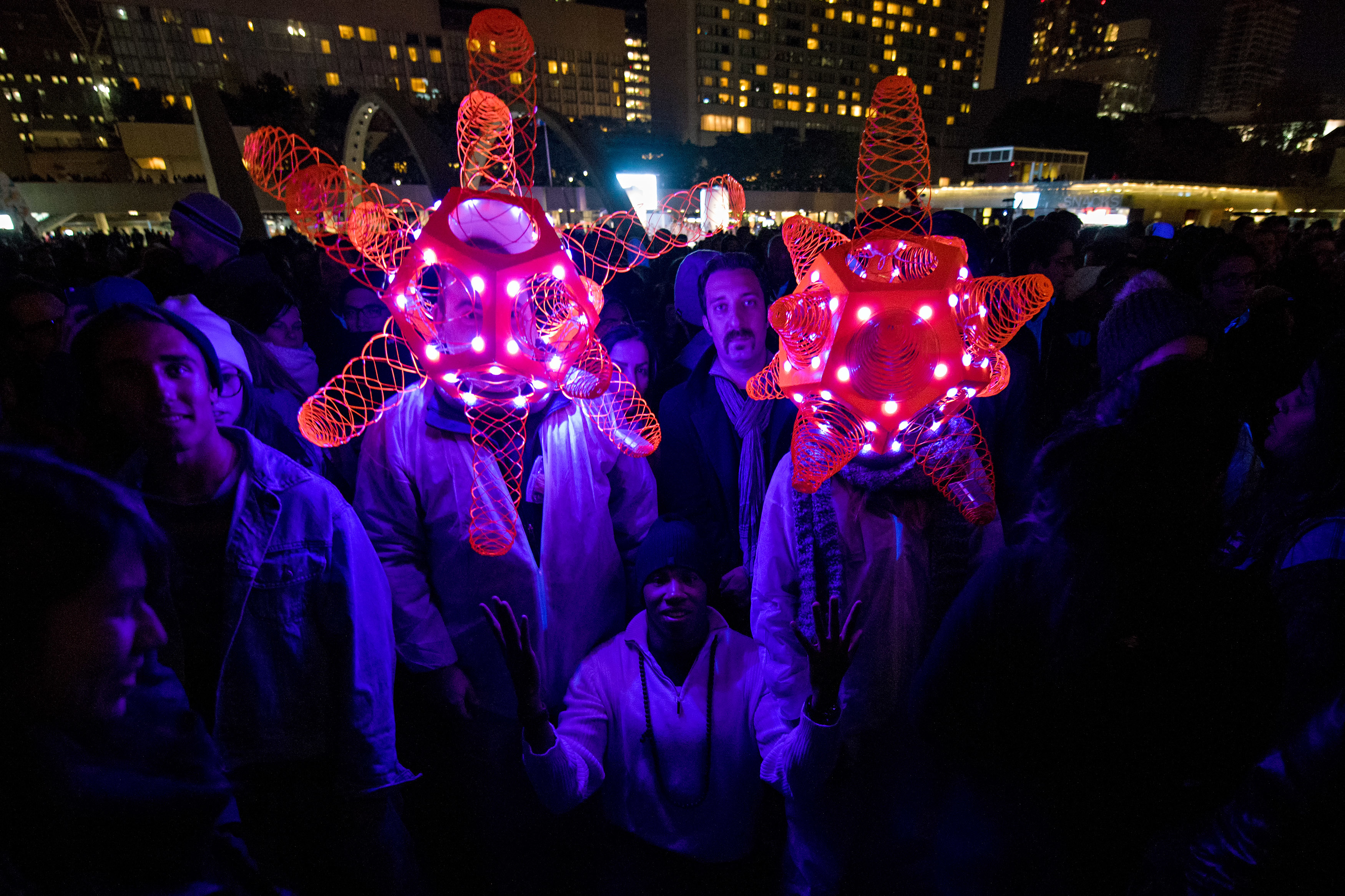 On October 6th, 2014, one hundred glowing “carriers,” dressed in fluorescent hazmat suits, wearing fluorescent LED-wired helmets in the dodecahedral geometric shape of the adenovirus [1], disperse throughout the City of Toronto during its annual Nuit Blanche overnight public art event, “infecting” festivalgoers by marking their faces and hands with “spots” “legions” and “rashes” using invisible UV-reactive ink, and distribute to them invisible UV lamps with built in reactive ink markers to go “infect” others.