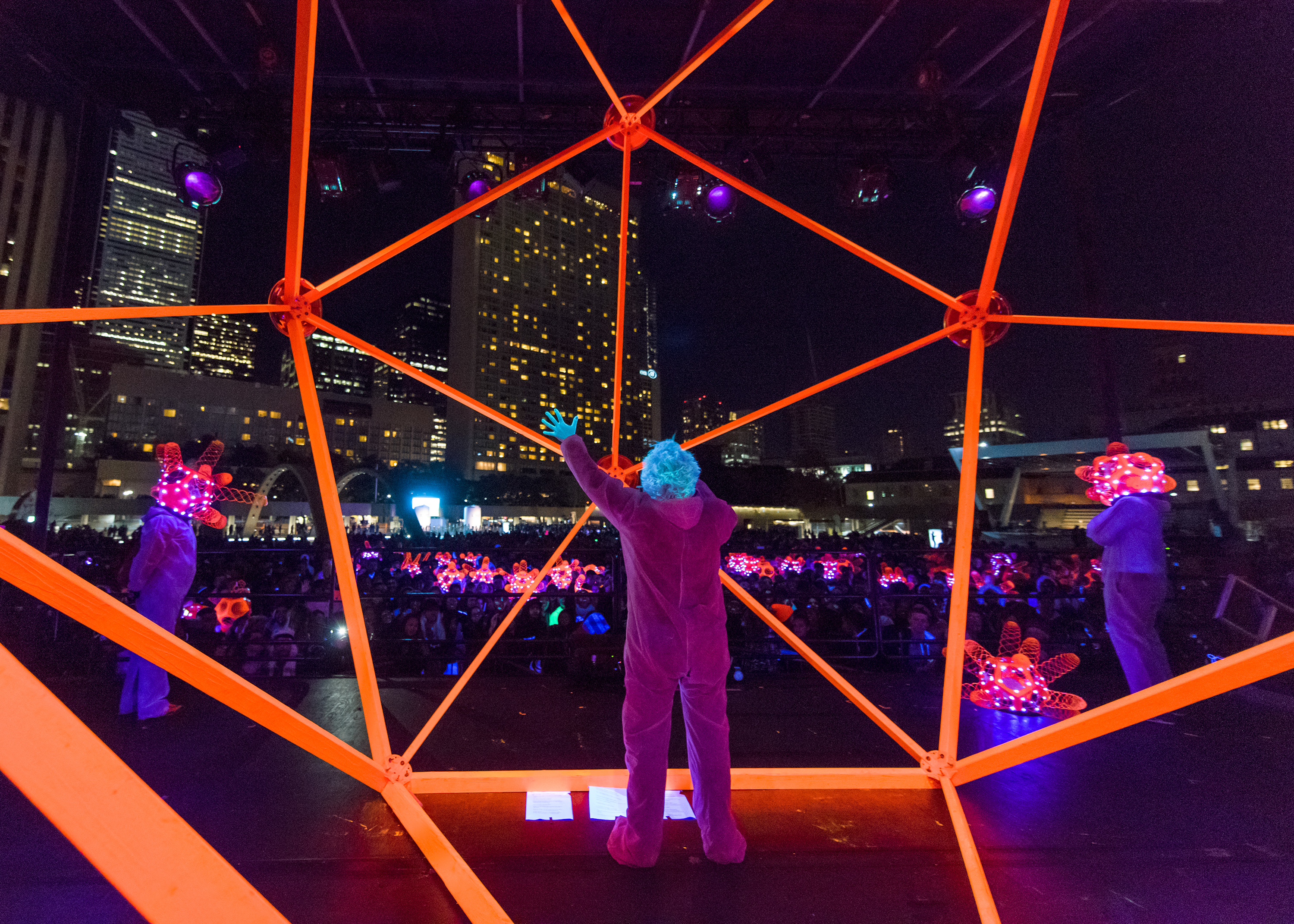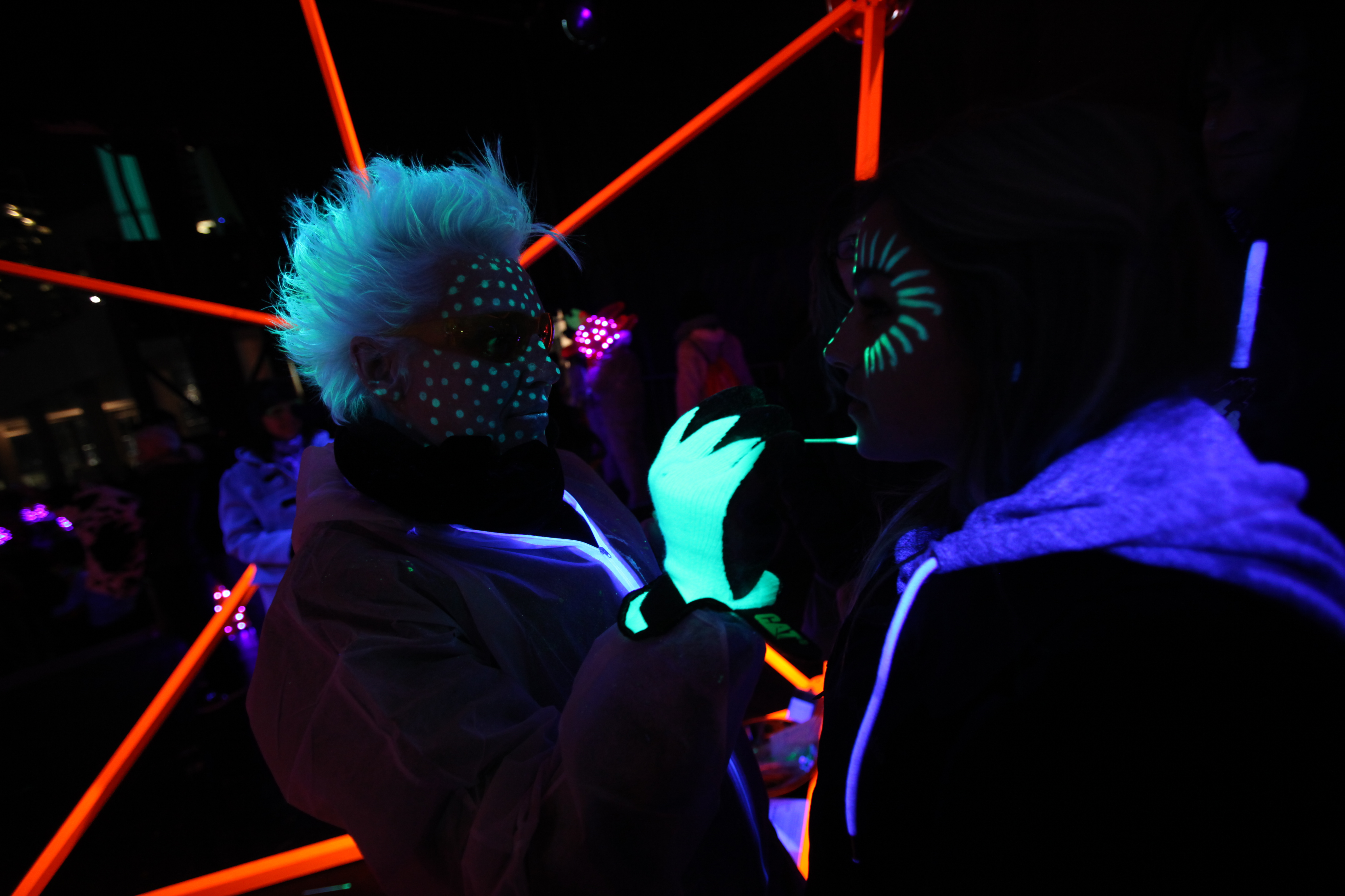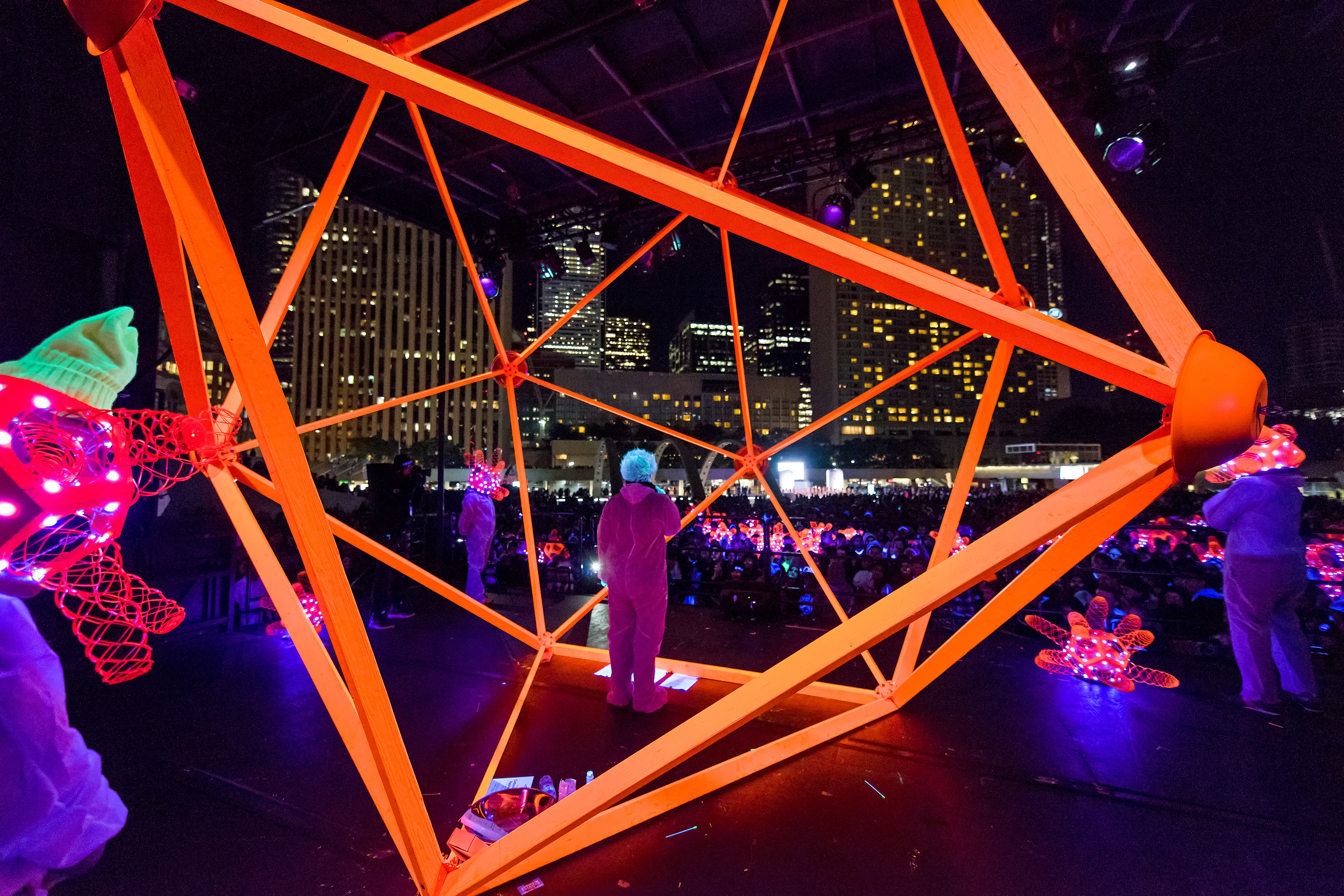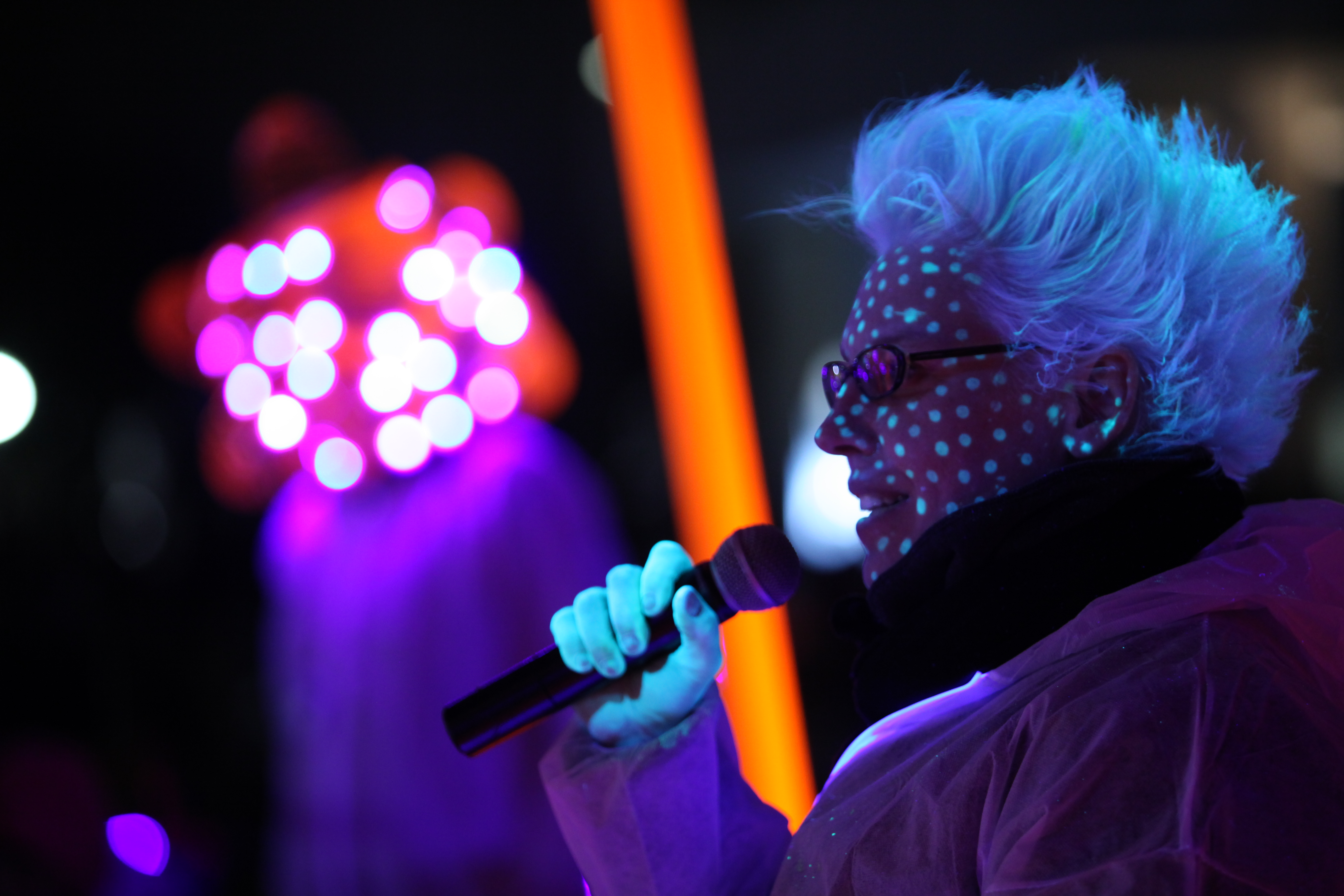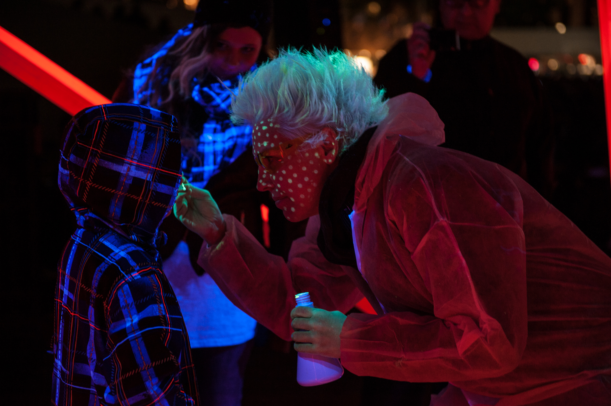 On October 6th, 2014, one hundred glowing “carriers,” dressed in fluorescent hazmat suits, wearing fluorescent LED-wired helmets in the dodecahedral geometric shape of the adenovirus [1], disperse throughout the City of Toronto during its annual Nuit Blanche overnight public art event, “infecting” festivalgoers by marking their faces and hands with “spots” “legions” and “rashes” using invisible UV-reactive ink, and distribute to them invisible UV lamps with built in reactive ink markers to go “infect” others.
