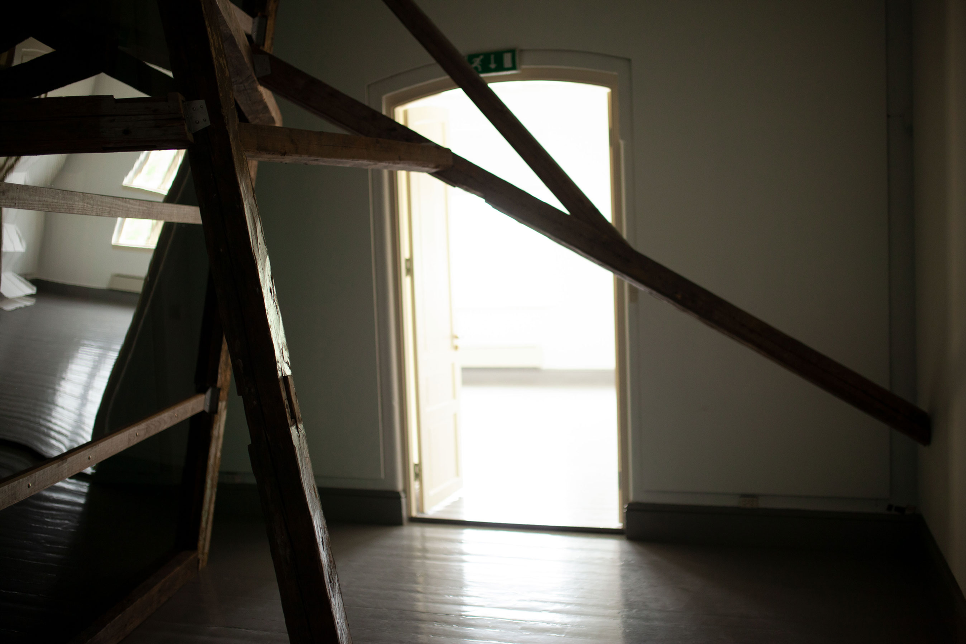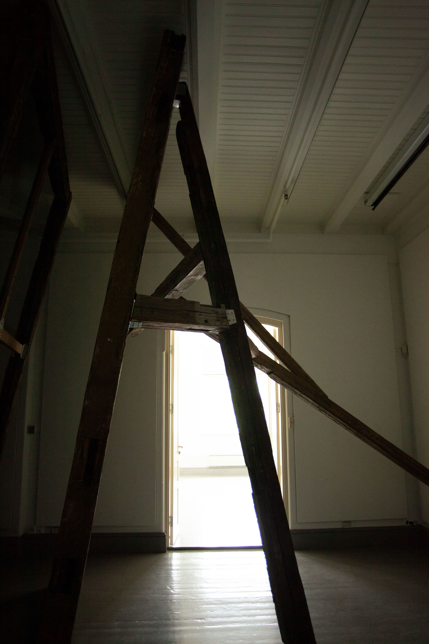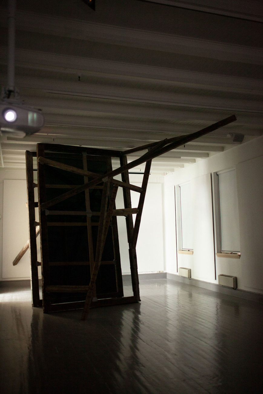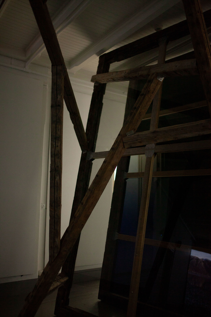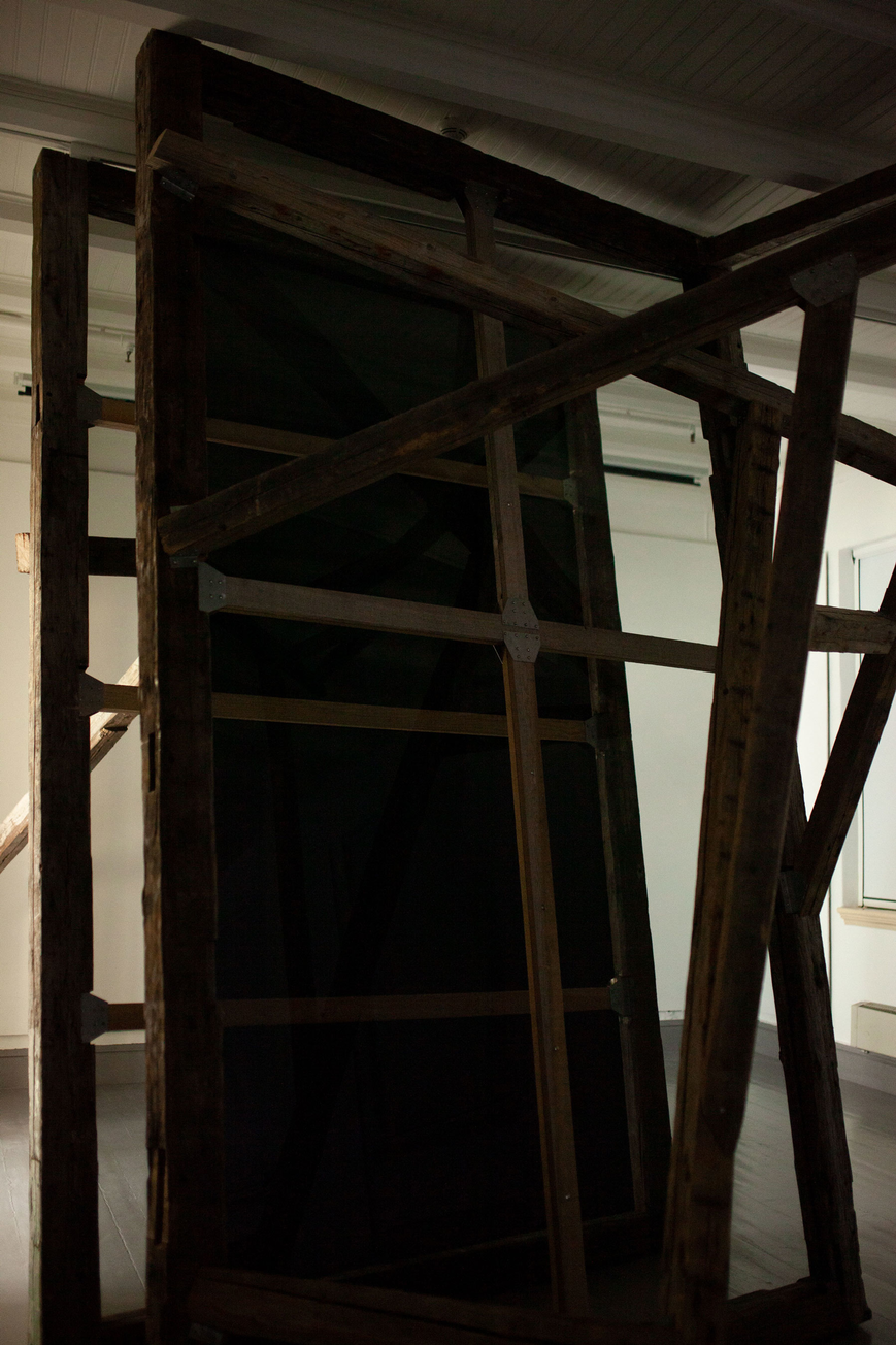 reclaimed hand carved wooden beams, bespoke steel brackets, sheets of acrylic, polarising filtre. Dimensions: 4 x 6 x 2 m