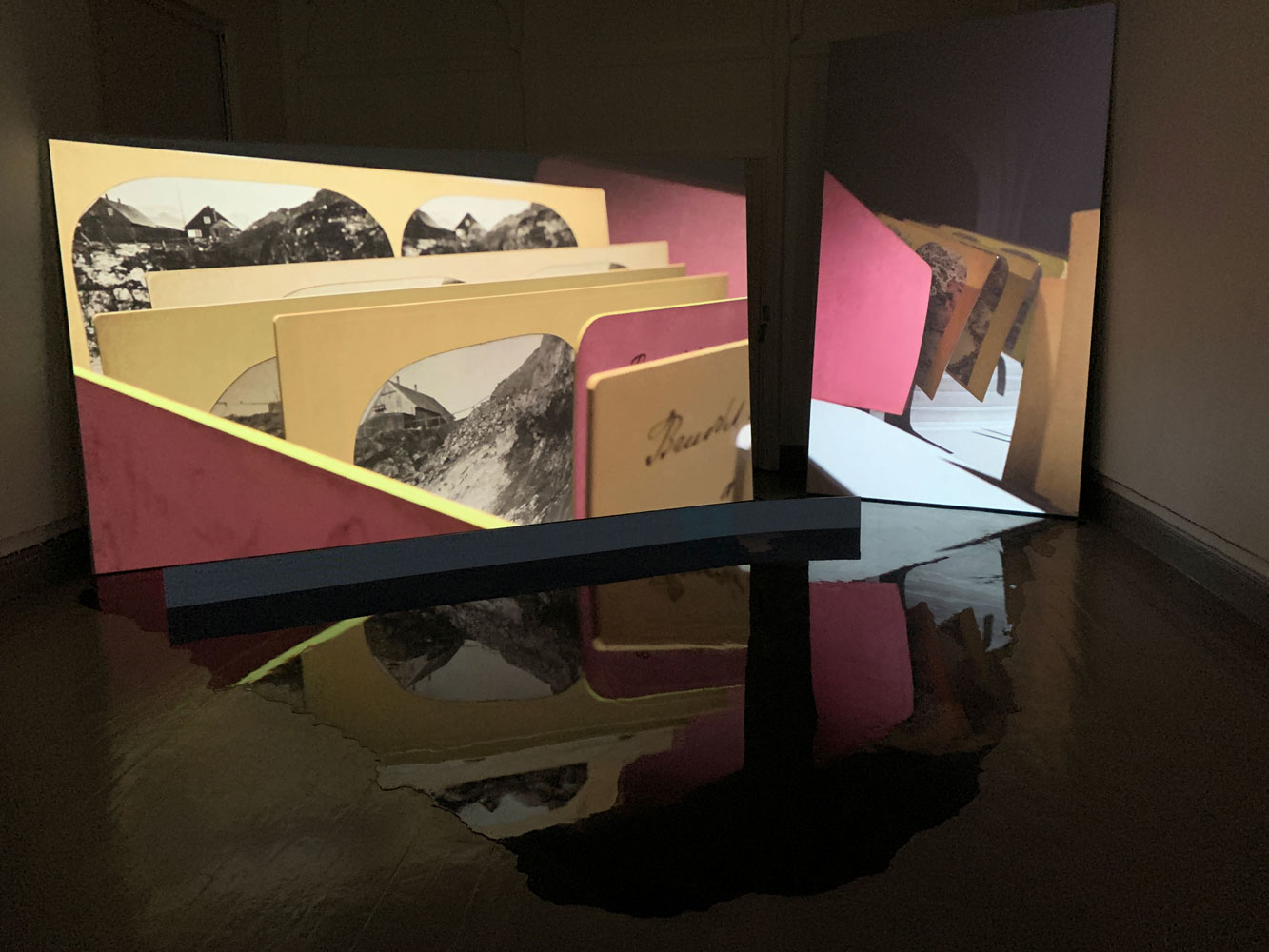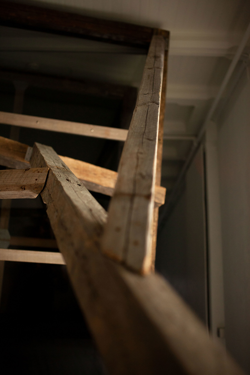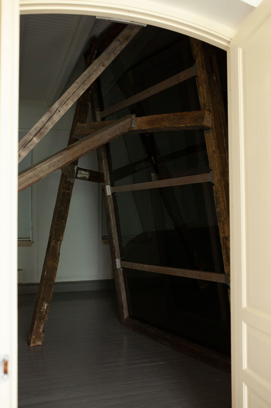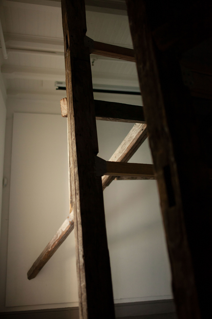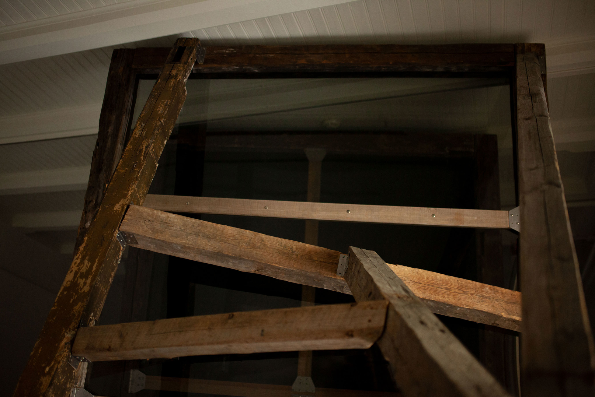 reclaimed hand carved wooden beams, bespoke steel brackets, sheets of acrylic, polarising filtre. Dimensions: 4 x 6 x 2 m