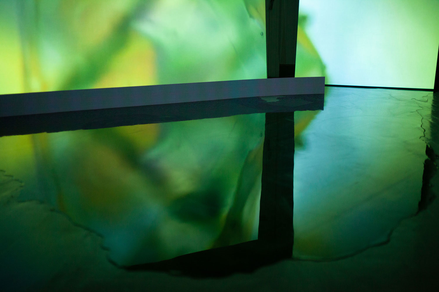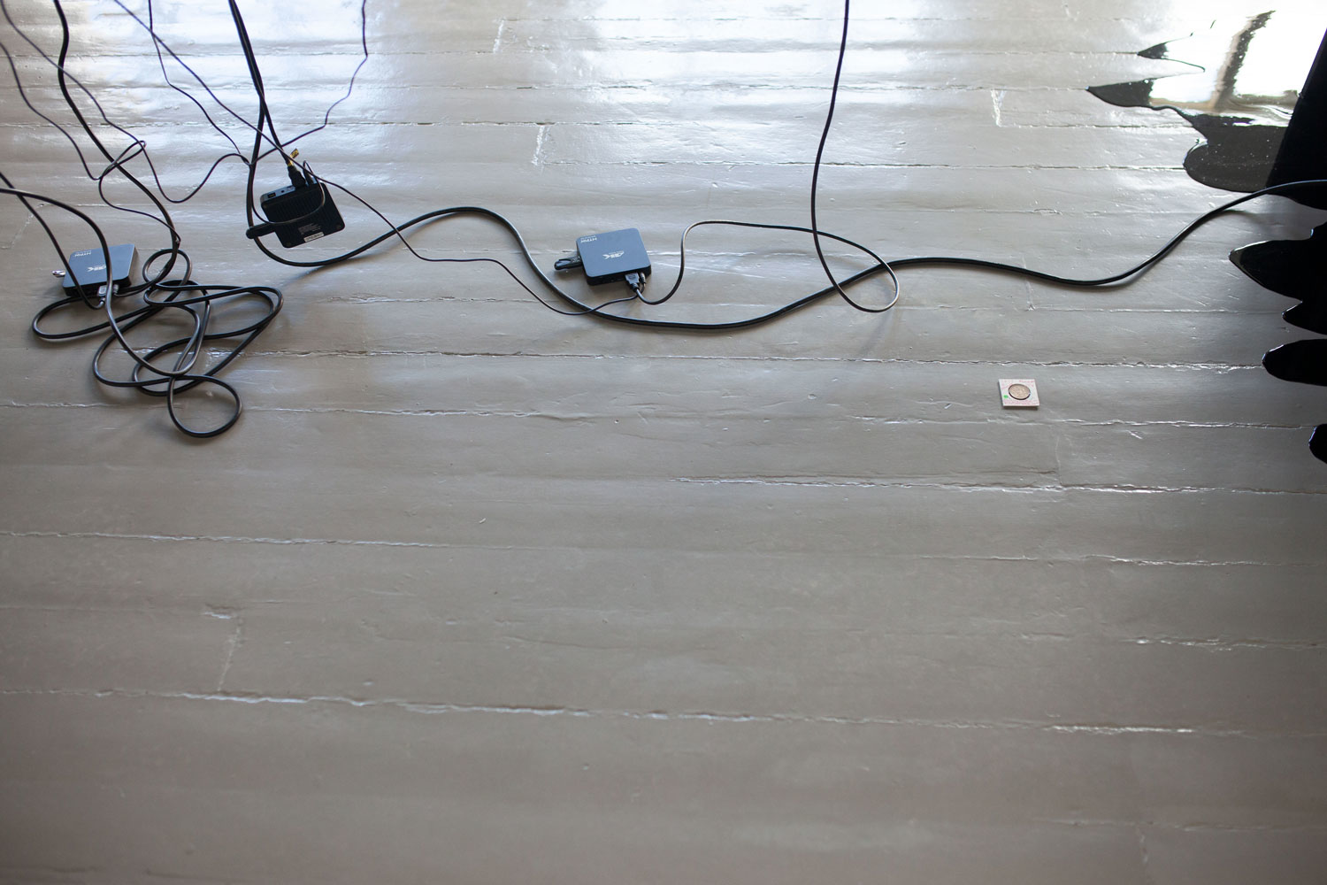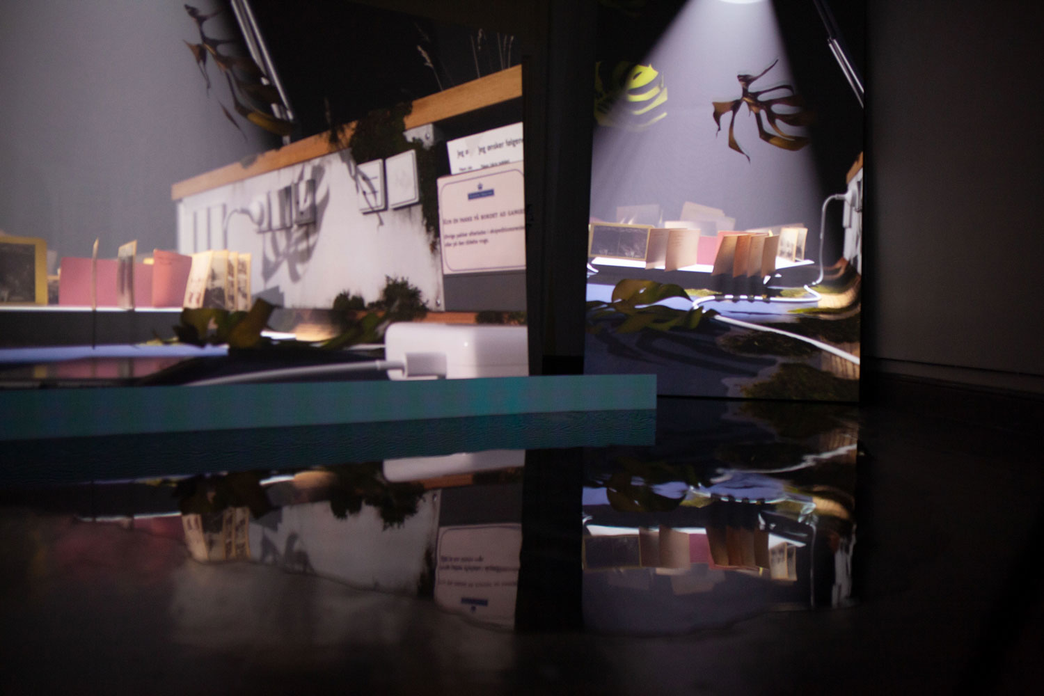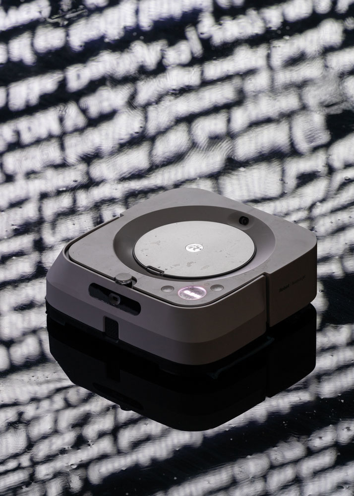4 – Half Hidden is a two channel video installation, incl. epoxy puddles, subtitles on LED panel, a robot mop and the large sculpture Polarizer.