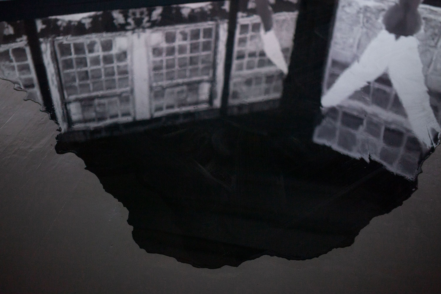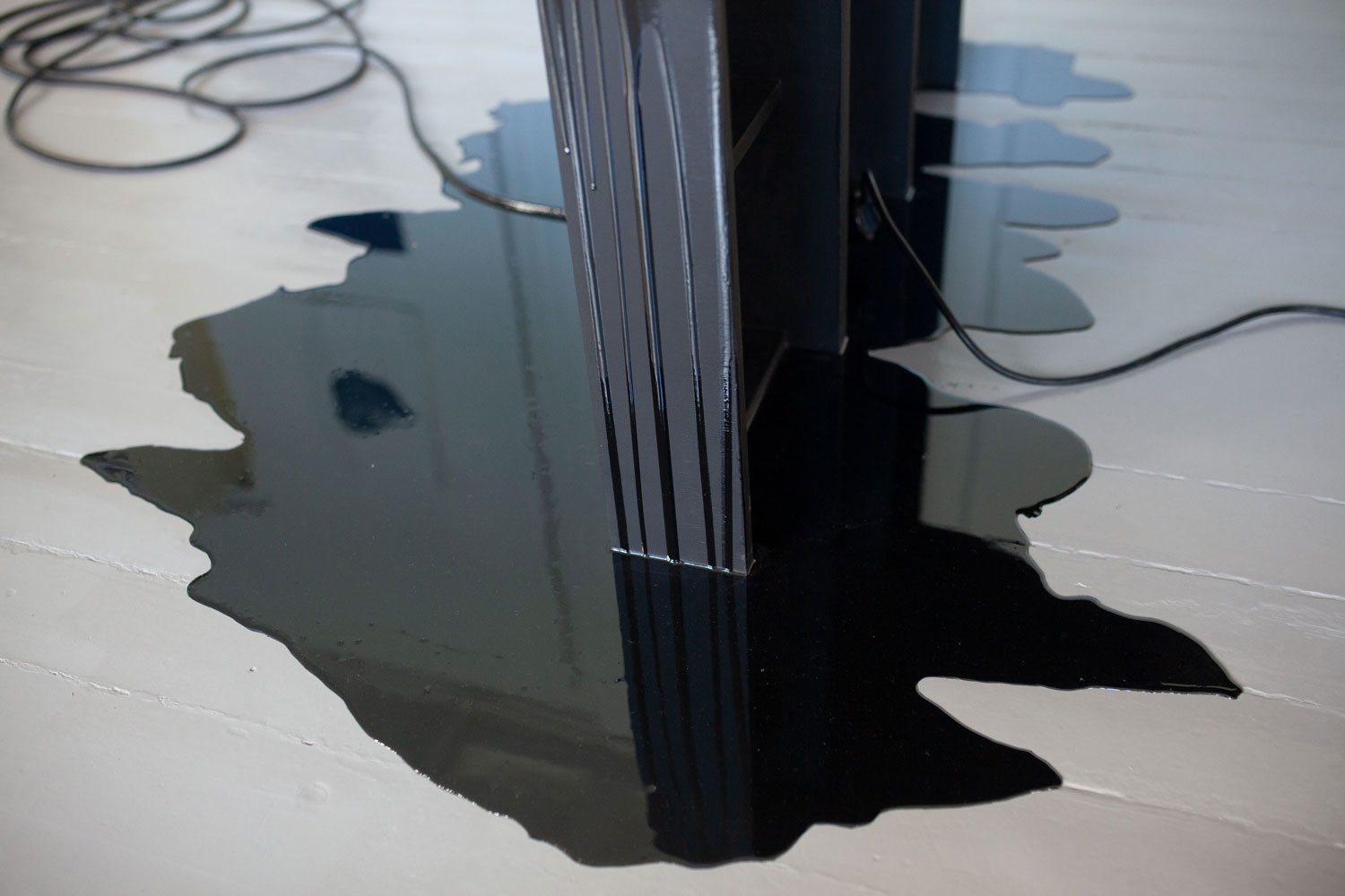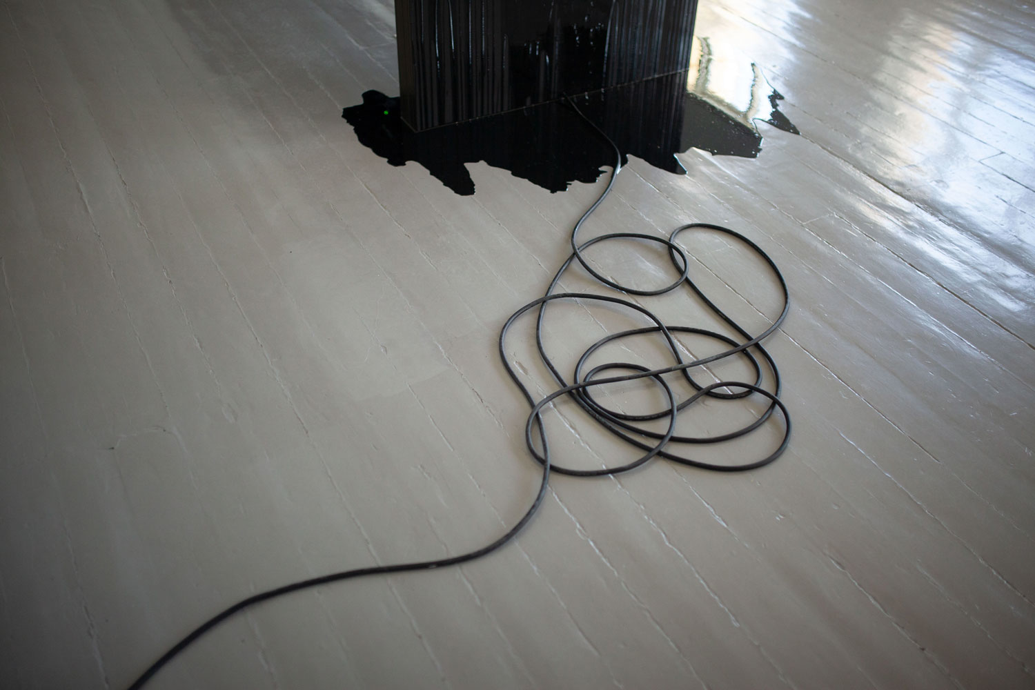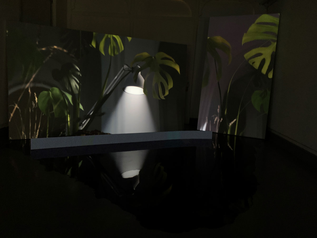 4 – Half Hidden is a two channel video installation, incl. epoxy puddles, subtitles on LED panel, a robot mop and the large sculpture Polarizer.