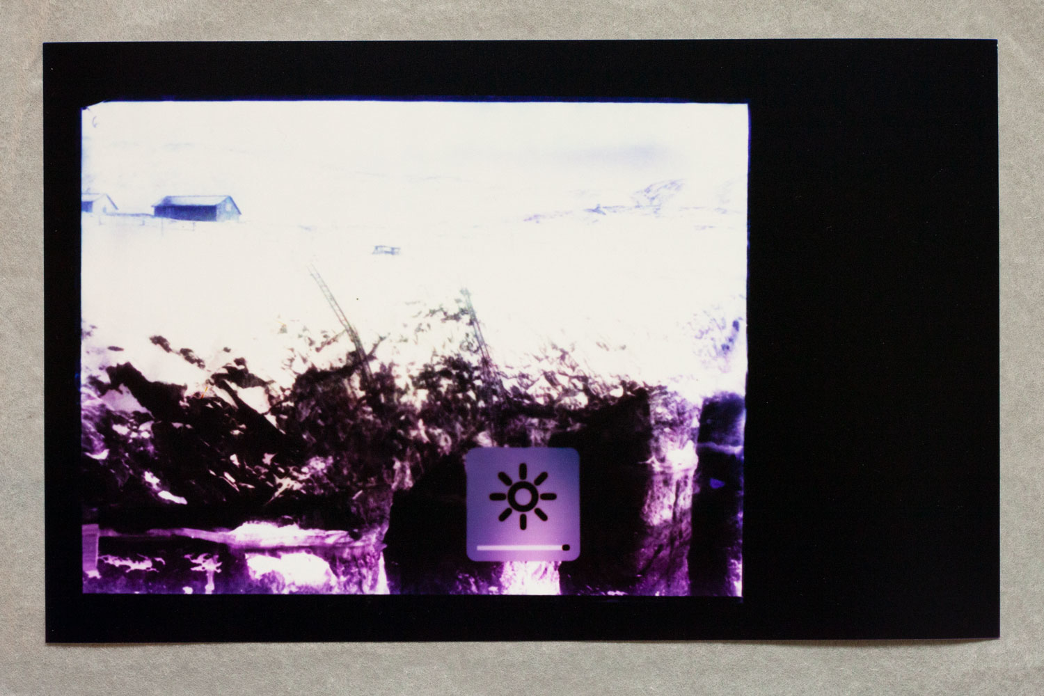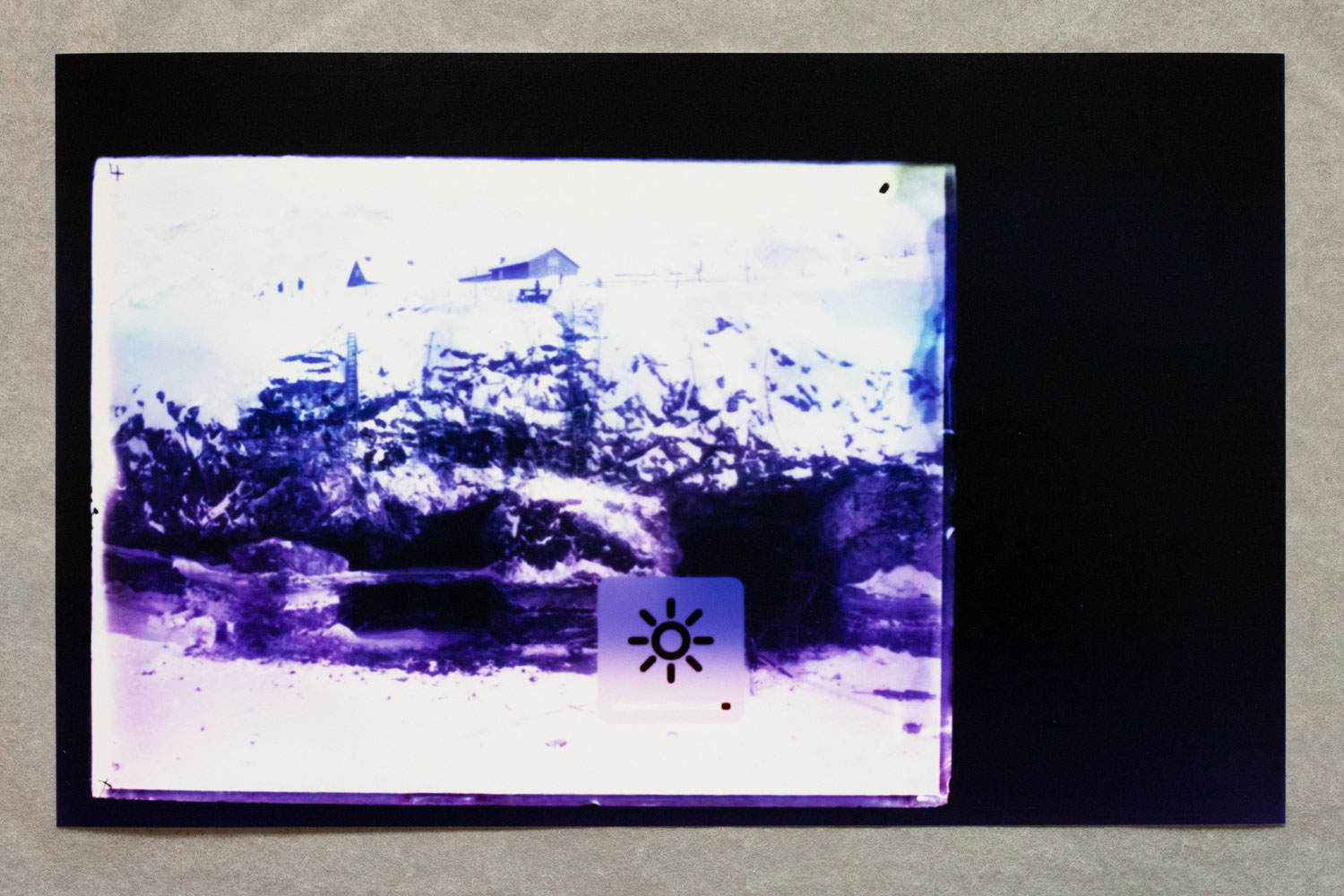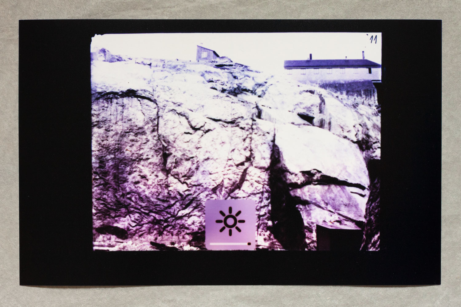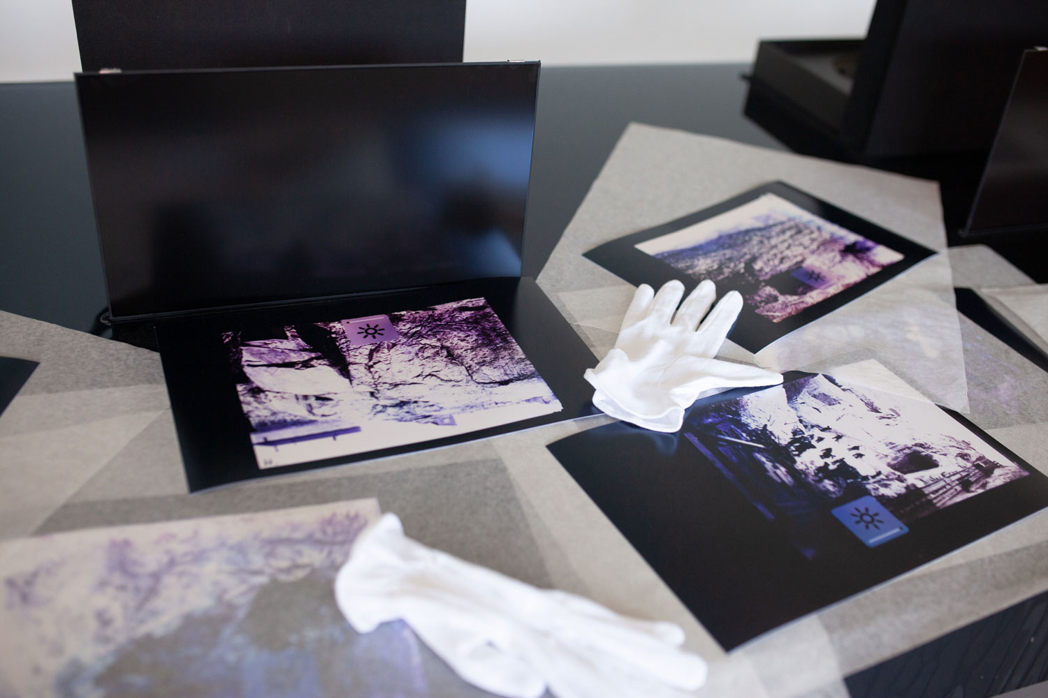 1 – Archive of Uncertainties is a group of works: a series of 14 photograms: Imperial Cabinet Card on MacBook Pro and 4 archive boxes: Orsugiaq, Kryolith, Mine- og Handels-Selskabet, The Fidgety Ones Were Here, and Polar Bear and Pick Axes.
