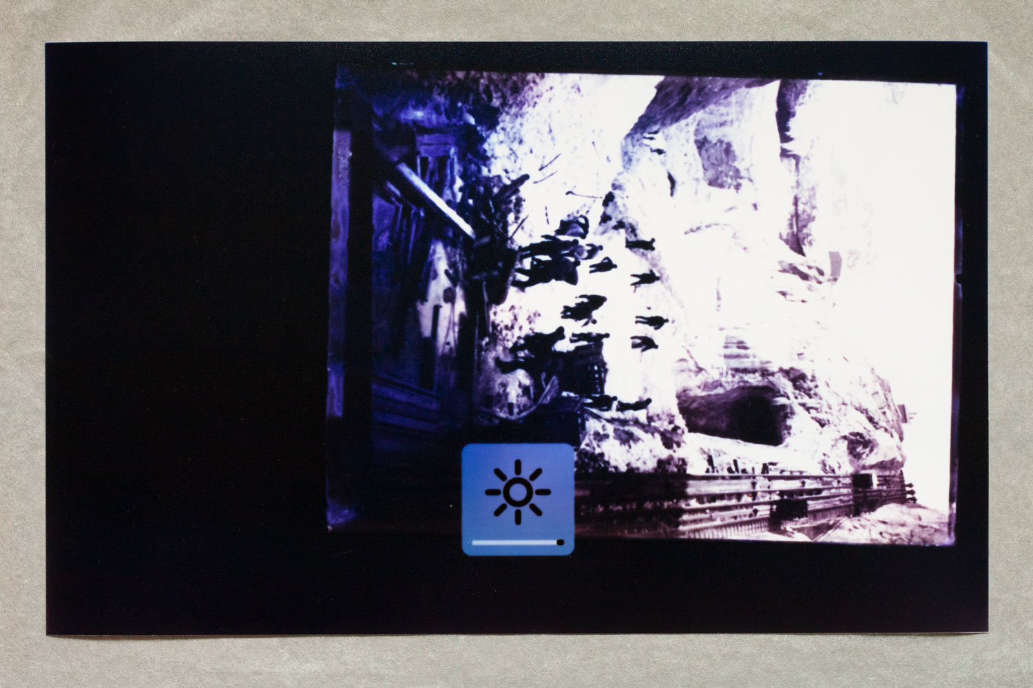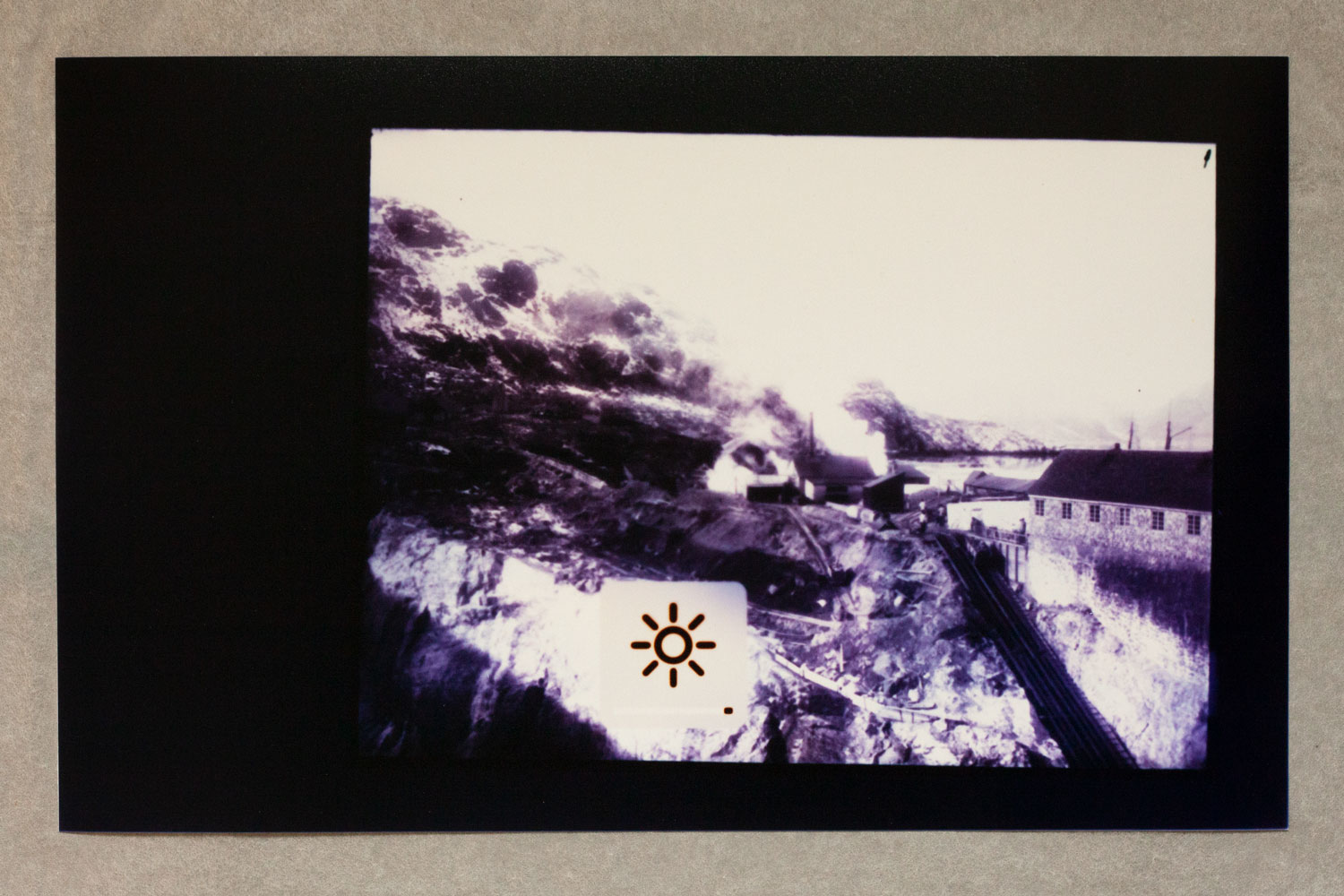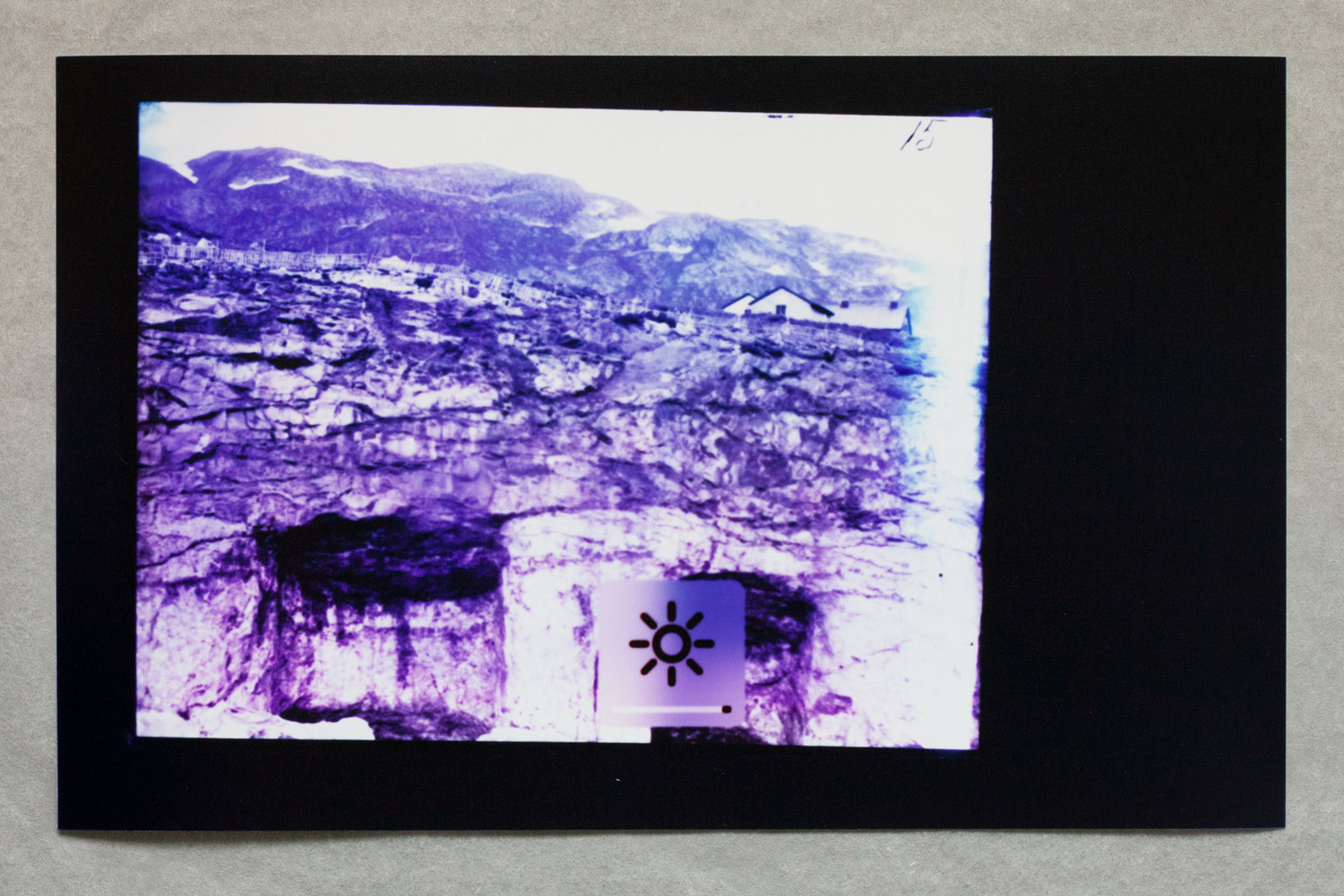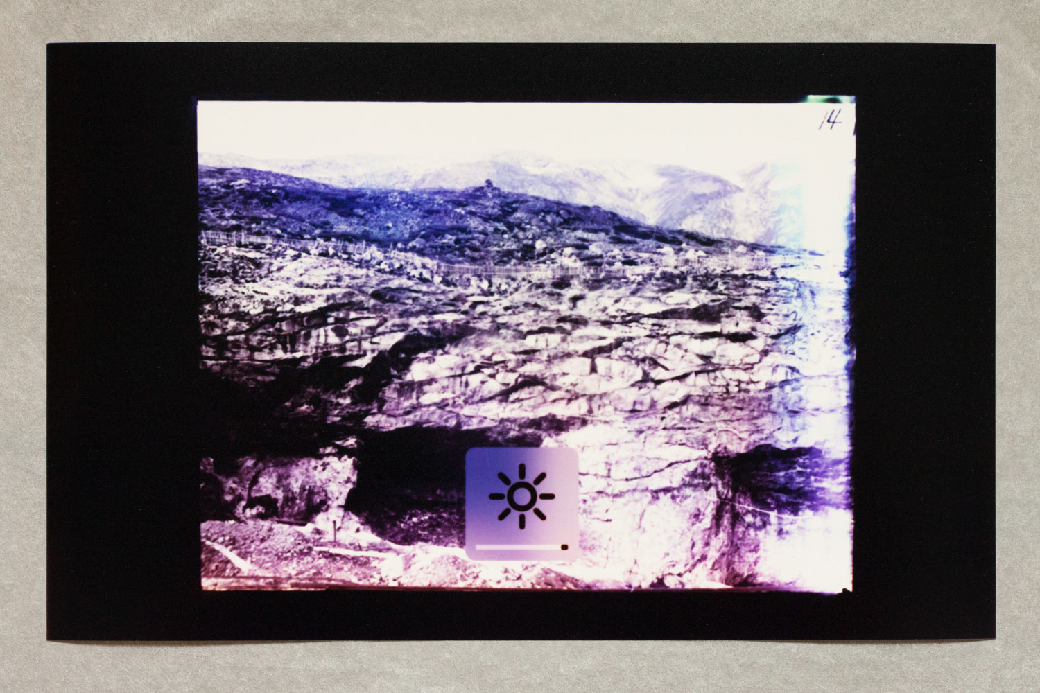 1 – Archive of Uncertainties is a group of works: a series of 14 photograms: Imperial Cabinet Card on MacBook Pro and 4 archive boxes: Orsugiaq, Kryolith, Mine- og Handels-Selskabet, The Fidgety Ones Were Here, and Polar Bear and Pick Axes.