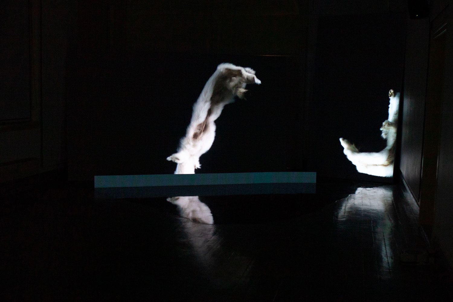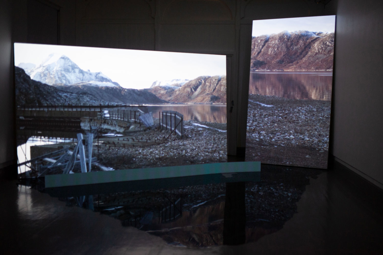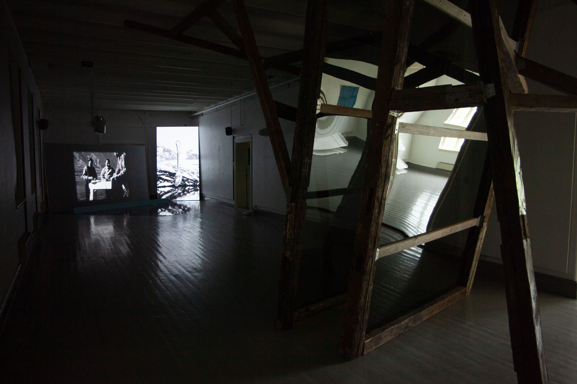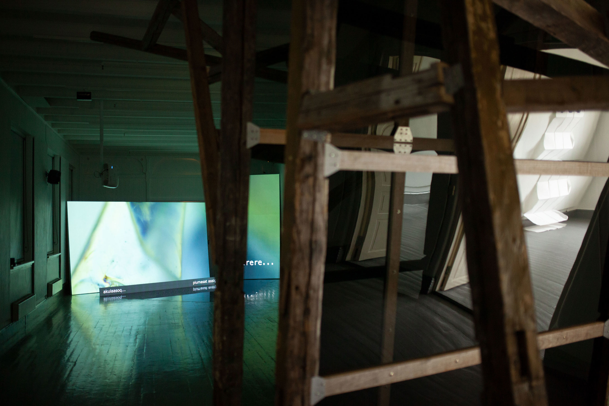 On this page documentation of the video installation Half Hidden is included in the form of two recordings of the videos installed in Tromsø Kunstforening – one cycle with subtitles in English and one with subtitles in Greenlandic (they alternate: two English cycles and one Greenlandic pr hour).