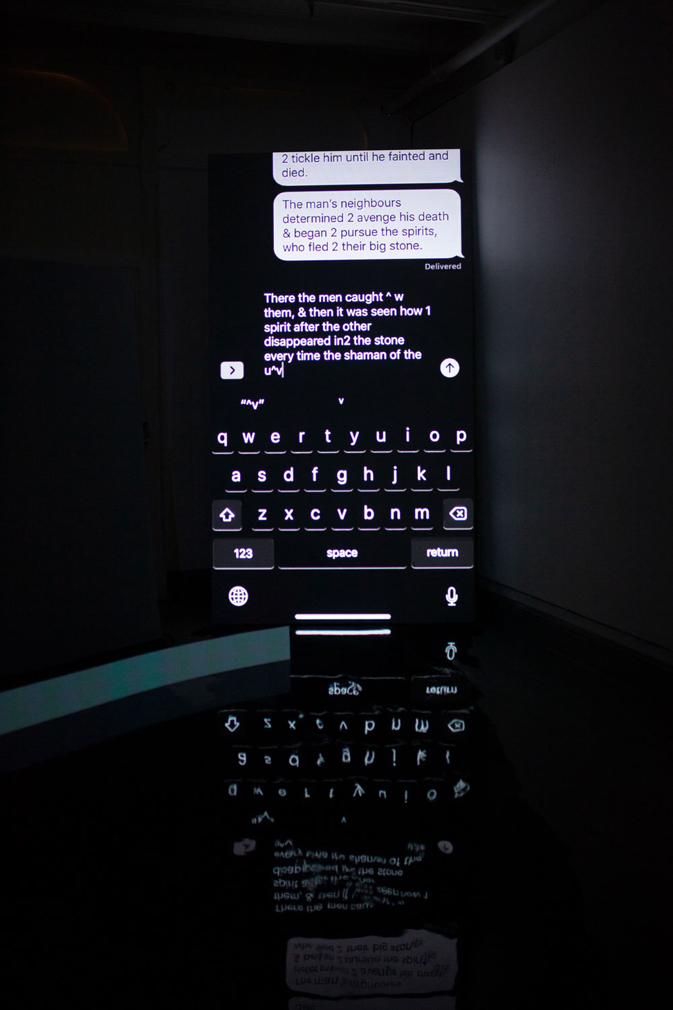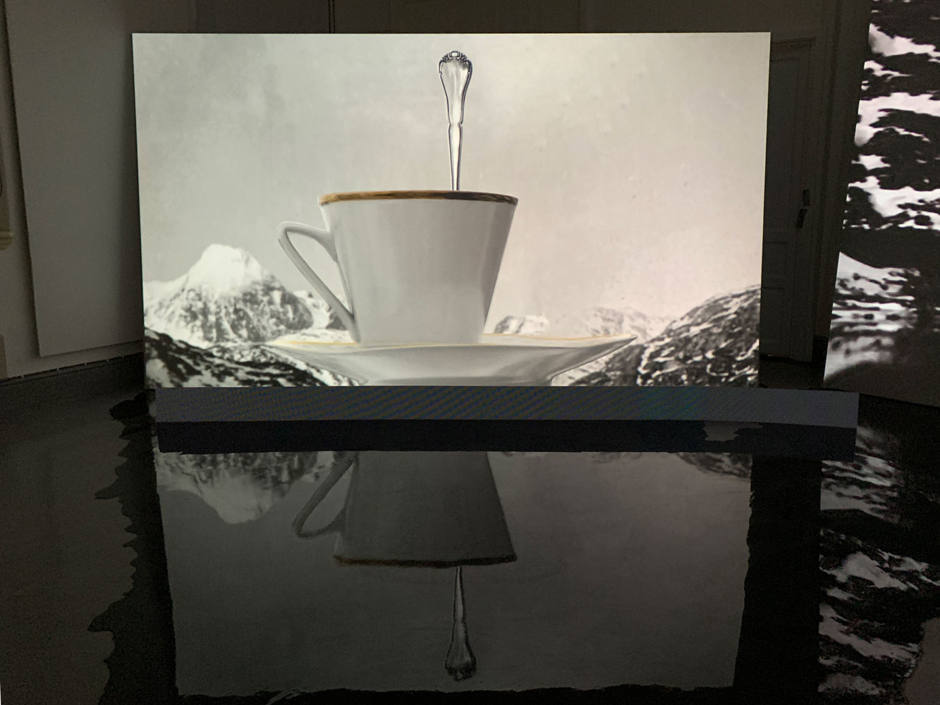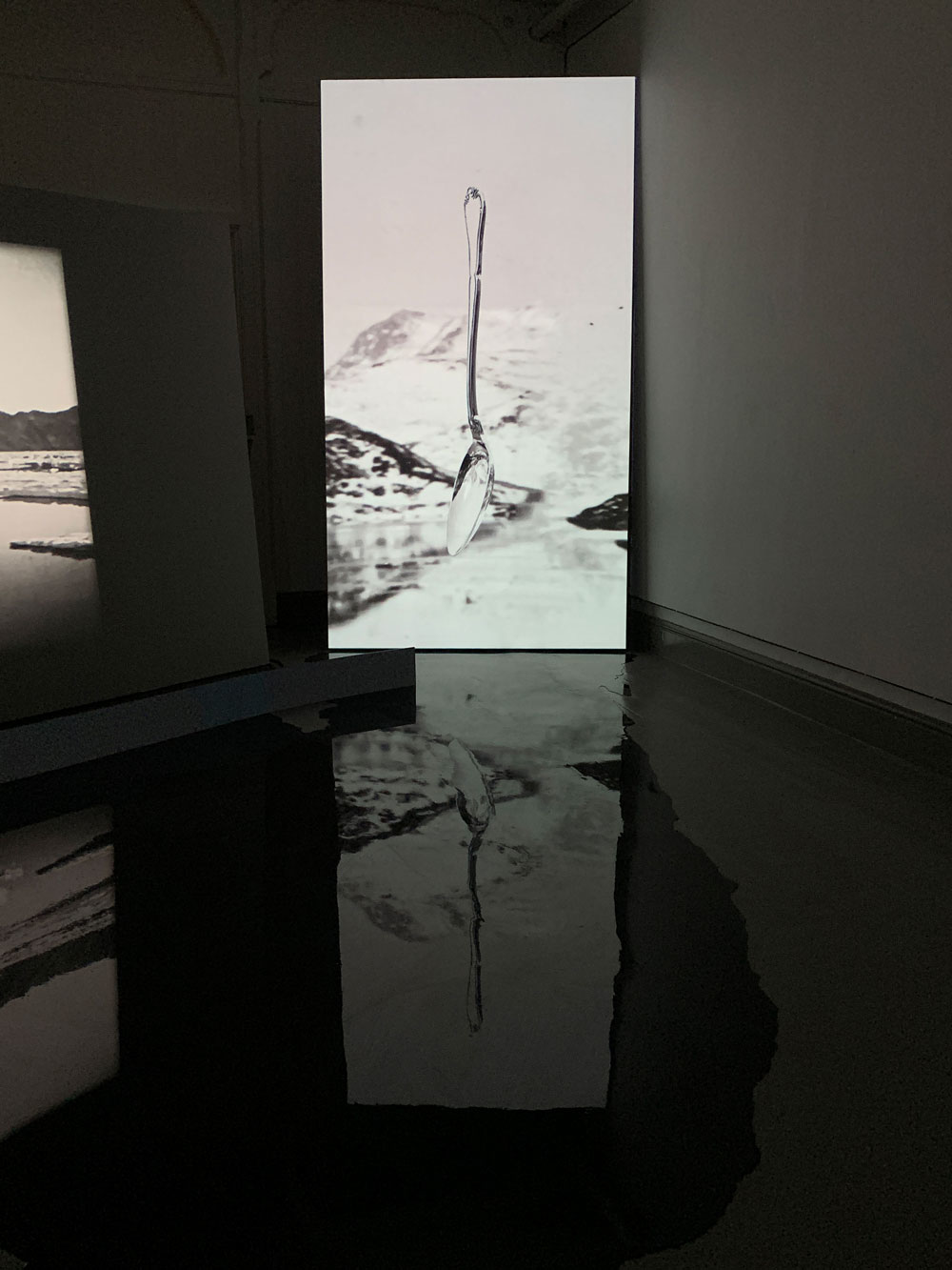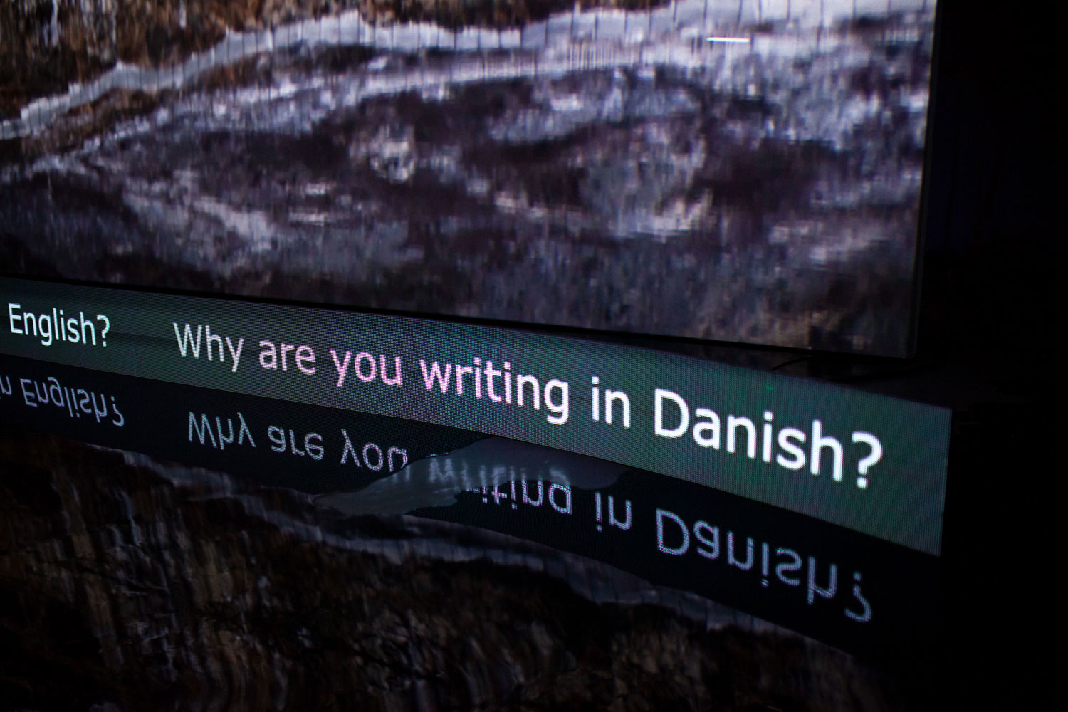 2 channel video installation. Duration: 18 min on loop. Epoxy, LED panel w subtitles in English and Greenlandic, robot mop.