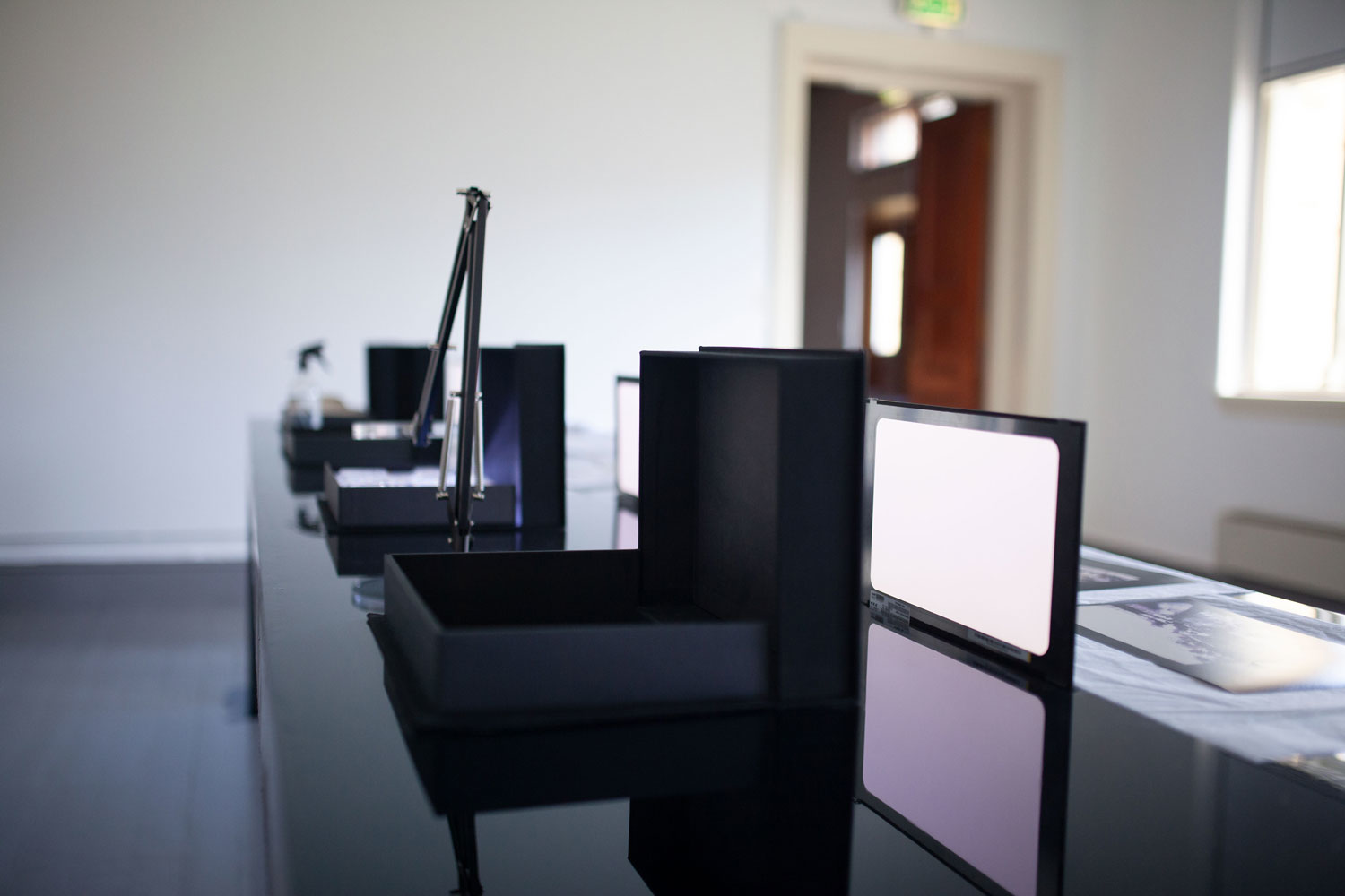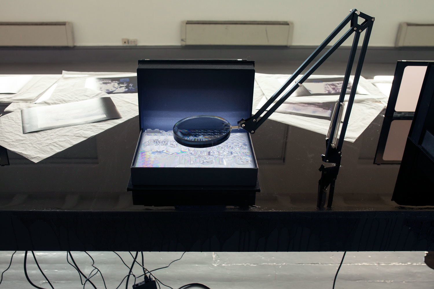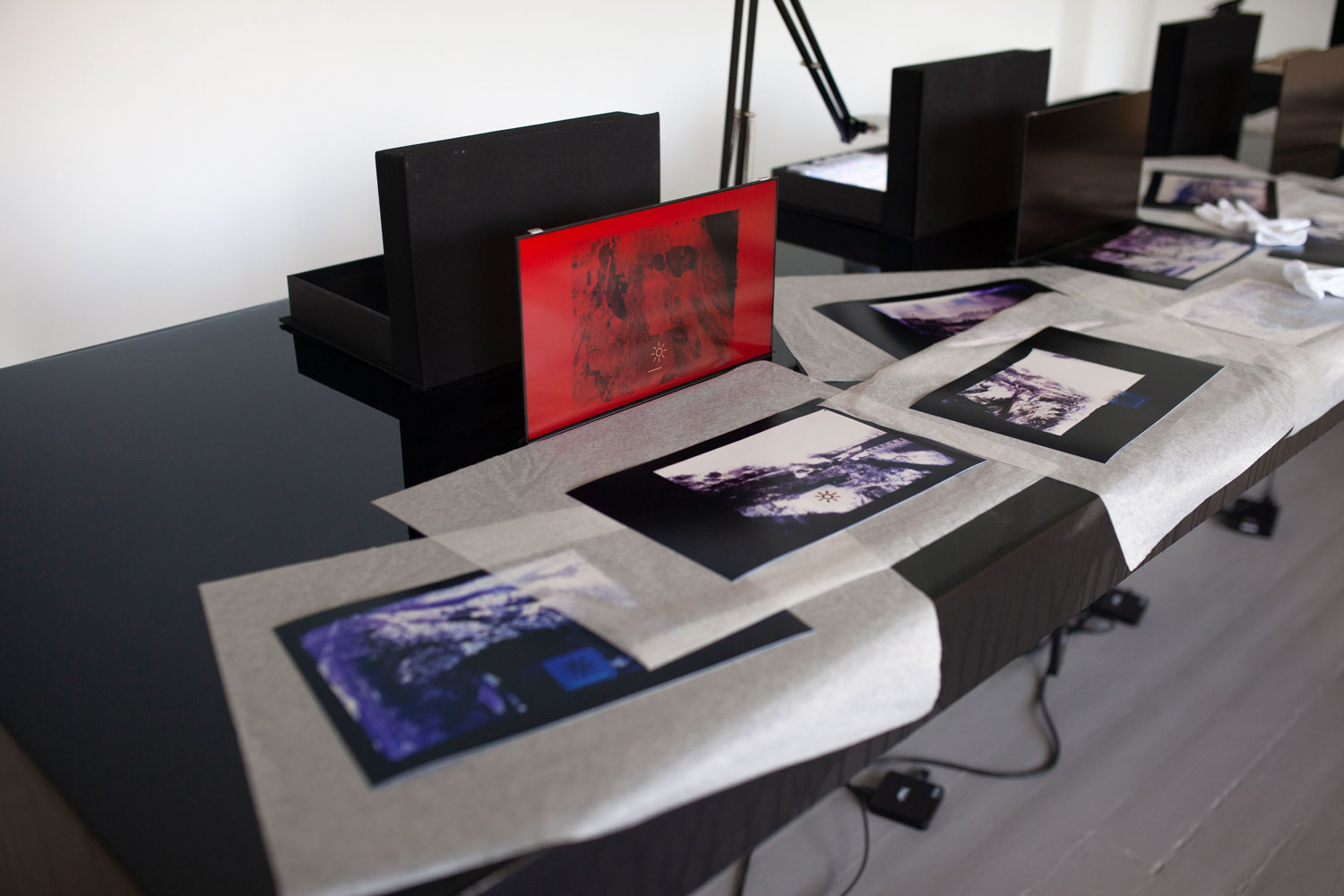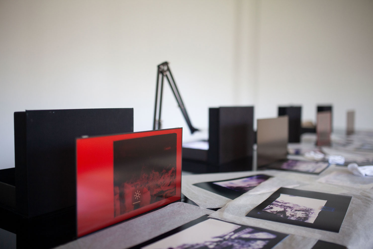 plywood, epoxy, LCD screens, cables, 14 photograms, 4 archive boxes. Dimensions: 500 x 100 x 130 cm