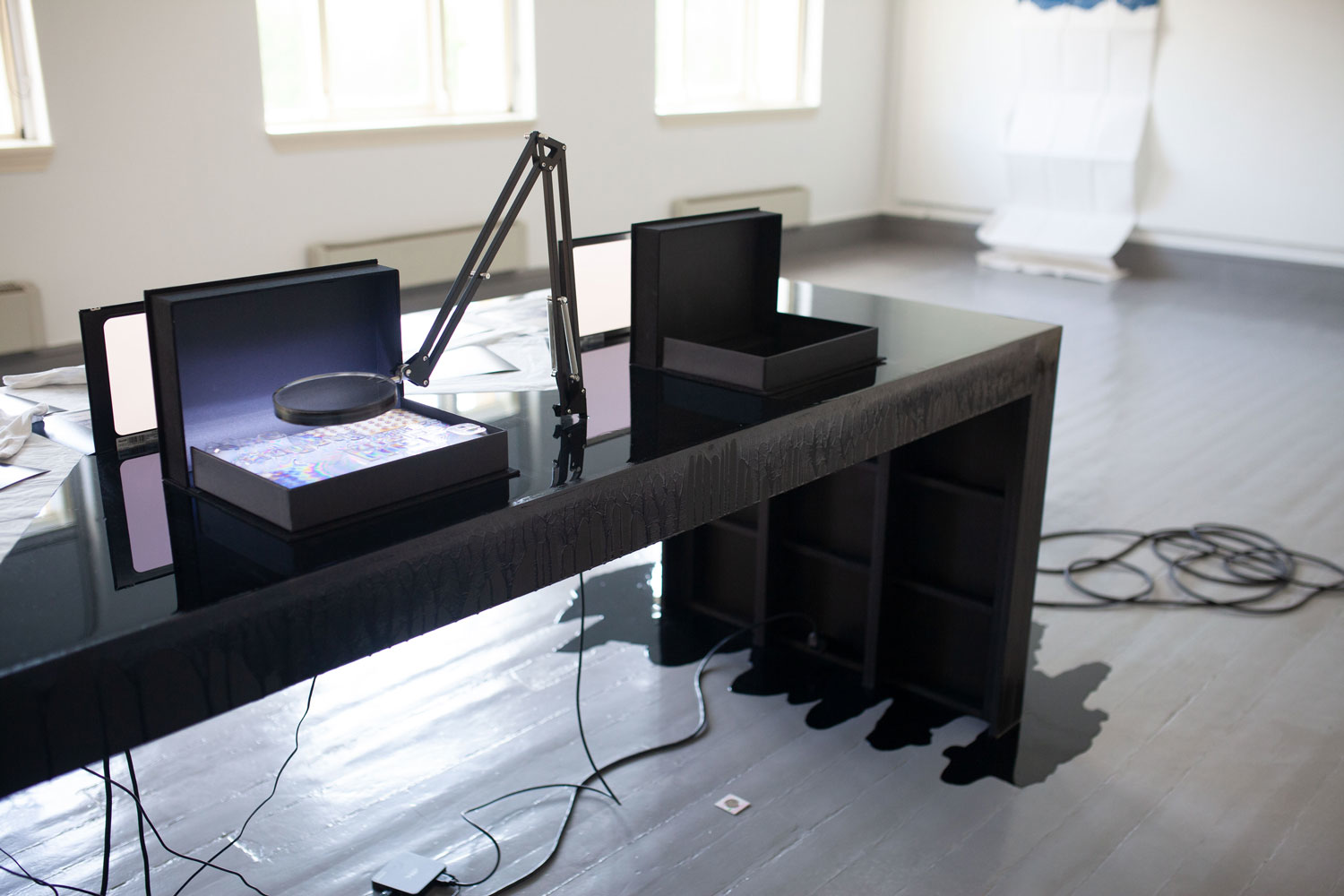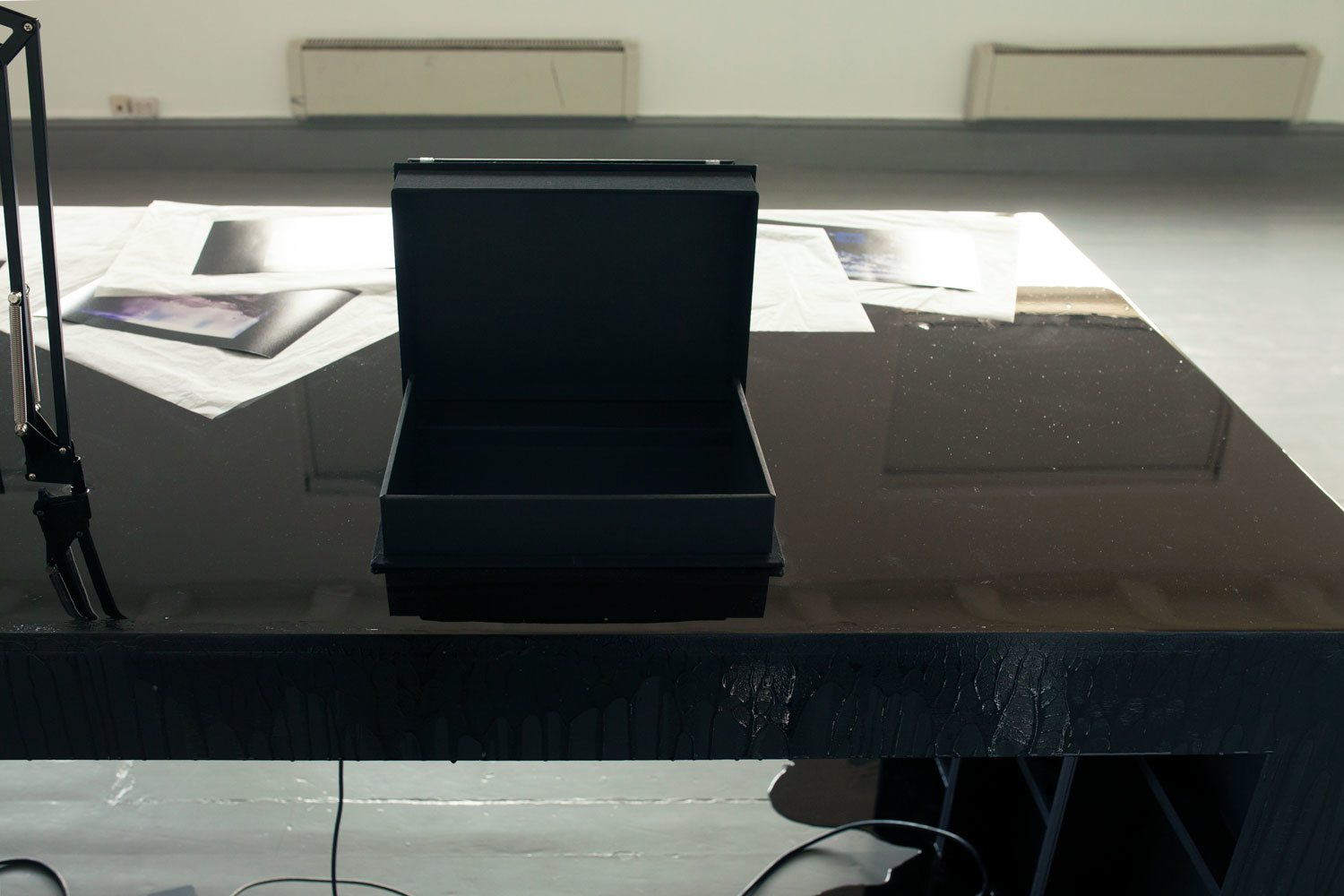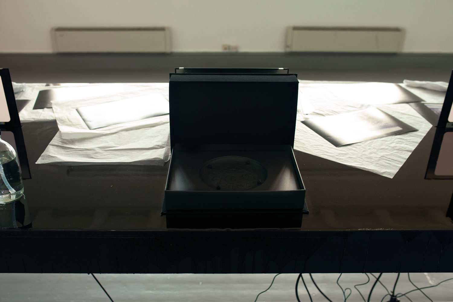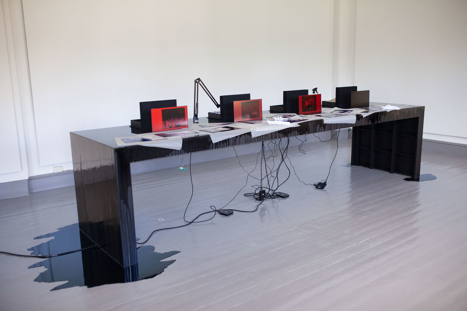 plywood, epoxy, LCD screens, cables, 14 photograms, 4 archive boxes. Dimensions: 500 x 100 x 130 cm