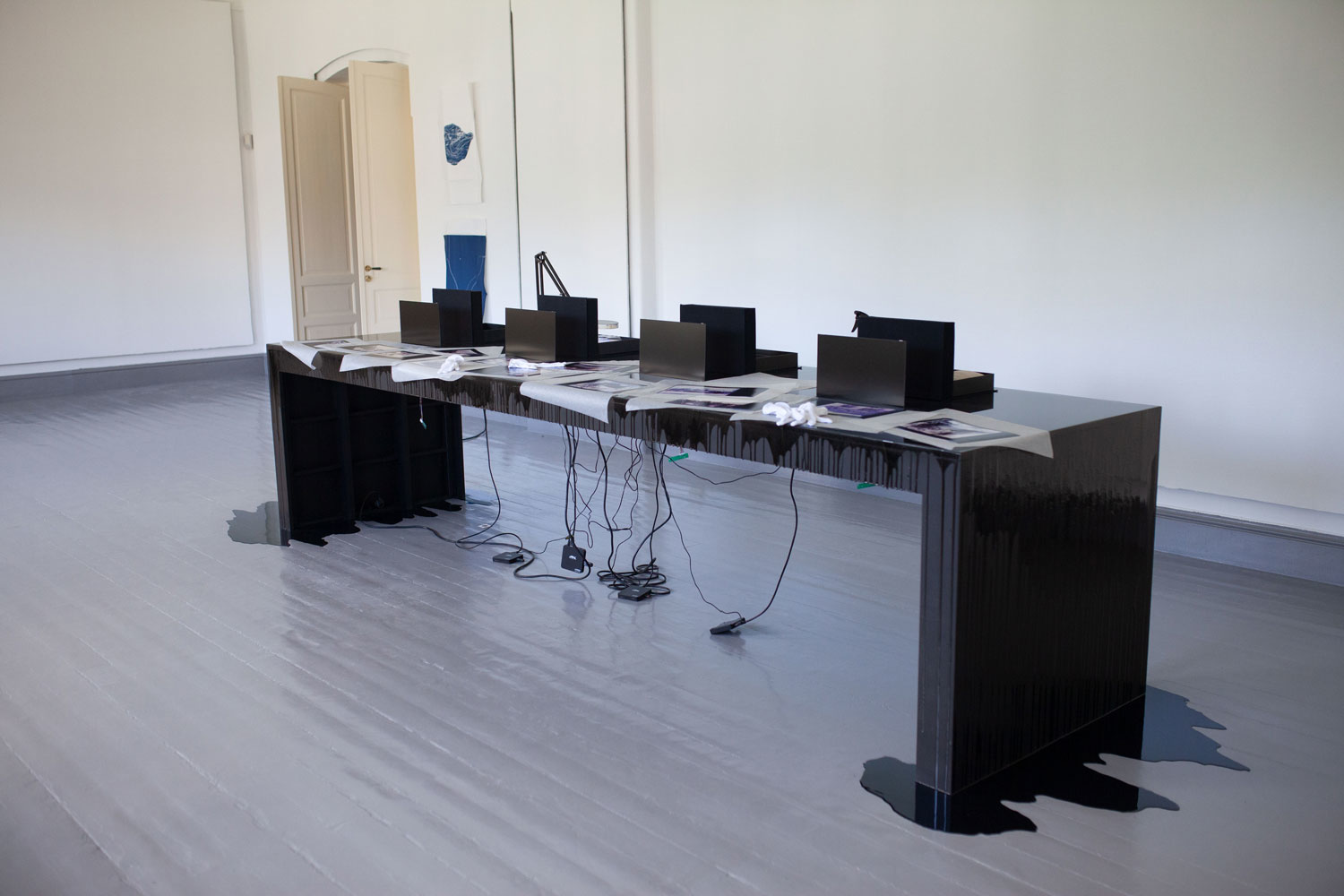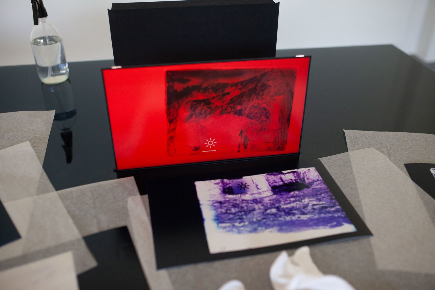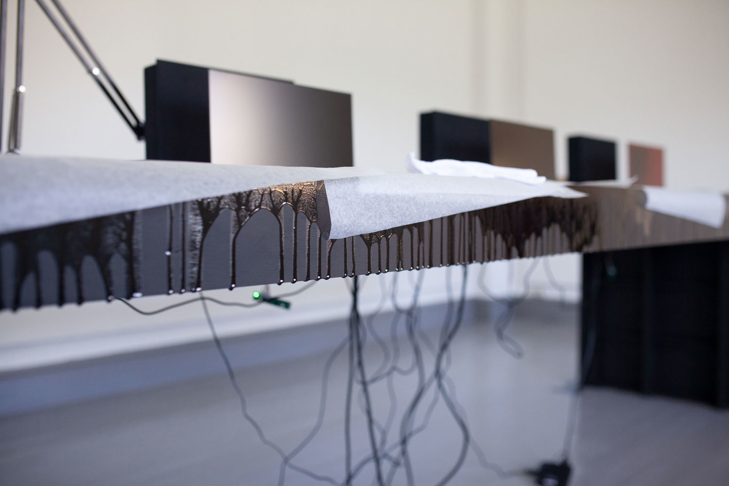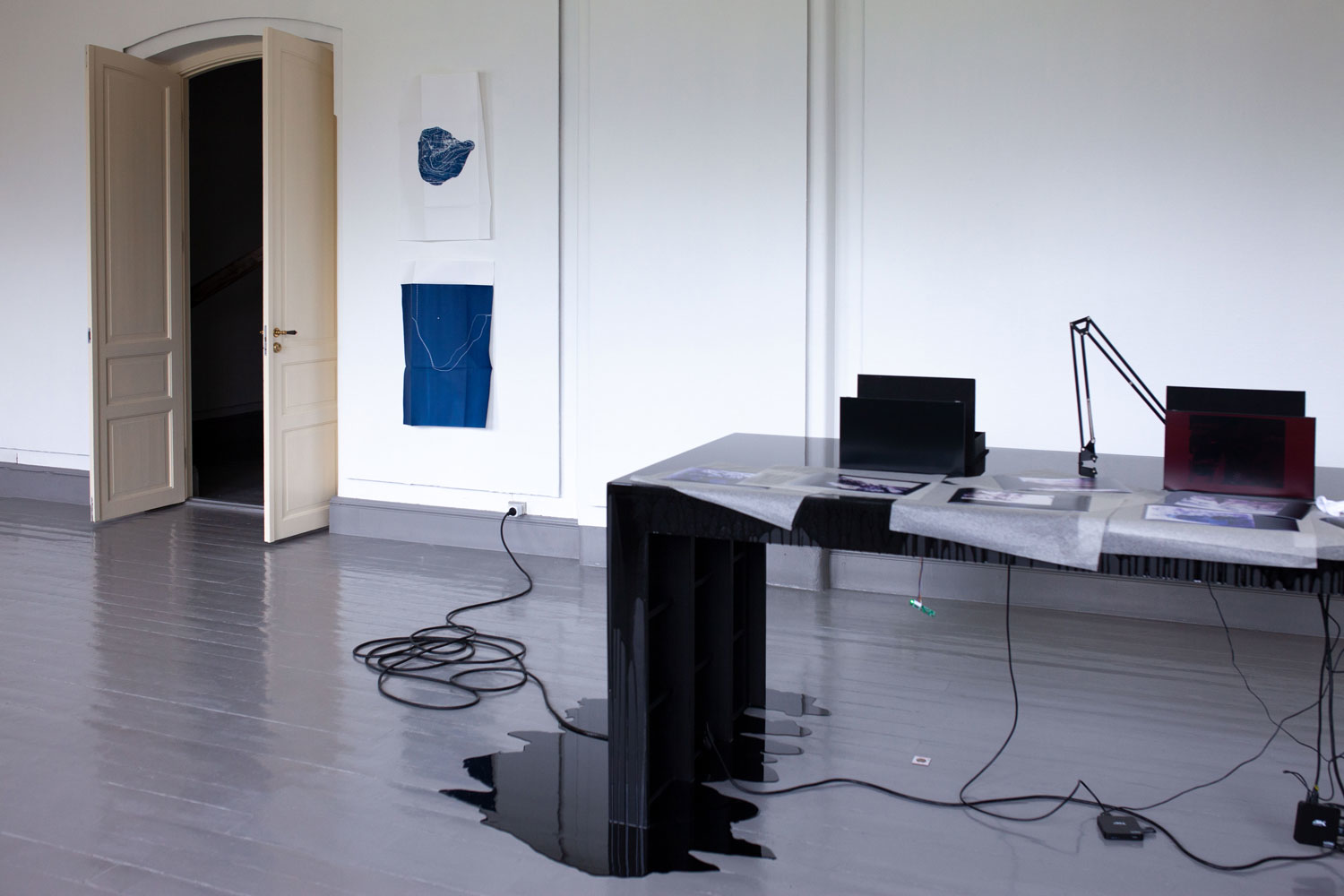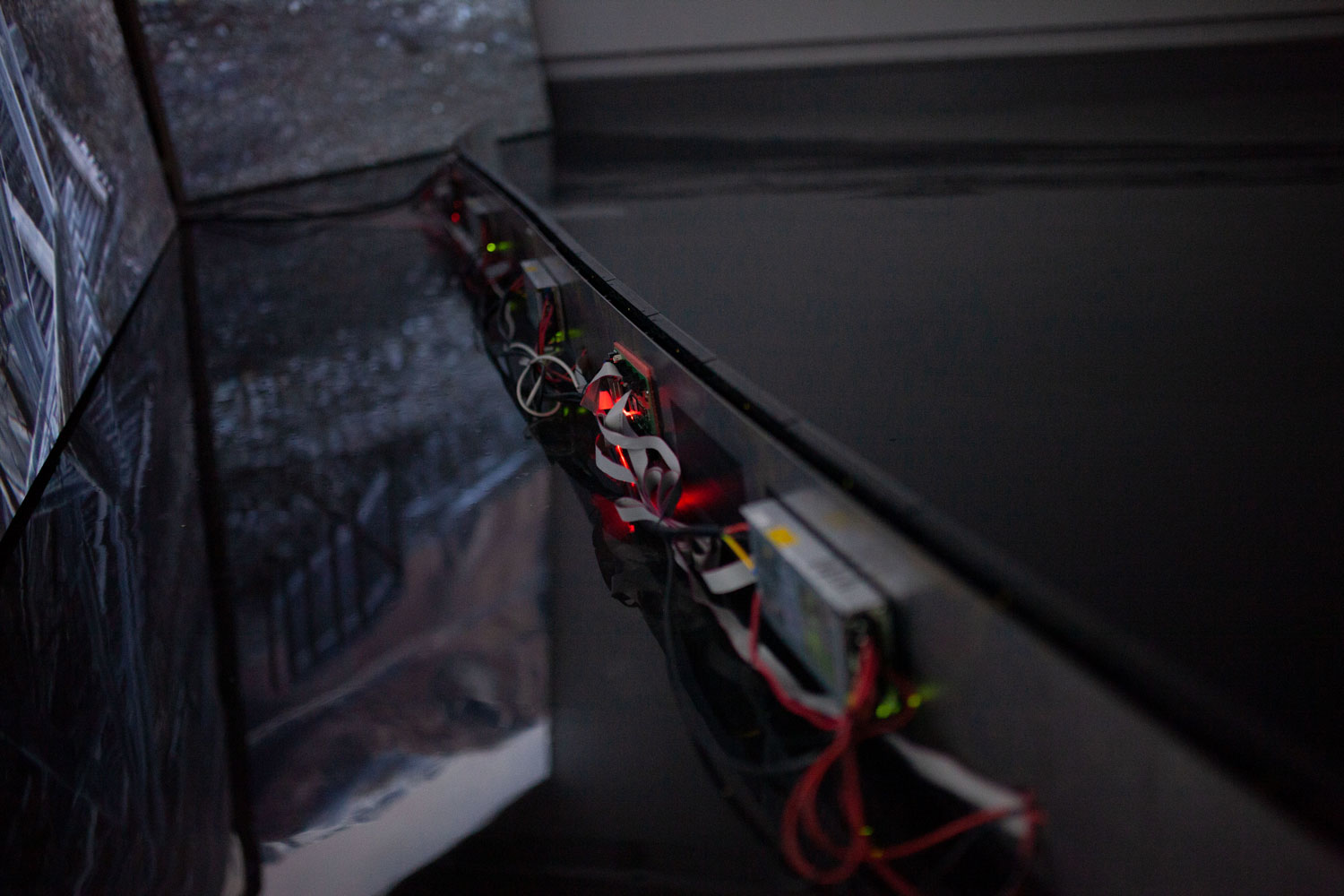 plywood, epoxy, LCD screens, cables, 14 photograms, 4 archive boxes. Dimensions: 500 x 100 x 130 cm