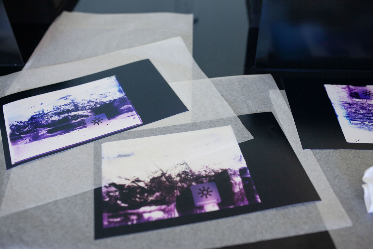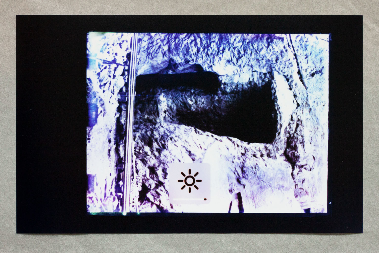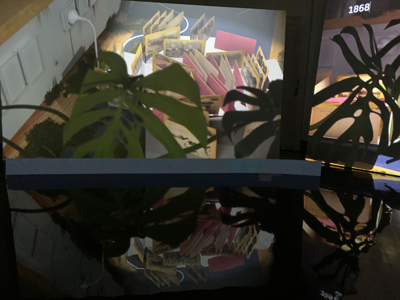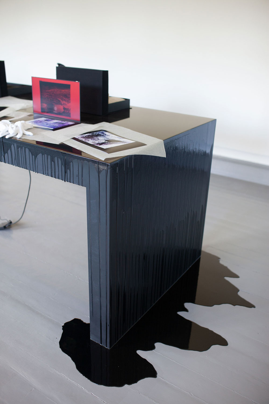 plywood, epoxy, LCD screens, cables, 14 photograms, 4 archive boxes. Dimensions: 500 x 100 x 130 cm