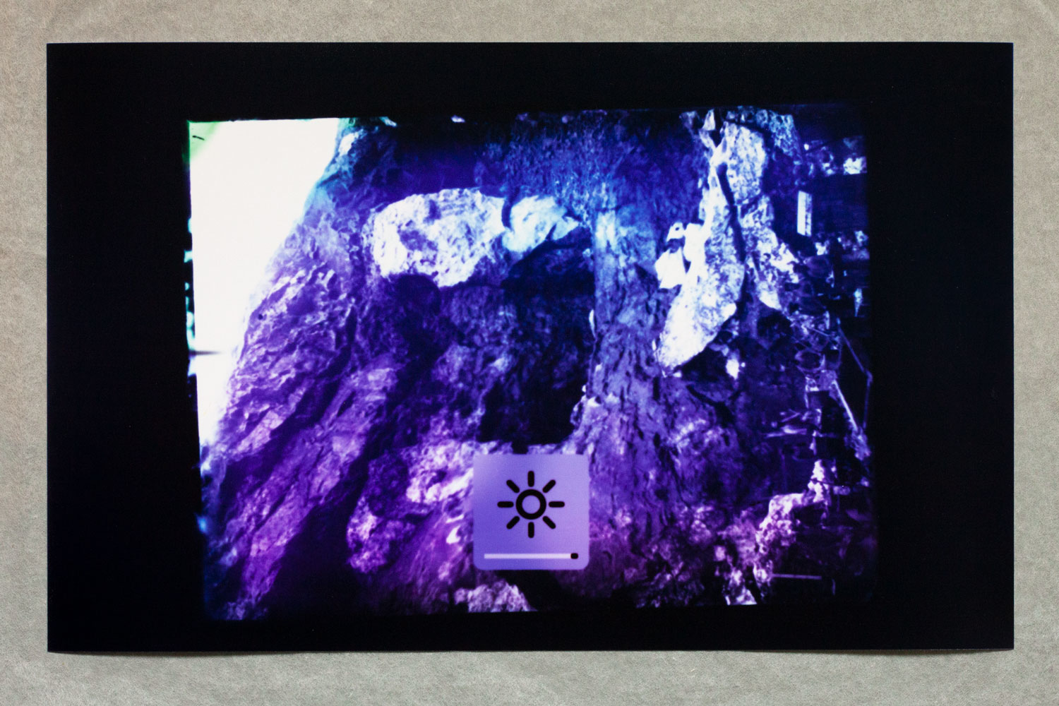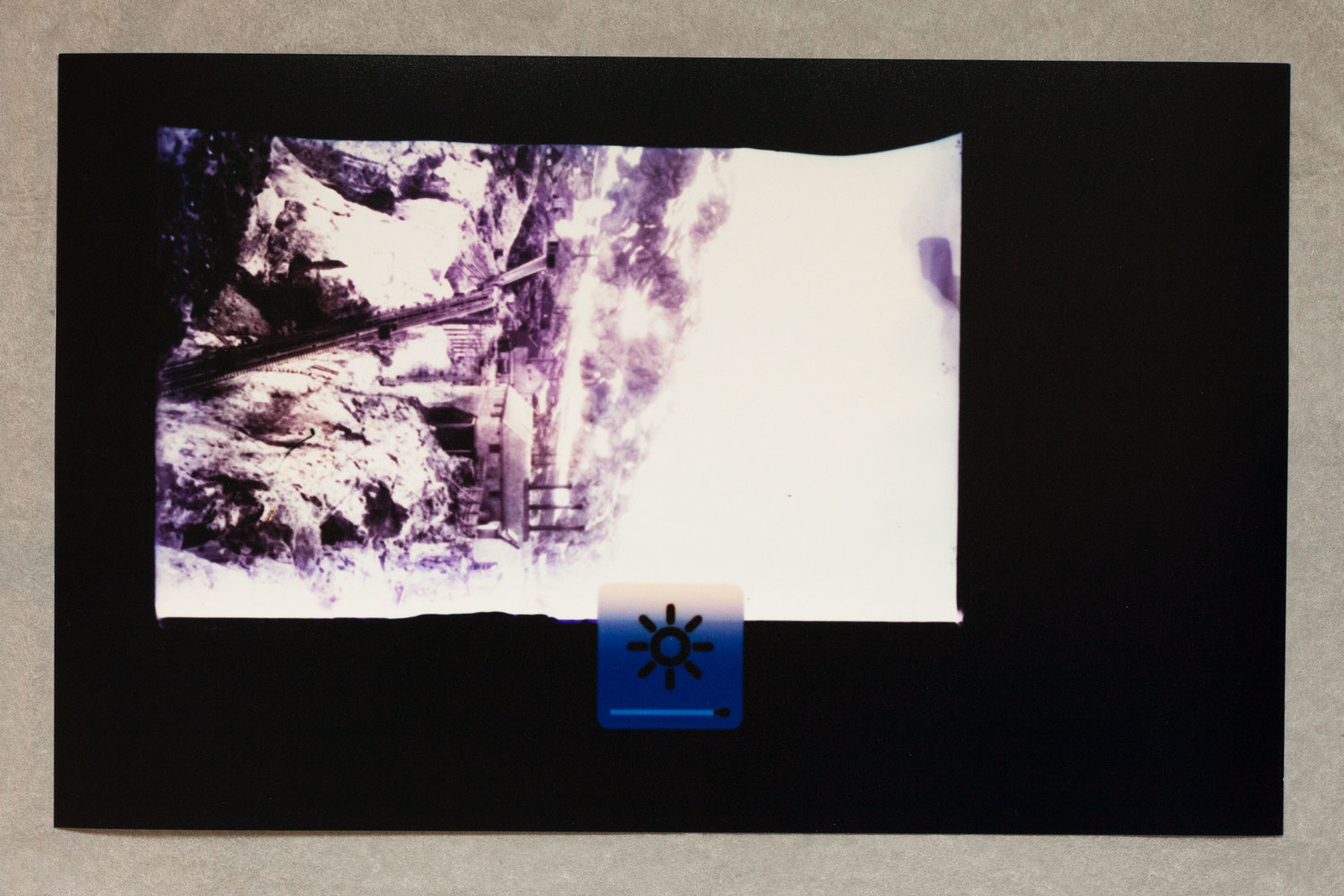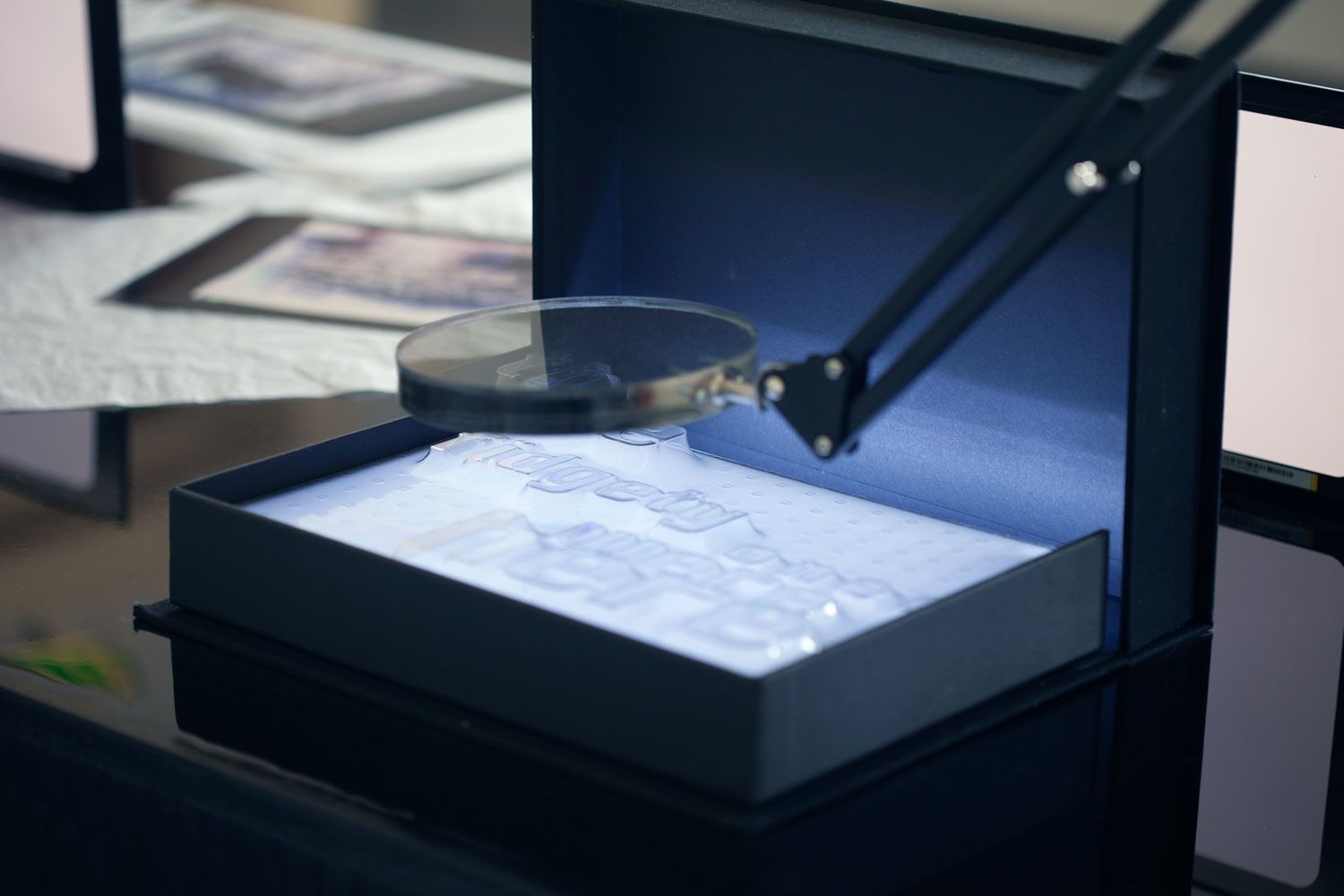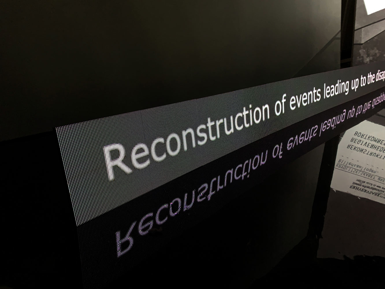 plywood, epoxy, LCD screens, cables, 14 photograms, 4 archive boxes. Dimensions: 500 x 100 x 130 cm