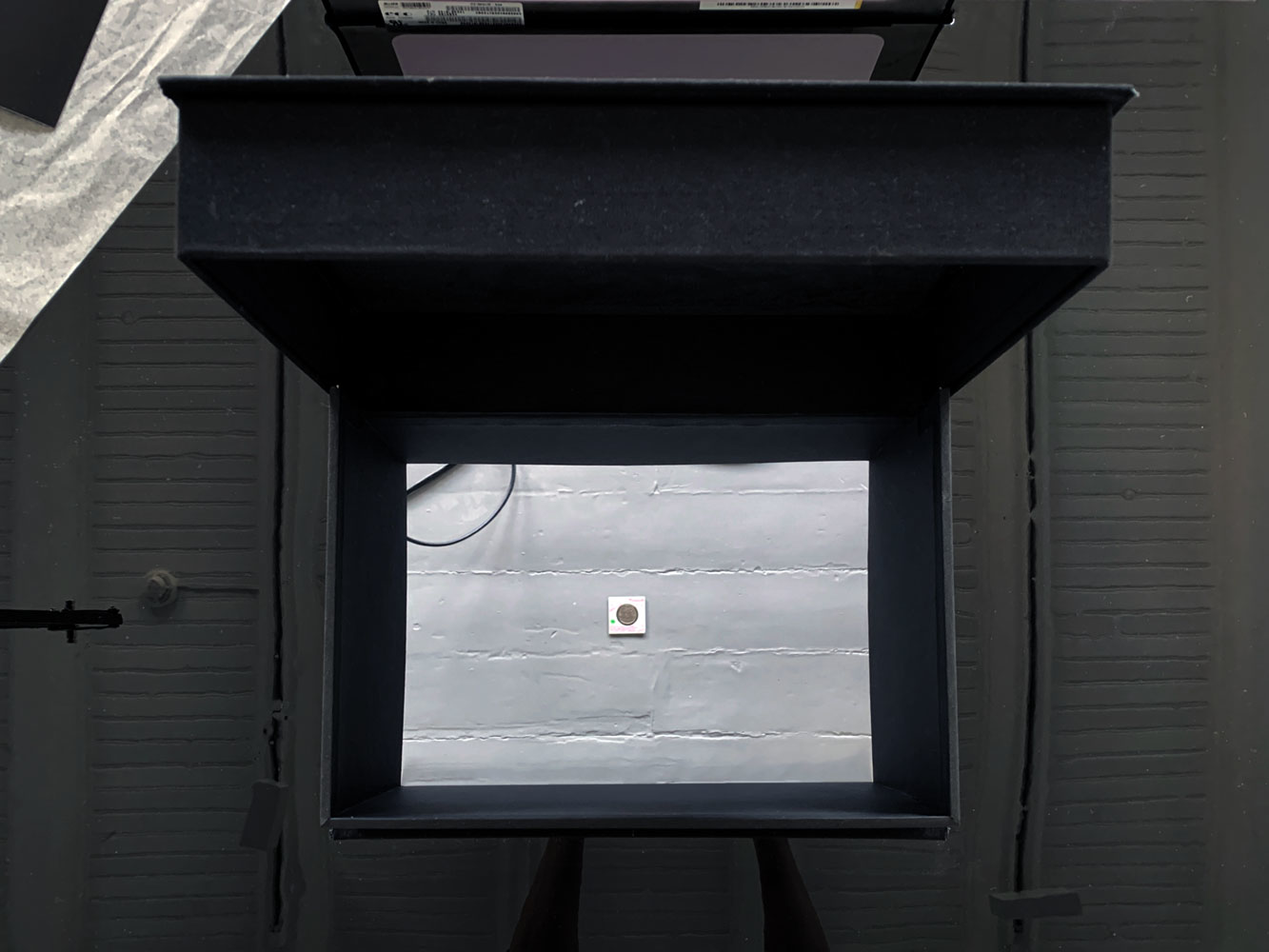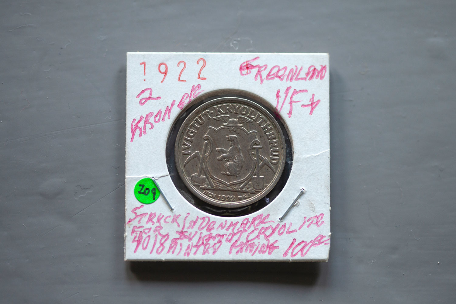 Seawhite archival box w. hole and first Greenlandic currency by Kryolith, Mine- og handels- Selskabet, purchased on Ebay, USA. Dimensions: 35 x 25 x 115 cm