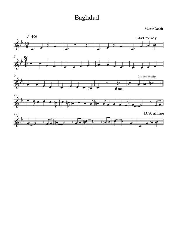 The jurjina rhythm is a very fun and challenging rhythm. It is again in 10/8, but fast, so even though the subdivision is the same as in the Samaii (3-2-2-3), it has a very different feel to it. A nice song that uses the jurjina rhythm is Baghdad by Munir Bashir. I like how the melody is almost exclusively rhythmically built from the subdivision, except for some jumps in the B part (bar 13). The phrasing of the song took some getting used to me. It felt as if the phrases don’t all land on the first beat of the bar, but they do.